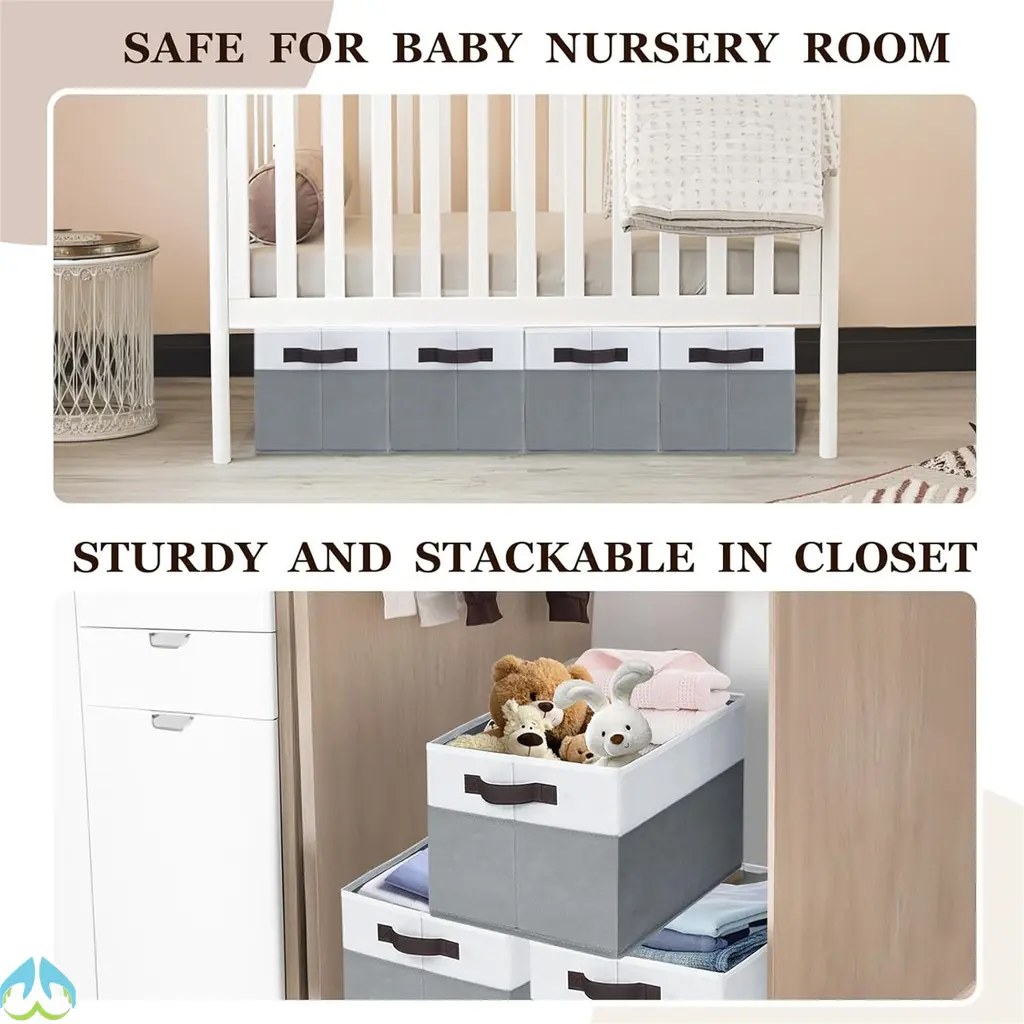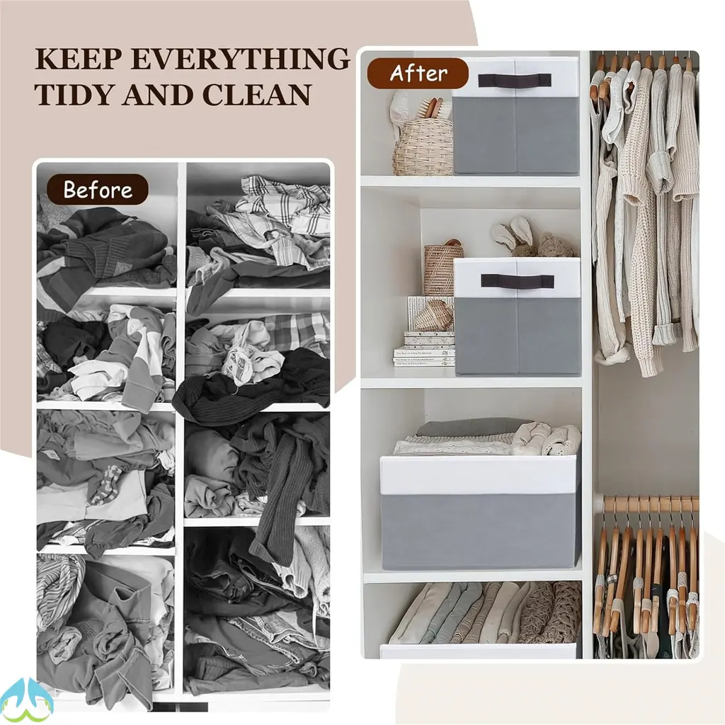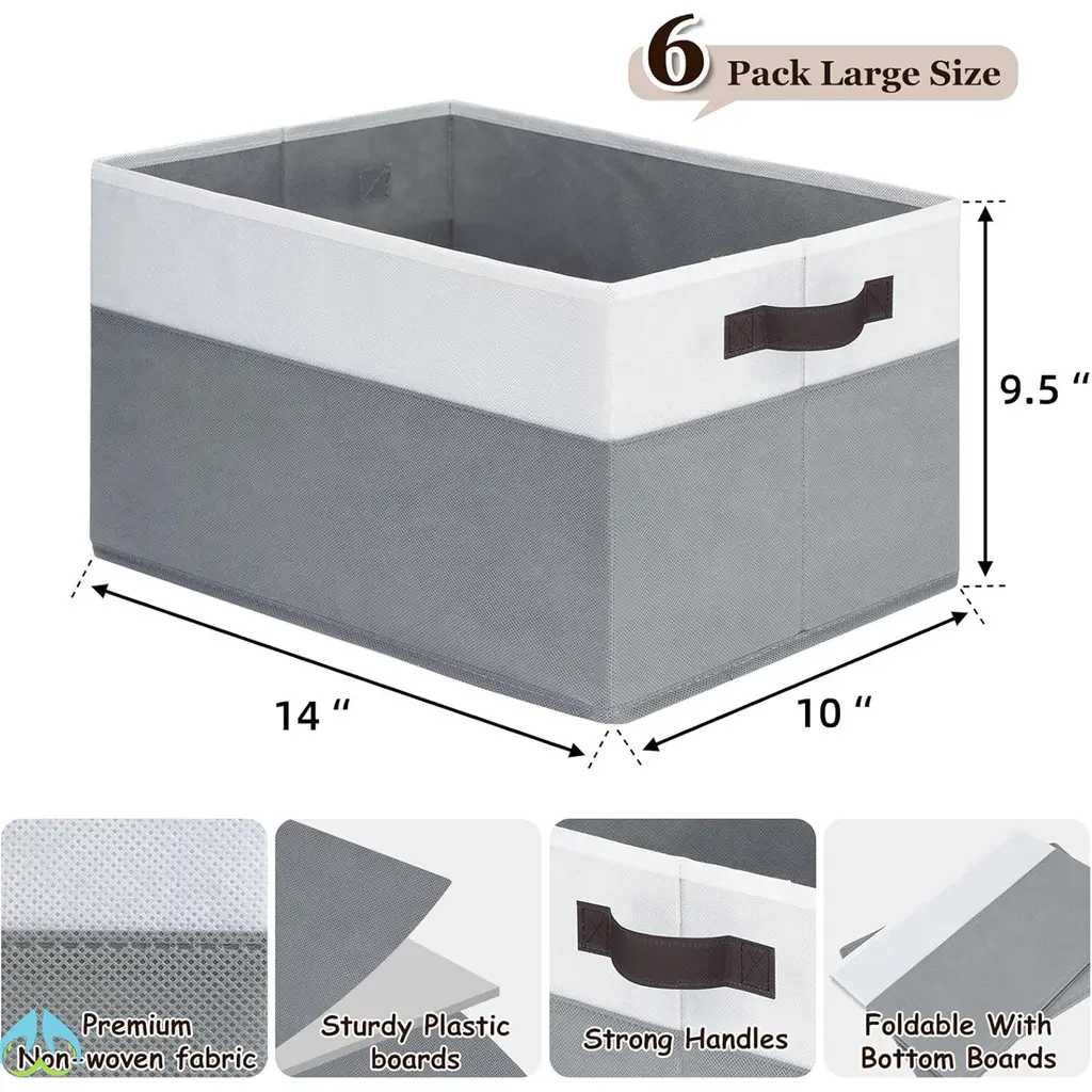 MULTIPURPOSE:Our 6 Piece Closet Storage Bins are a home essential for saving storage space and keeping everything organized. The baskets are large enough to organize clothes, children's toys, nursery items, extra sheets, clothing, towels, linens, pantry and more. STYLISH AND DECORATIVE: Two-tone design with 2 brown handles is not only a fabric organizer, but also a statement piece that reflects your unique taste and pursuit of quality life. Bring a sense of order, sophistication and warmth to your living room, bedroom, bathroom, office, nursery, laundry room and more. EXTRALARG ECAPACITY: These fabric storage bins will meet all your all of your family's storage needs, as well as for college dorms, RVs, schools, and nurseries. They can be used as shelf storage baskets, closet storage, bookshelf storage, underbed storage or diaper changing tables. PREMIUMQU ALITY:All of the sides and bottoms of these storage bins are made of tough plastic sheets, so these bins will remain sturdy for years to come, are stackable, and are odor free in confined spaces. Durable non-woven fabric ensures that these storage baskets are built to last. The storage baskets have two carry handles sewn in for easy gripping and carrying.