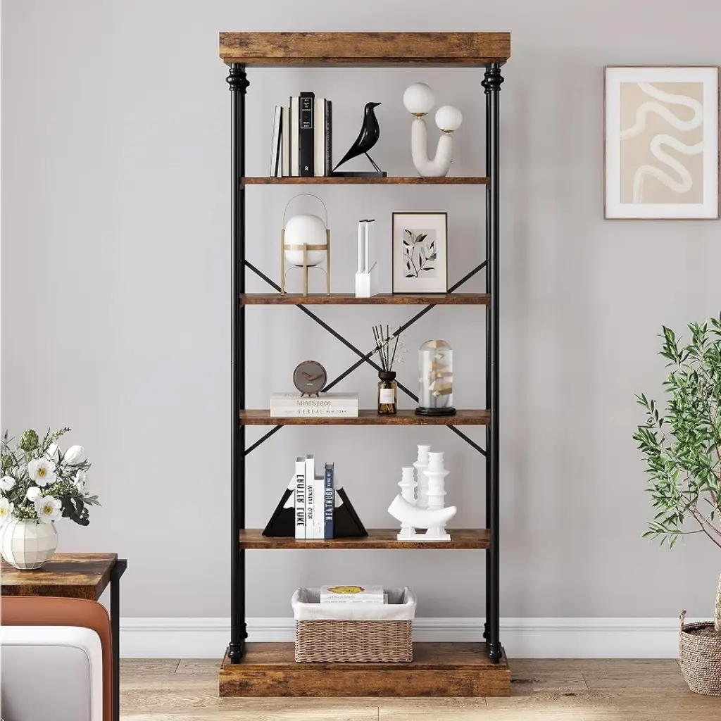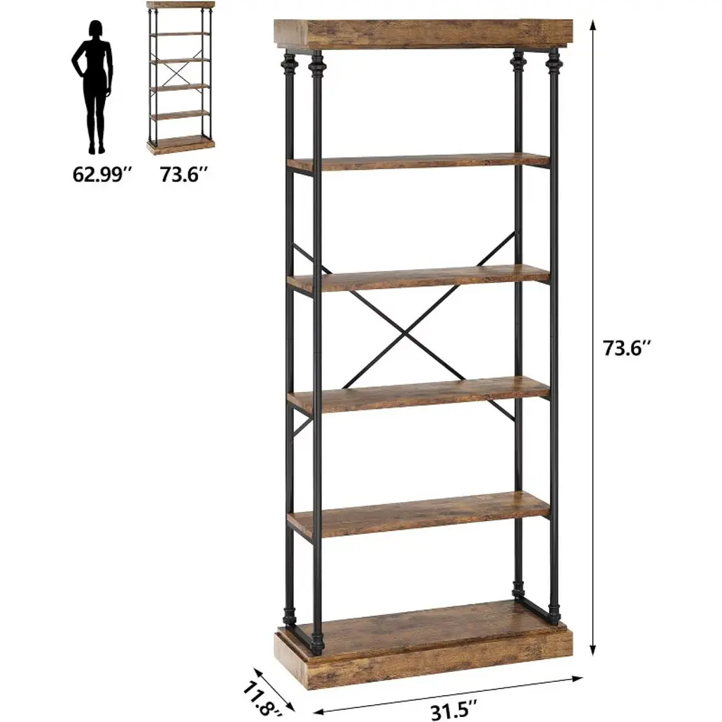 This industrial bookshelf is ideal for home space with its stable and durable with vintage and elegant design. Featuring high-density MDF boards, solid wood base and fine metal frame, it has excellent load-bearing capacity and durability, thickened Roman tubes, sturdy X-shaped supports and anti-tip strap design further enhance the safety and stability of the bookcase, and it can hold up to 50lbs per shelf. Adjustable legs are designed to not only keep the bookshelf level on uneven floors, but also protect the floor from scratches, providing you with peace of mind. The combination of natural wood grain veneer panels and thickened Roman column tubes shows elegant lines and superb craftsmanship details, deliberately presenting a vintage ornate style and creating a stylish and luxurious atmosphere. The six spacious tiers of storage space measure 73.6 inches (H) x 31.5 inches (L) x 11.8 inches (W), with each tier spaced 12.99 inches apart, maximizing the use of vertical space to meet all daily needs, making it an ideal choice for small homes. Wooden bookshelf is not only suitable for study room, but also can be used as an open collectible display shelf in living room, spice storage shelf in kitchen, or even for spaces such as bedroom, home office, hallway or balcony. Equipped with detailed illustrated instructions and necessary accessories, the bookshelf is quick and easy to assemble, even for novices. The smooth, water-resistant surface is designed to stay clean and fresh with a damp cloth, making daily cleaning a breeze.