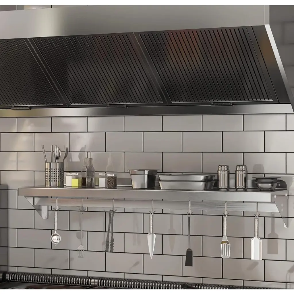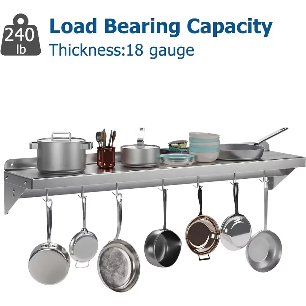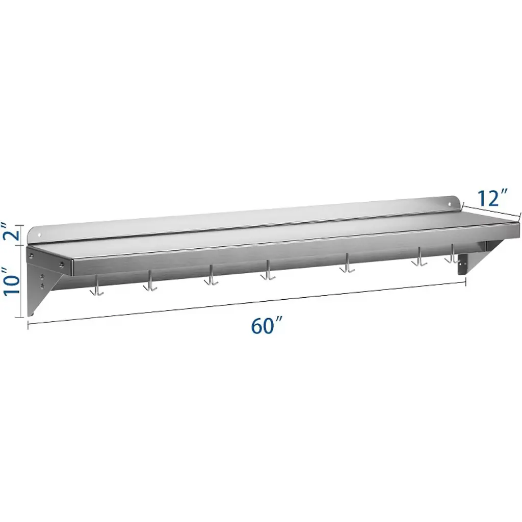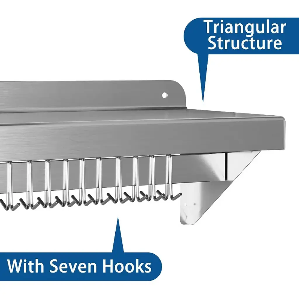 Introducing the Stainless Steel Shelf, NSF Commercial Shelf Wall Mounted – the ultimate storage solution for your restaurant, kitchen, home, or hotel. This versatile wall shelf is designed to enhance your space with its sleek, functional design and superior durability. Heavy-Duty Support: Crafted from premium stainless steel, this floating shelf offers robust support, ensuring your kitchen essentials are securely stored. Whether it's pots, pans, or other cookware, this shelf is built to hold it all. Efficient Space Utilization: Measuring 24 x 12 inches, this flat surface shelf provides ample storage space, optimizing your kitchen organization. With its compact design, it efficiently utilizes wall space, freeing up valuable counter and cabinet areas. Enhanced Organization: Equipped with 7 sturdy hooks, this wall-mounted shelf allows for easy access and efficient storage of your kitchen tools, keeping your space clutter-free and organized. Superior Material Quality: Made from high-quality stainless steel, this shelf is not only durable but also resistant to rust and corrosion, ensuring long-lasting use in any environment. Versatile Application: Perfect for a variety of settings, this wall shelf is ideal for use in restaurants, kitchens, homes, hotels, and even garages. Its versatile design makes it a practical storage solution for any space. Easy Installation: Designed for hassle-free setup, this stainless steel wall shelf comes with all the necessary hardware for quick and convenient installation. Simply mount it on your desired wall and start organizing. Upgrade your storage solutions with this stainless steel floating shelf. Whether you're looking for a kitchen shelf, garage storage, or a stylish wall mount, this shelf meets all your needs with elegance and efficiency. Transform your space with this reliable and stylish storage rack today!