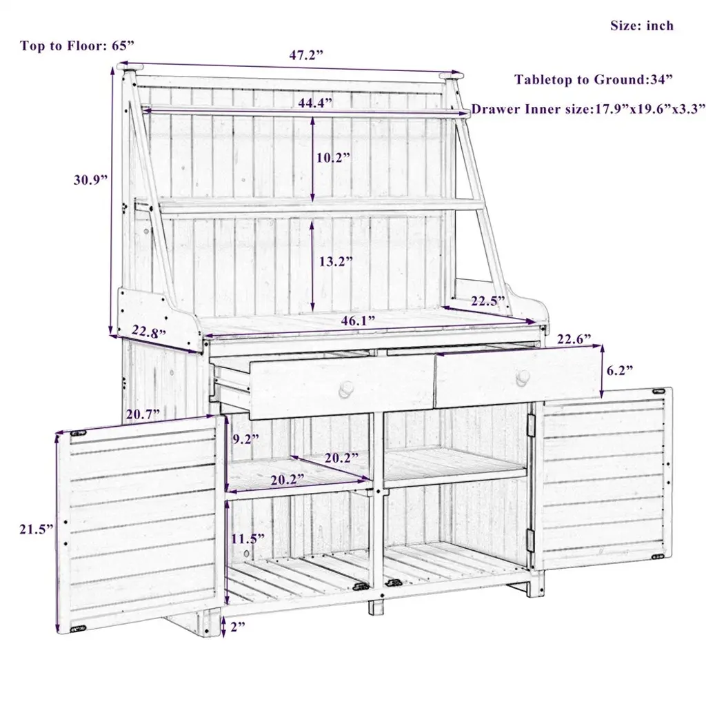 Send the potting bench to yourself or your friends who are crazy gardening lovers. Our three-tier workstation features 2 drawers and 1 cabinet that keeps your favorite gardening tools right at your fingertips. The entire bench is constructed of durable, water-resistant fir wood for years of reliable performance. Equipped with anti-falling devices, the bench is designed for better safety.Features: Durable Construction and Quality: Made of 100% fir wood and featured with two triangle bars, its strong and sturdy construction ensures more stability, even when loaded with heavy pots and garden equipment. 2 anti-falling devices fix the bench for better safety. Besides, the cabinet door is equipped with magnetic, providing a more silent and soft click while latching or closing, efficiently preventing dust and insects entering, and leading to longer lifespan.Organized Storage: The three-tier shelves is perfect to showcase your favorite plantings, flowers or place some tools on it. The table comes with two spacious drawers, one cabinet with double shelves, as it provides ample storage space to separate different types of items into specific compartments, keeping everything well-organized and within reach.Perfect Gardening Workstation: The potting table's rustic design and neutral color blend seamlessly with any outdoor space, adding a touch of warmth and functionality to your garden. The 34-inch height of the workplace is ideal for comfortable reaching and accessing to the items you need while performing garden tasks, without straining your back and shoulders.Easy to Clean and Maintain: The table's straightforward design and ease of installation make it a wonderful choice for gardeners who value convenience and practicality in their storage solutions. Regular cleaning with a damp cloth can remove dirt or debris, maintaining the cabinet's sleek appearance.Dimensions: Overall Size: 47.2 x 22.8 x 65 inch (LXWXH); Tabletop Size: 46.1x 22.5 inch (LXW); Each Drawer Inner Size: 17.9 x 19.6 x 3.3 inch (LXWXH); Overall Weight: 75.79 lbs. For more size, please refer to the size image.Weight Capacity: Upper Shelf (above tabletop): 22 lbs; Middle Shelf (above tabletop): 44 lbs; Tabletop: 88 lbs; Each Drawer: 44 lbs; Upper Shelf (cabinet): 66 lbs; Bottom Shelf (cabinet): 88 lbs.Material: Fir WoodMaintenance and Notice: Assembly: Please read assemble manual in advance. Please do not over-tighten nuts, as this may cause distortion or breakage.Color: Items may slightly differ from photo in terms of color due to the lighting or your monitor's display.Size: Manual measurement has been used, there may be some reasonable error.