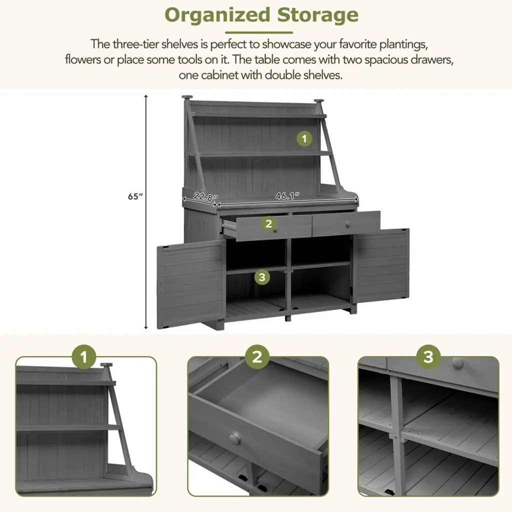[Durable Construction and Quality] Made of 100% fir wood and featured with two triangle bars, its strong and sturdy construction ensures more stability, even when loaded with heavy pots and garden equipment. 2 anti-falling devices fix the bench for better safety. Besides, the cabinet door is equipped with magnetic, providing a more silent and soft click while latching or closing, efficiently preventing dust and insects entering, and leading to longer lifespan for[Organized Storage] The three-tier shelves is perfect to showcase your favorite plantings, flowers or place some tools on it. The table comes with two spacious drawers, one cabinet with double shelves, as it provides ample storage space to separate different types of items into specific compartments, keeping everything well-organized and within reach.[Perfect Gardening Workstation] The potting table's rustic design and neutral color blend seamlessly with any outdoor space, adding a touch of warmth and functionality to your garden. The 34-inch height of the workplace is ideal for comfortable reaching and accessing to the items you need while performing garden tasks, without straining your back and shoulders.[Easy to Clean and Maintain] The table's straightforward design and ease of installation make it a wonderful choice for gardeners who value convenience and practicality in their storage solutions. Regular cleaning with a damp cloth can remove dirt or debris, maintaining the cabinet's sleek appearance. SpecificationsOverall Product Dimension Overall: 47.2x22.8x65 inch (LXWXH) Tabletop: 46.1x22.5 inch (LXW) Each drawer inner size: 17.9x19.6x3.3 inch (LXWXH)Overall Weight:75.79lbs.Weight Capacity Upper Shelf (above tabletop): 22 lbs Middle Shelf (above tabletop): 44 lbs Tabletop: 88 lbs Each Drawer: 44 lbs Upper Shelf (cabinet): 66 lbs Bottom Shelf (cabinet): 88 lbsMaterial:Fir WoodPieces Included:1 Potting BenchColor:BrownAssembly Required:YesAdditional Tools Required:All Tools Included