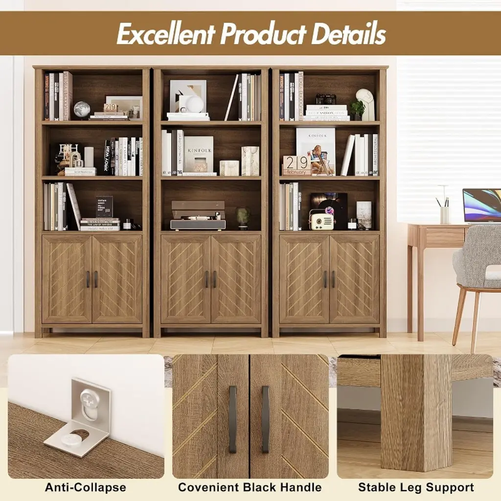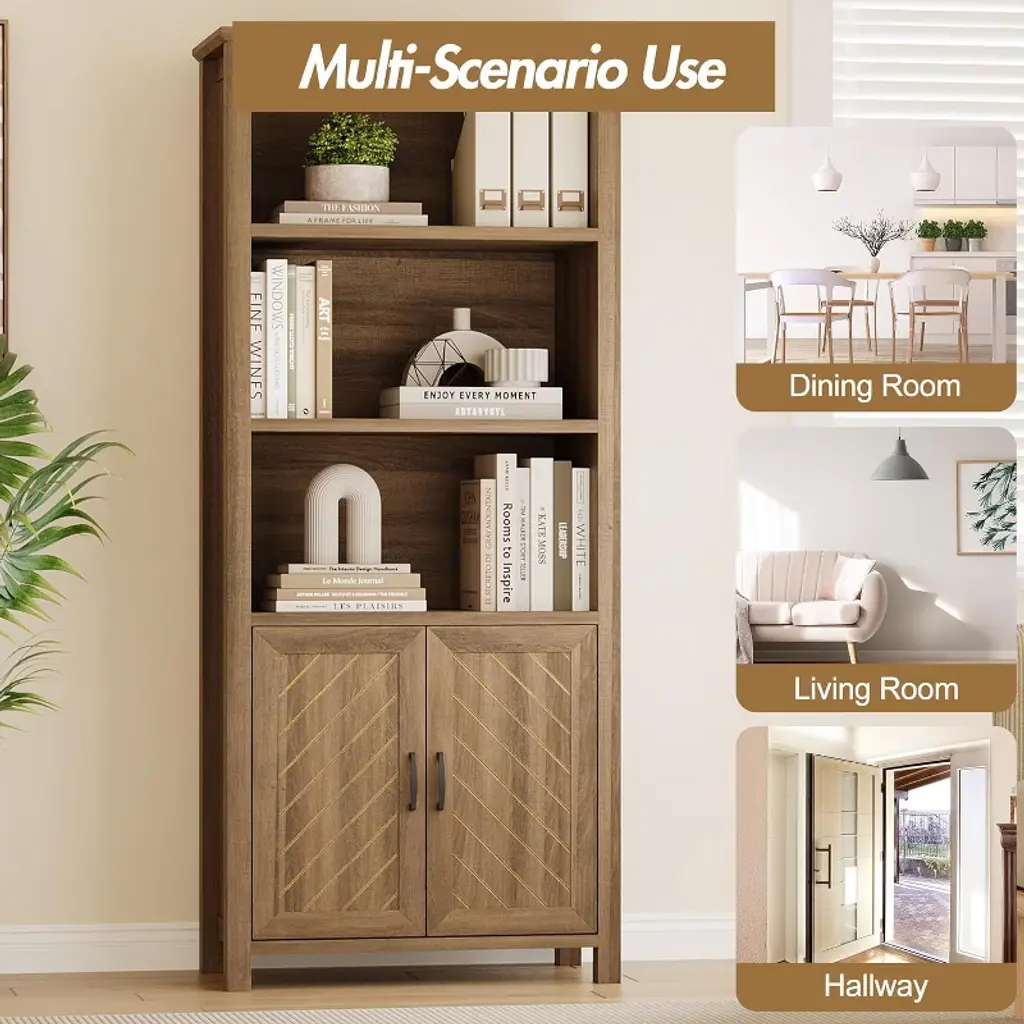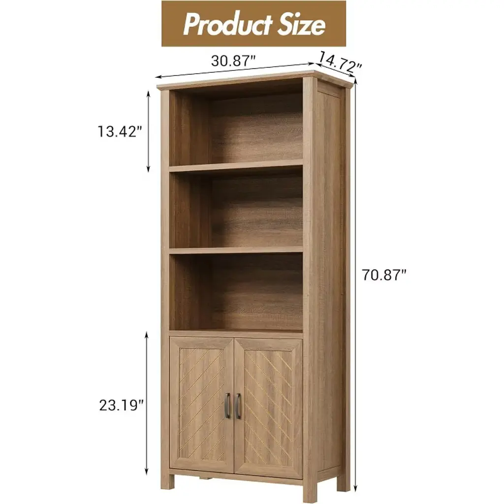 Ideal for home living with its spacious storage and elegant design, this farmhouse style bookcase offers three tiers of open shelves for displaying books and decorative items, paired with double cabinets for hidden storage, perfect for keeping your living room, bedroom, or home office neat and organised, functional and stylish at the same time. Made from high quality engineered wood to ensure durability, the bookcase is equipped with an anti-tip device to enhance stability and keep items safe and secure even when the shelves are fully loaded, providing you with peace of mind. The bottom cabinet is equipped with adjustable shelves, allowing you to flexibly adjust the space according to your needs, adapting to different sizes of books or items to meet changing storage needs, providing efficient organisation and convenient management. The unique V-shaped design adds a touch of sophistication and glamour to the bookcase, enhancing its farmhouse style appeal, and the stylish appearance matches seamlessly with a variety of decorative styles, making it the highlight of any room. The assembly process is simple and convenient, with detailed instructions included in the package, each component is clearly labelled, guiding you through the installation with ease and ensuring a smooth and stress-free experience, allowing you to quickly take possession of this beautiful and practical new bookcase and enjoy the dual experience of efficiency and convenience. Whether for storage, display or decoration, this bookcase offers the perfect combination of practicality and aesthetics, making it an ideal choice for home life.