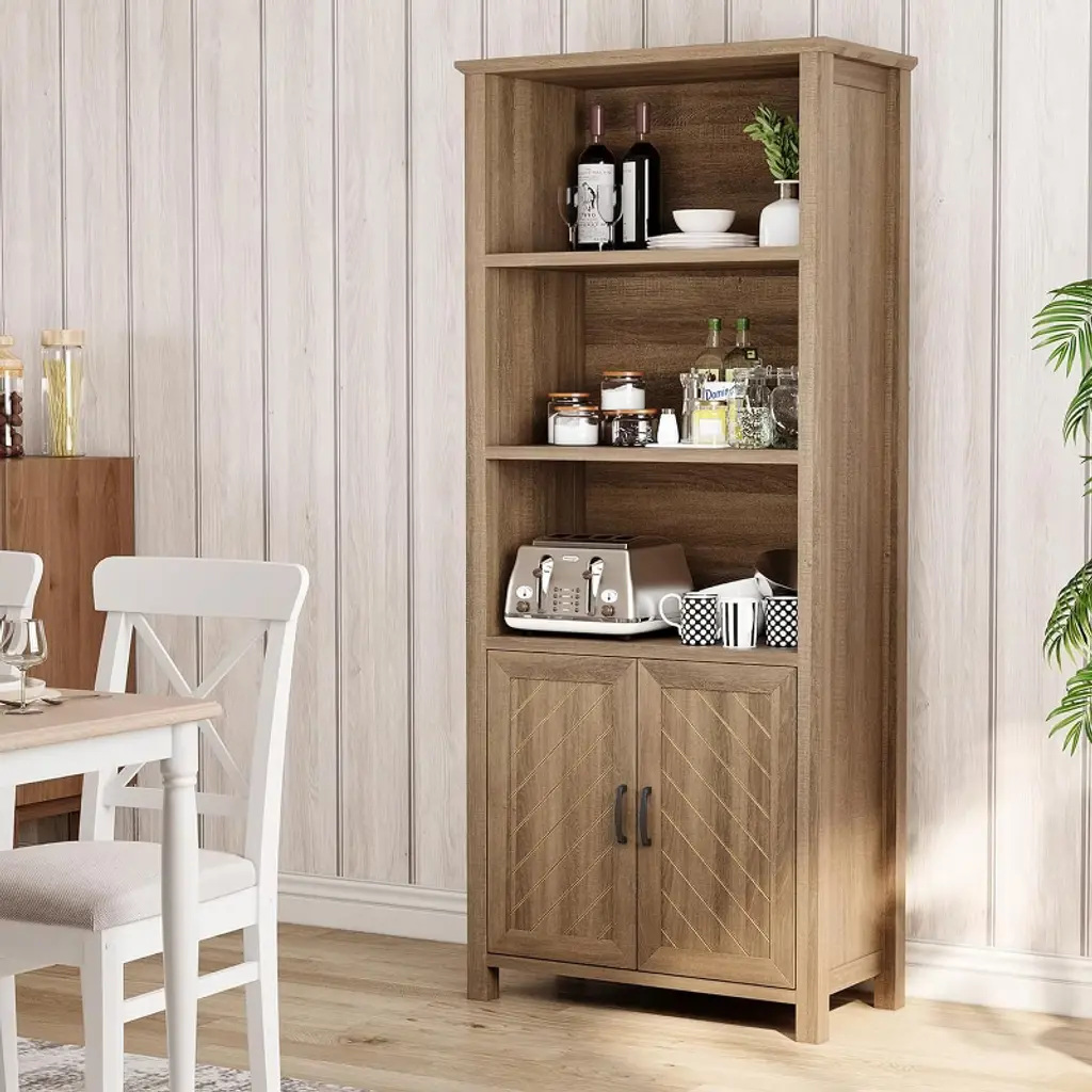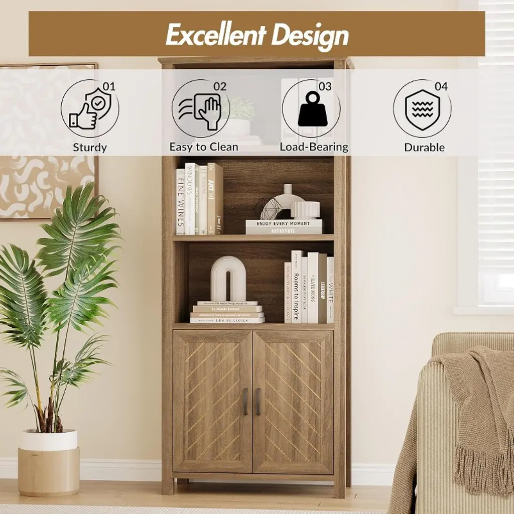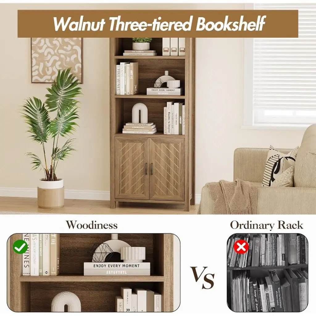 Ideal for home living with its spacious storage and elegant design, this farmhouse style bookcase offers three tiers of open shelves for displaying books and decorative items, paired with double cabinets for hidden storage, perfect for keeping your living room, bedroom, or home office neat and organised, functional and stylish at the same time. Made from high quality engineered wood to ensure durability, the bookcase is equipped with an anti-tip device to enhance stability and keep items safe and secure even when the shelves are fully loaded, providing you with peace of mind. The bottom cabinet is equipped with adjustable shelves, allowing you to flexibly adjust the space according to your needs, adapting to different sizes of books or items to meet changing storage needs, providing efficient organisation and convenient management. The unique V-shaped design adds a touch of sophistication and glamour to the bookcase, enhancing its farmhouse style appeal, and the stylish appearance matches seamlessly with a variety of decorative styles, making it the highlight of any room. The assembly process is simple and convenient, with detailed instructions included in the package, each component is clearly labelled, guiding you through the installation with ease and ensuring a smooth and stress-free experience, allowing you to quickly take possession of this beautiful and practical new bookcase and enjoy the dual experience of efficiency and convenience. Whether for storage, display or decoration, this bookcase offers the perfect combination of practicality and aesthetics, making it an ideal choice for home life.