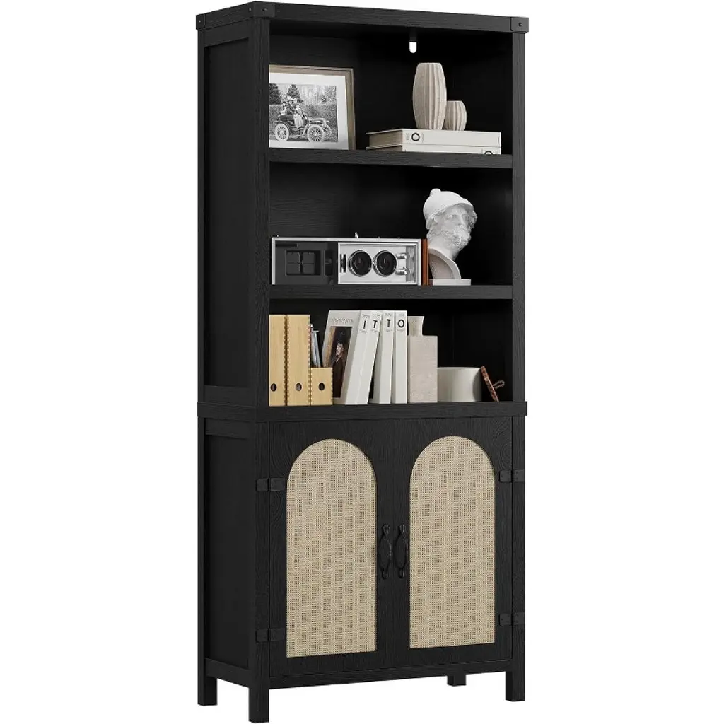 71" Rattan Boho Bookcase,5-tier Shelf W/arched Doors & 3 Adjustable Shelves - Pantry Storage Cabinet For Living Room, Home Office,kitchen
