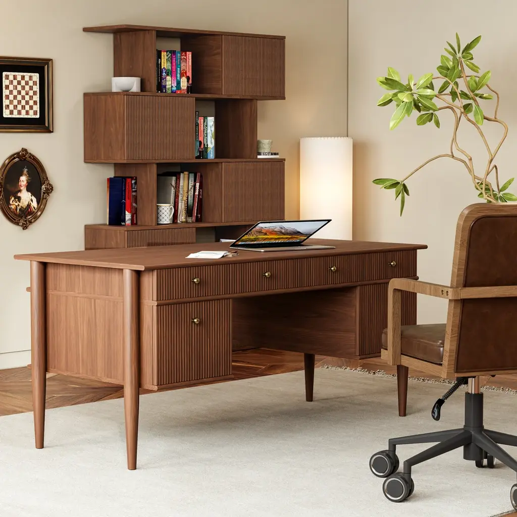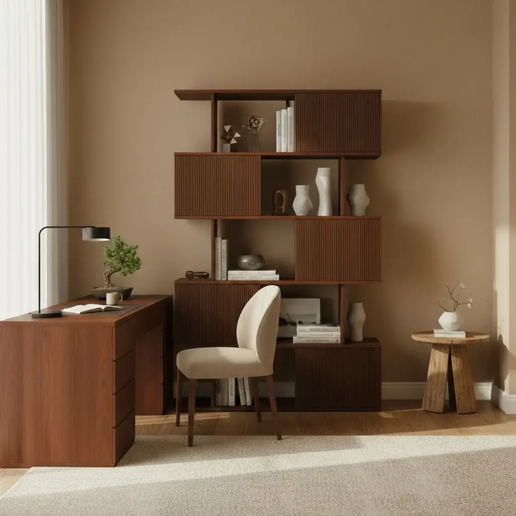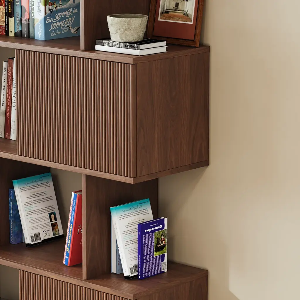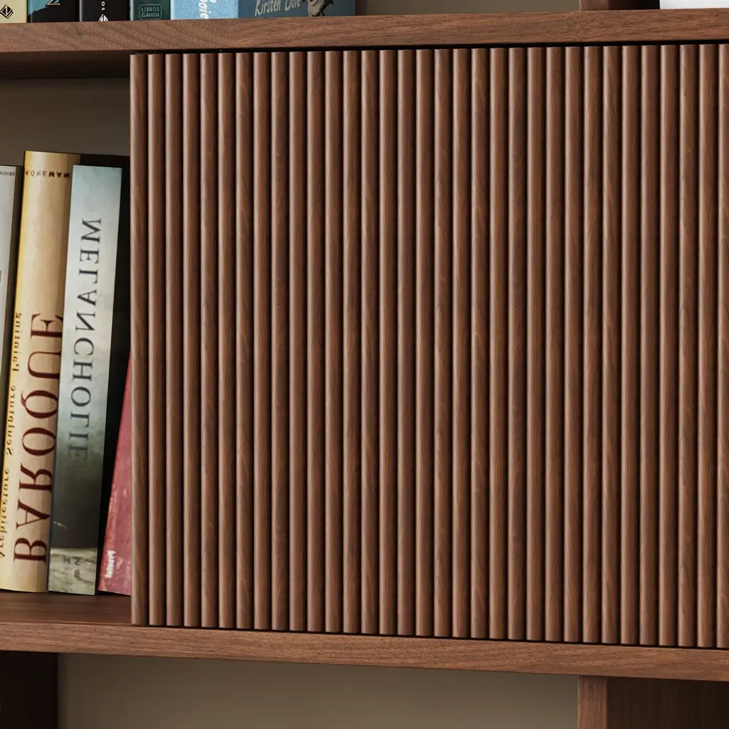 Upgrade your home with this elegant walnut veneer bookshelf, designed to maximize vertical storage without compromising style. Featuring five tiers with sliding fluted doors, it provides both open and concealed storage options. The mid-century modern design and warm walnut finish make it a perfect addition to any room, offering functionality and sophistication.