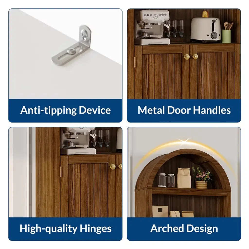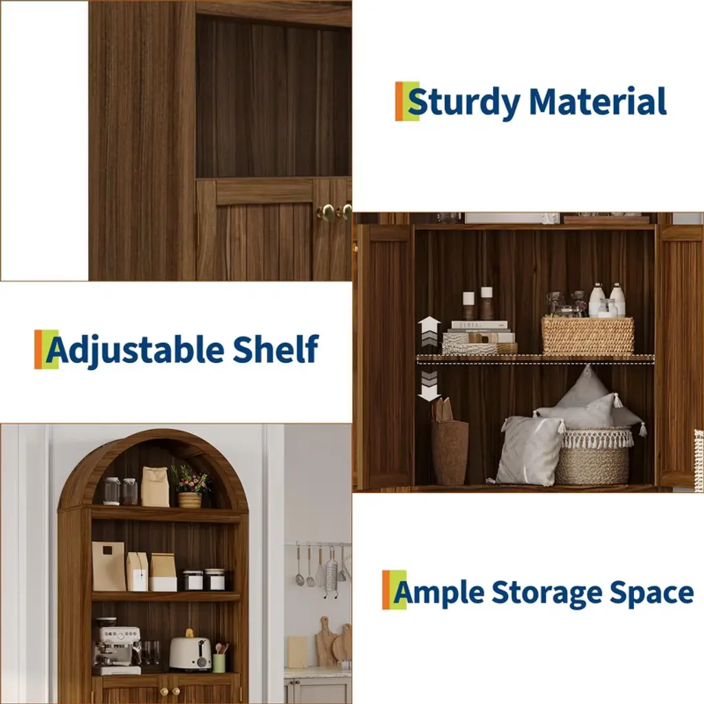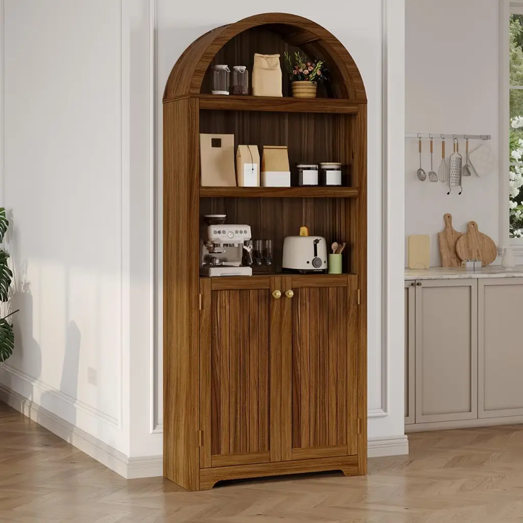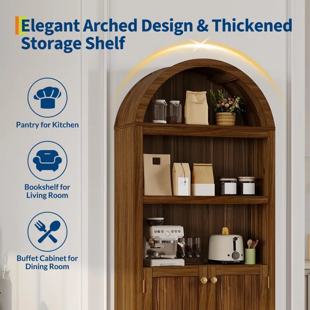 72" Tall Pantry Cabinet with Doors ¡§C 5-Tier Kitchen Storage Cabinet with Adjustable Shelves & Gold Handles, Arched Buffet Cabinet for Dining RoomBrand: TROPOWProduct Dimensions: 63.78"D x 17.13"W x 6.69"HMaterial: Durable Engineered WoodStyle: Arched Design with Doors & Open ShelvesSpecial Features:? Anti-Tipping Safety Kit Included? Floor-Mount Stability? 1 Convenient DrawerAssembly Required: Yes (All hardware & instructions included)Spacious 5-Tier Storage Solution? 2 Cabinet Compartments ¡§C Concealed storage behind elegant doors? 3 Open Shelves ¡§C Perfect for quick-access kitchen essentials? Adjustable Shelves ¡§C Customize spacing for cookware, pantry items, or decorStylish & Functional Design Elegant Arched Frame ¡§C Adds classic charm to any space Premium Gold Handles ¡§C Sophisticated finishing touch Versatile Placement ¡§C Works as a kitchen pantry, dining room buffet, or living room display Built for Safety & Durability? Anti-Tip Hardware ¡§C Secure for homes with kids/pets? Sturdy Engineered Wood ¡§C Long-lasting quality? Floor-Mounted Stability ¡§C Won't wobble or shiftEasy Assembly & Multi-Use Clear Instructions ¡§C Simple DIY setup Multi-Room Function ¡§C Perfect for kitchens, dining rooms, or entryways Ample Storage ¡§C Organize dishes, food, linens & more Why Choose TROPOW's Pantry Cabinet?? Tall 72" Design ¡§C Maximizes vertical storage? Adjustable Organization ¡§C Fits items of all sizes? Safety-First Construction ¡§C Anti-tip included? Timeless Aesthetic ¡§C Blends with farmhouse & modern decorUpgrade your storage with this functional and stylish pantry cabinet ¡§C ideal for decluttering any space!