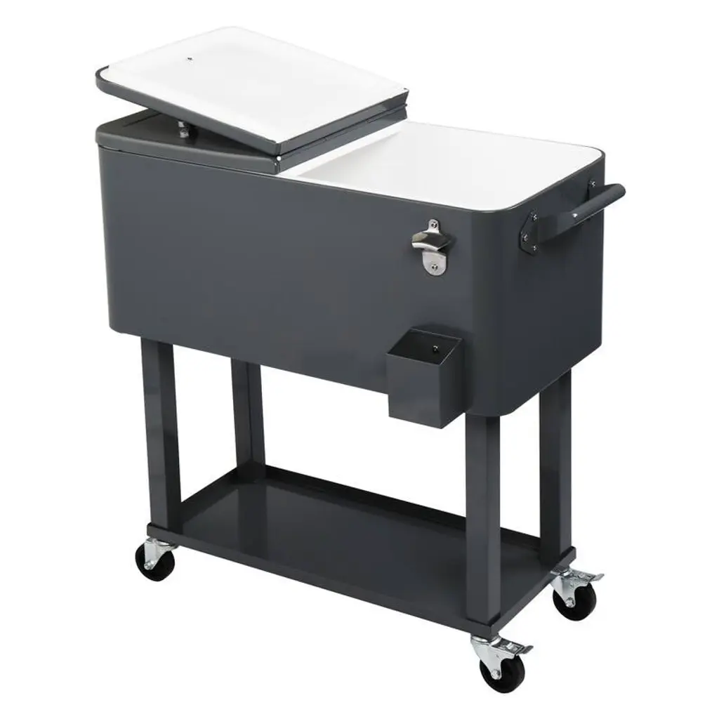 Adopting high quality iron spray material, it features stable, sturdy, durable and environment friendly. What's important, it has warm and cooling functions. It can keep the warm food above 40 ℃ for 4-5 hours and preserve cool for up to 48 hours with ice sheet. Features: . Produced by high quality iron spray material, wear resistant and environment friendly . With two directional wheels, can stop at any time . Warm function, can keep the warm food above 40 ℃ for 4-5 hours . Cooling function, cool preservation for up to 48 hours with ice sheet . Concise design and exquisite workmanship . The capacity is 80 QTSpecifications: 1. Tray: Yes 2. Lid Handle & Bottle Opener Material: 430 Stainless Steel 3. Pallet & Foot Tube Material: Iron 4. Capacity: 80QT 5. Bearing: 250 lbs 6. Weight: 42 lbs 7. Surface Type: Iron Spray PlasticPackage Includes: 1 x Rolling Cooler