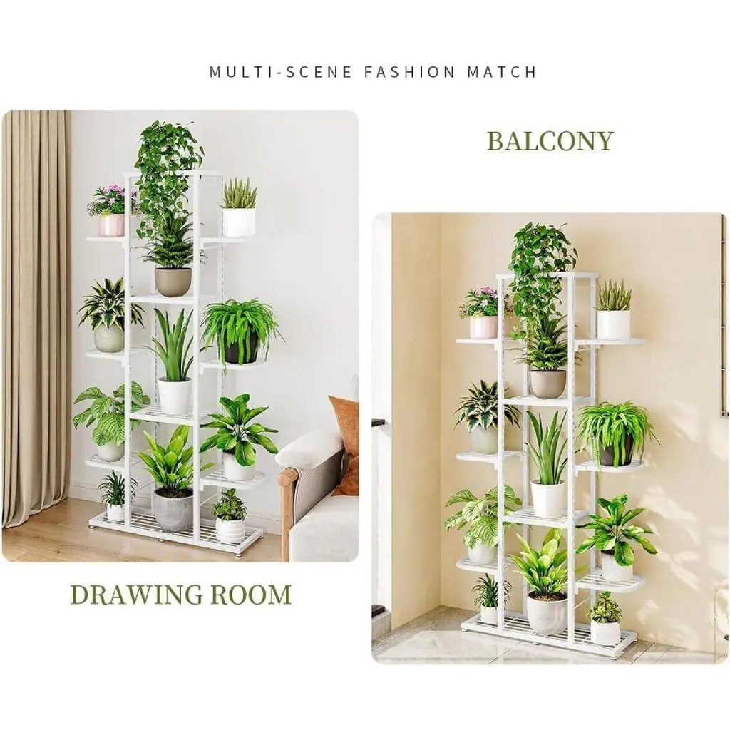 The Acekool 7-Tier Plant Stand offers an attractive and functional way to display multiple plants indoors or outdoors. Its clean white metal frame fits into corners or open spaces, enhancing your living room, balcony, or patio with a touch of greenery and organization. This stand holds up to nine pots across five staggered shelves, giving plants room to thrive and flourish. Constructed with a weather-resistant metal frame, the stand resists rust and moisture, making it suitable for both sunlit indoors and sheltered outdoor spaces. Its versatility extends beyond plants; it also works well for storing books, decorative items, or small household essentials. Measuring 34.6 inches tall, the stand is designed for convenient corner placement. Assembly is straightforward with included tools and instructions, so you can quickly create a neat, stylish display that keeps your plants healthy and your space tidy.