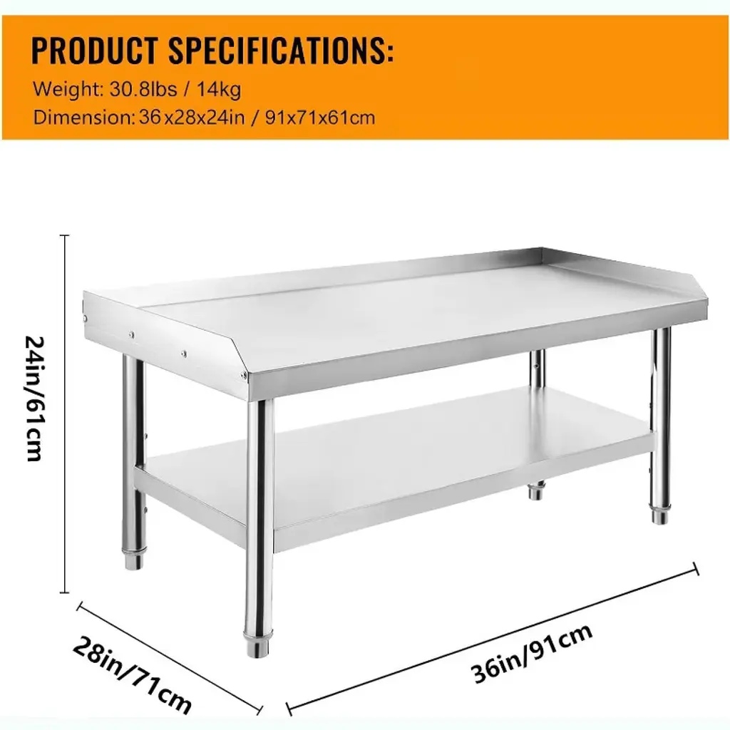 Acekool’s stainless steel equipment grill stand table is crafted for reliable, daily support in commercial kitchens, restaurants, bakeries, or grilling zones. The sturdy shelf holds appliances or cookware, while an adjustable lower shelf adds storage for pans, utensils, or ingredients. Adjustable legs keep the table steady on any surface. An edge baffle protects your equipment from slipping, and smooth, rounded edges improve safety and comfort during food prep or serving. Specifications Shelves: 2 (top and adjustable lower)Legs: Height adjustableEdge: Raised baffle on top shelf for safetyEdges: Rounded front and back for comfortEasy assembly with hardware and instructions includedUses: Kitchen, restaurant, bakery, outdoor grill, garage