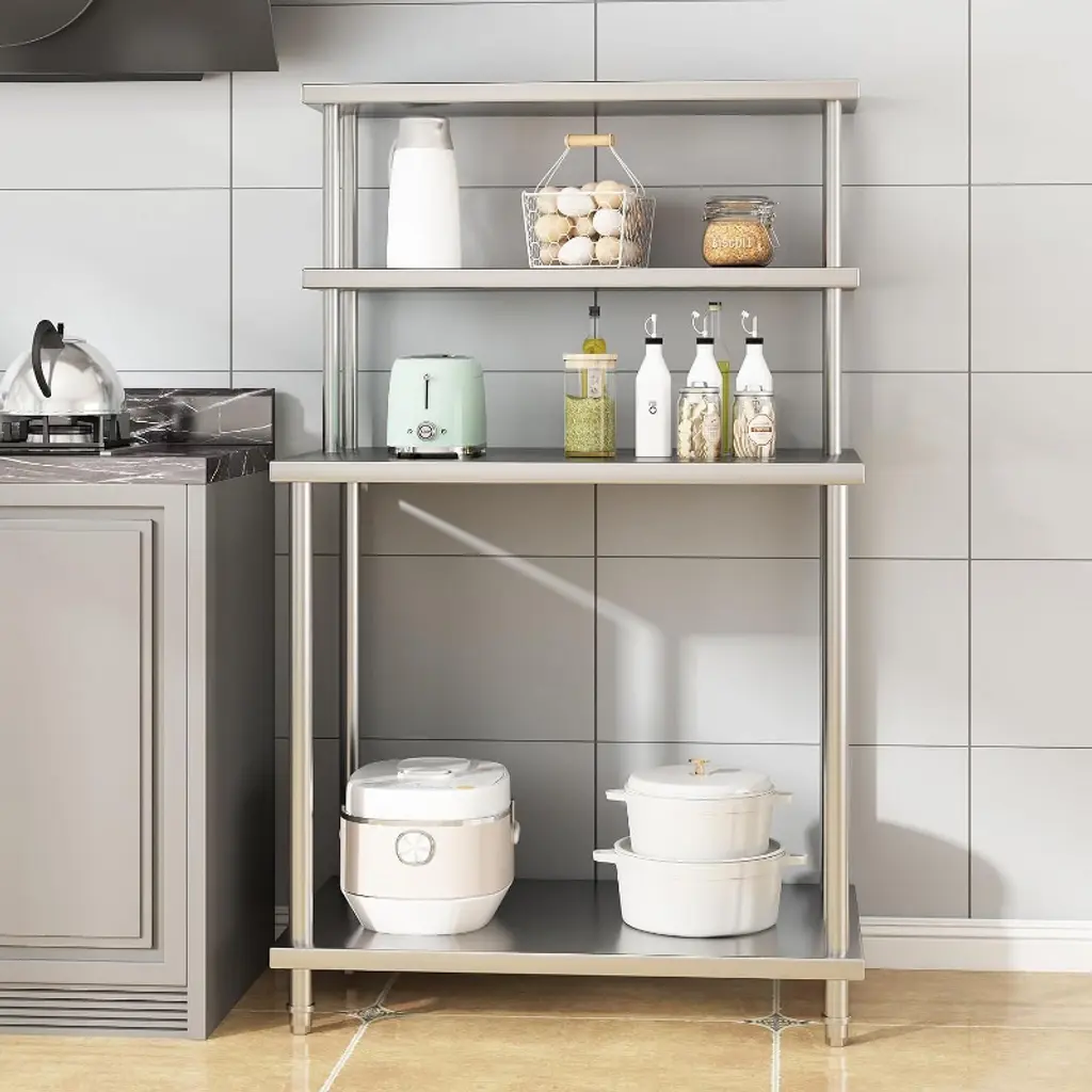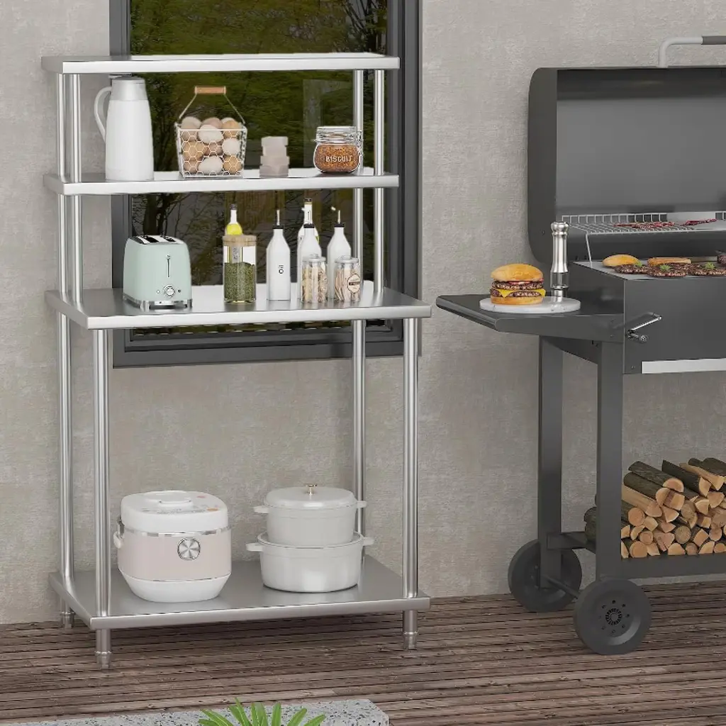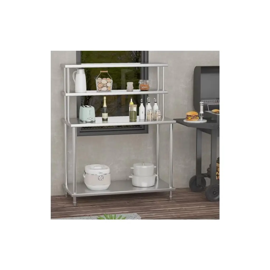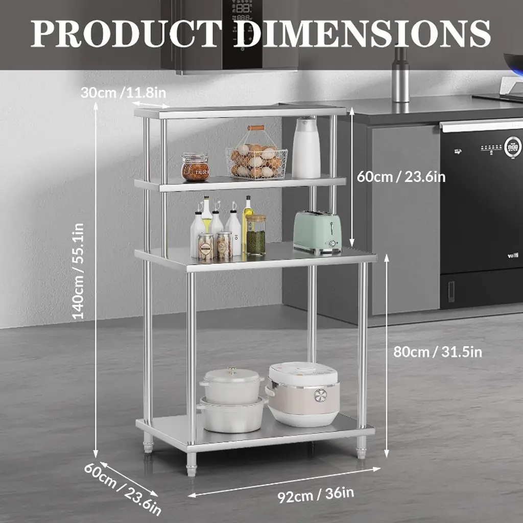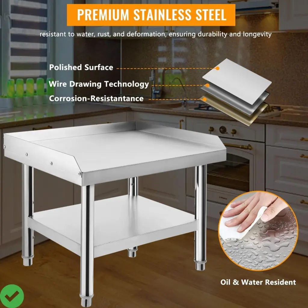 Acekool stainless steel work table brings professional-grade function and modern style to kitchens, restaurants, laundry rooms, and workshops. The large tabletop and adjustable under shelf create ample room for food preparation, serving, sorting, or project assembly. Keep appliances, cookware, or supplies close at hand with flexible lower storage, while the spacious surface handles mixing or chopping with ease.A raised backsplash protects walls and floors by containing splashes and spills. Four caster wheels make shifting the table between rooms or work zones effortless; lock two of the wheels for steady performance during busy tasks. Rounded edges and a smooth finish improve safety, while adjustable feet help the worktable sit evenly on different surfaces.Acekool offers this table in a range of sizes: choose from 12x30in, 12x36in, or 12x48in (all 99cm high) for compact areas, or pick 30x24in, 36x24in, or 48x24in (140cm high with double shelves) for large kitchens or multiple uses. Whether as a kitchen island, laundry folding station, grill stand, or restaurant prep area, this table fits a wide variety of spaces and tasks. Easy to assemble and clean, it delivers practical function and versatile style for everyday work or special projects.