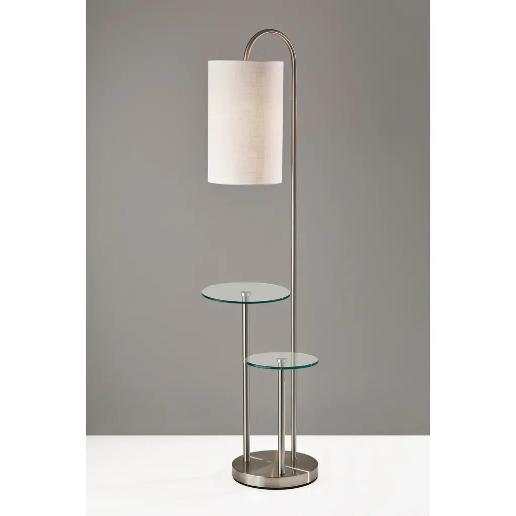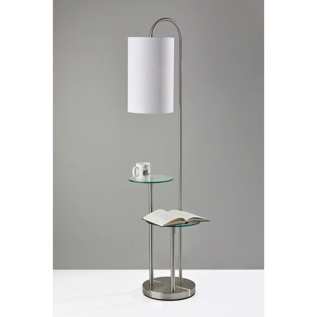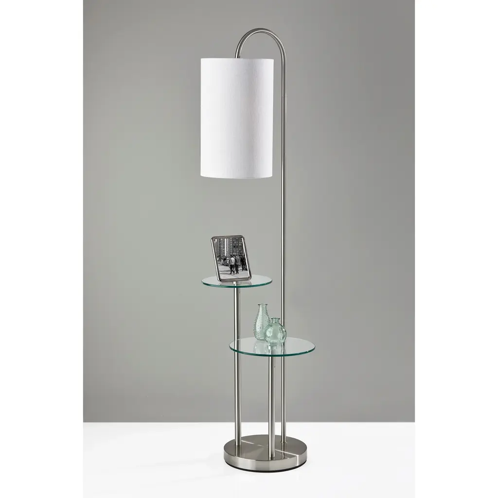 The ultimate space saving solution for beside the sofa, the Leonard Shelf Floor Lamp will provide 2 tiers of table storage space as well as decorative lighting with just a 20" footprint. A brushed steel finish paired with clear glass tabletops and a textured white fabric shade create a modern, upscale look. The 3-way rotary socket switch will only work with a 3-way light bulb, otherwise this lamp will function with simple on/off switch at its highest setting. All Adesso lighting product is either UL or ETL listed, meaning that it has been tested and approved to meet the government-regulated safety standards for the USA. Features: A brushed steel finish is mixed with glass tabletops for a sleek look Two tabletops offer the perfect solution to add light and storage in any room 3 Brightness Settings Requires (1) 100W Incandescent ETL listed 60-inch cord 3-Way Rotary Socket Switch E26 Medium Base Title 20 compliant: No Some assembly required 1-year limited manufacturer warranty Measurements: Width is 20-inch Height is 66-inch Extension/Depth is 13-inch Weight is 24.054lbs Shelf Dimensions are Top: 11" Dia. Bottom: 13" Dia. Shelf Clearance is Top: 28.5" to Floor Bottom: 19.25" to Floor Shade measures 10.5" Dia. x 17"H Base Measures 13" Dia.