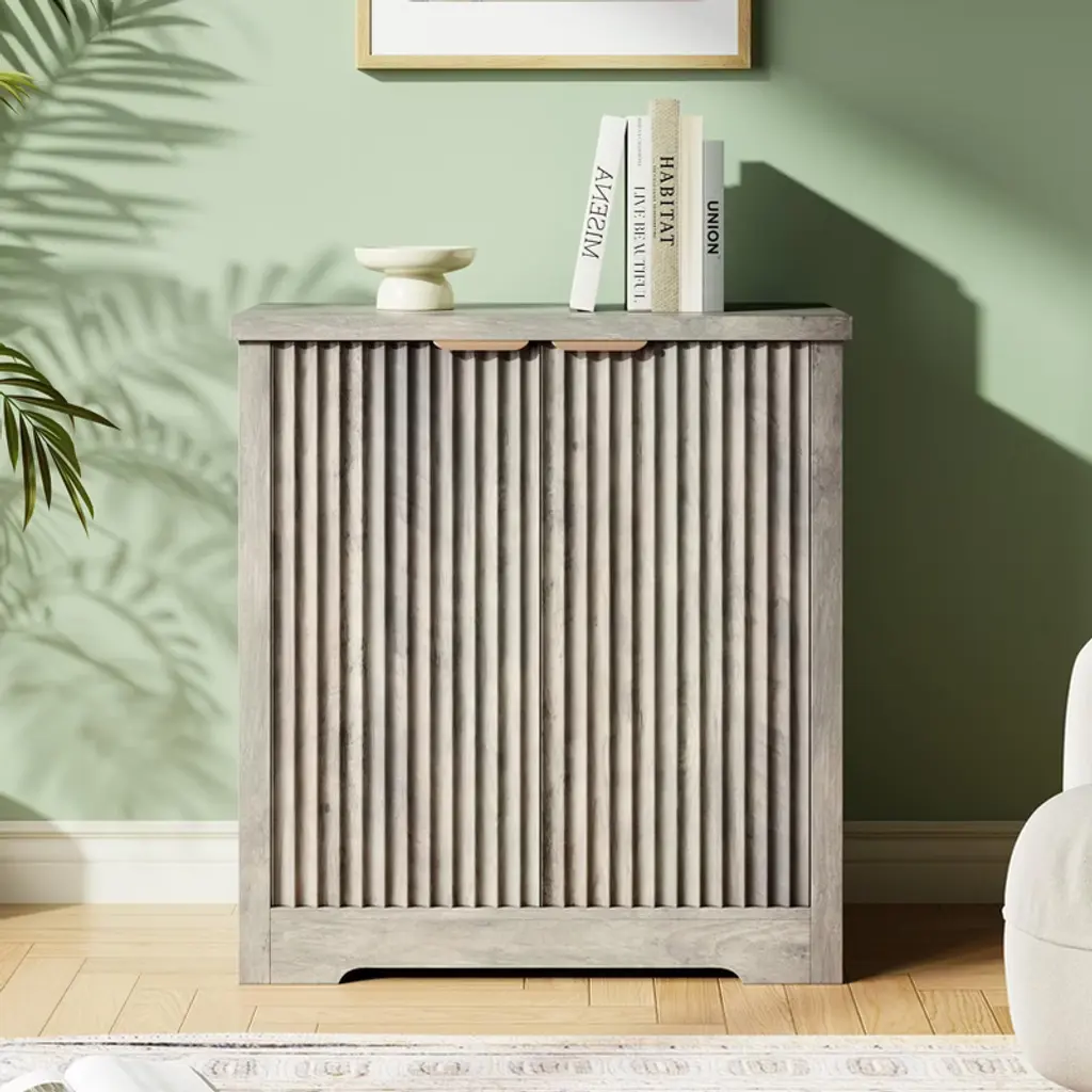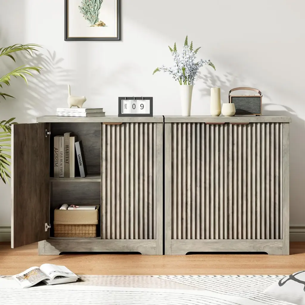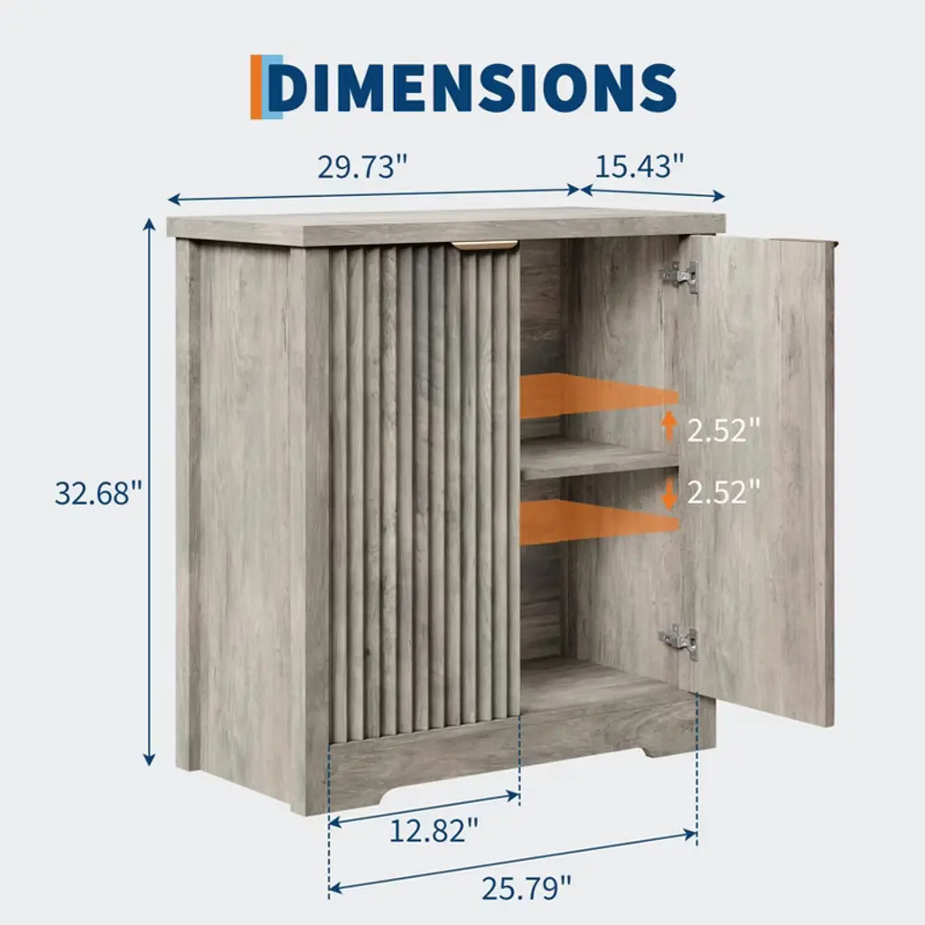 **Modern Fluted Sideboard Cabinet - Adjustable Shelf Storage with Wave Design Doors (Grey Oak Finish)** **Product Description:** Elevate your home storage with this beautifully crafted fluted sideboard that blends contemporary design with practical functionality. Measuring 32.8" wide with a spacious 36.6" deep tabletop, this versatile cabinet features distinctive wave-pattern doors with sleek metal handles that add artistic texture to any space. The durable engineered wood construction in a warm grey oak finish offers generous storage capacity, including one adjustable shelf that can be positioned to accommodate tall glassware or stacked dishes. Perfect as a kitchen buffet, dining room server, or living room media console, this piece combines organizational efficiency with modern Scandinavian-inspired aesthetics. **Key Features:** 1. **Contemporary Fluted Design** - Wave-pattern cabinet doors with matte metal handles create visual interest that complements modern farmhouse, minimalist, and transitional decor styles 2. **Customizable Storage Space** - Features one removable shelf (adjustable in 2" increments) to reconfigure interior space from 12" to 18" height as needed 3. **Multi-Functional Surface** - Spacious 36.6" x 15.4" tabletop accommodates coffee stations, decorative displays, or serving space during gatherings 4. **Premium Construction** - Engineered wood frame with reinforced corners supports up to 75 lbs distributed weight, featuring scratch-resistant laminate surfaces 5. **Hassle-Free Assembly** - Includes tool-free cam lock system with numbered panels and illustrated instructions (typically assembles in under 45 minutes) **Specifications:** - **Materials:** High-Density Engineered Wood (CARB Phase 2 Compliant) - **Finish:** Grey Oak Wood Grain with Matte Black Metal Handles - **Dimensions:** 32.8"W x 15.4"H x 36.6"D - **Interior Capacity:** 2.8 cubic feet - **Shelf Adjustability:** 3-5 position options (2" increments) - **Weight Capacity:** 75 lbs (evenly distributed) - **Door Type:** Full-overlay wave design with soft-close hinges - **Item Weight:** 58.44 lbs - **Assembly:** Required (all hardware included)