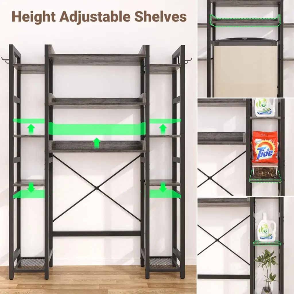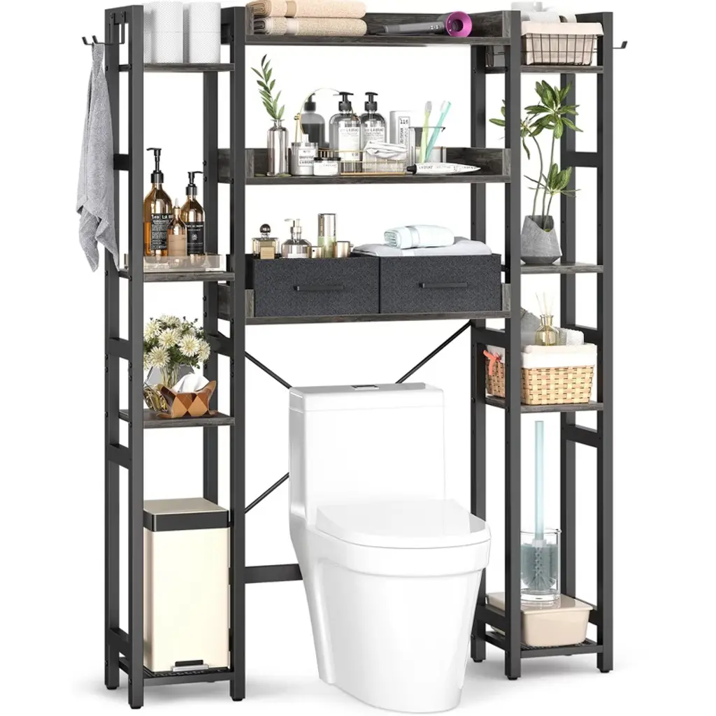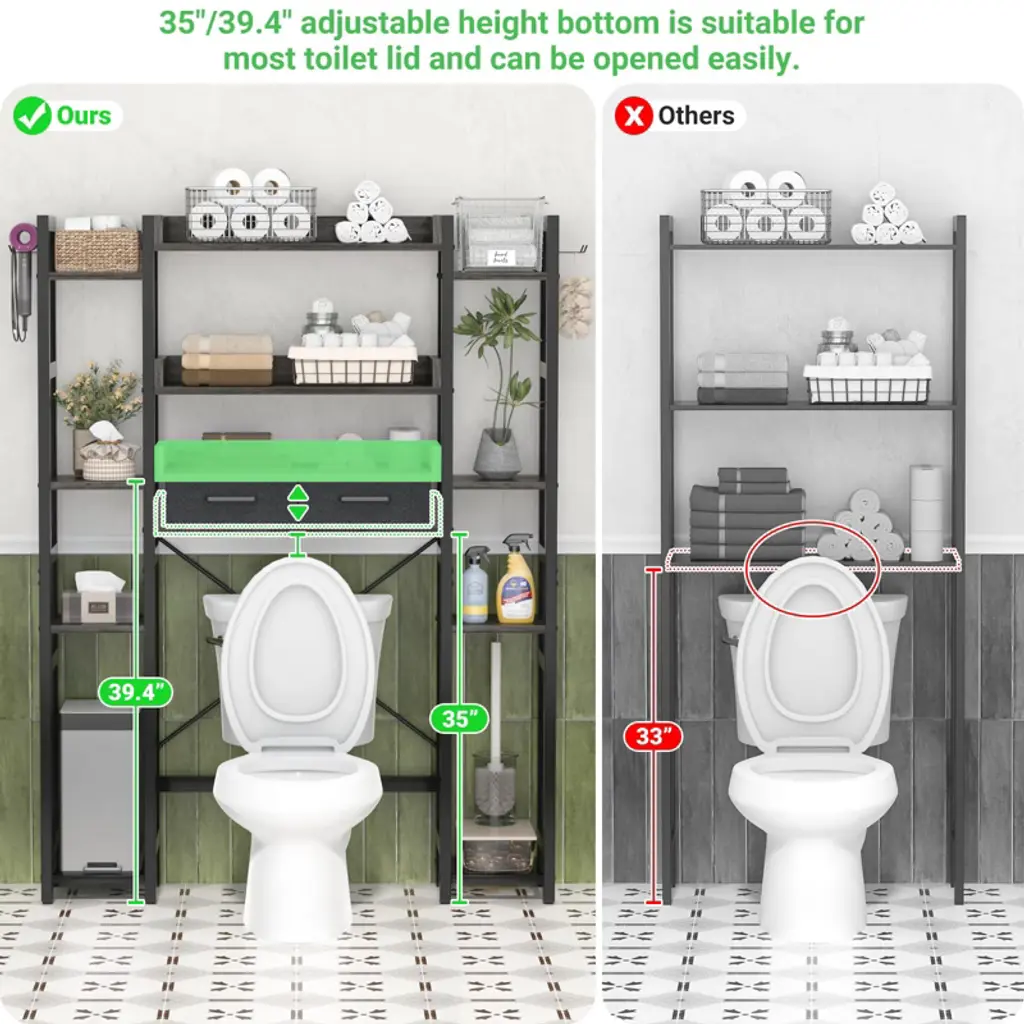 Maximize every inch of your bathroom with this versatile over-toilet organizer, designed to deliver both generous storage and adaptable functionality. Featuring 11 spacious tiers, 2 convenient fabric drawers, and 4 hooks, it neatly holds everything from toilet paper and towels to shampoo and daily essentials¡ªkeeping your space tidy and items within easy reach. Customize your setup with adjustable bottom and side shelves: set the lower height to 35" or 39.4" to fit most toilet lids, and adjust the bottom bar 4.7" or 9.4" from the floor to match your toilet¡¯s shape. Install it your way¡ªleft or right¡ªto suit any bathroom layout. While the sturdy MDF and metal frame offer reliable stability day after day. Durable, water-resistant, and built to last, this organizer brings smart, stylish storage to even the most compact bathrooms.