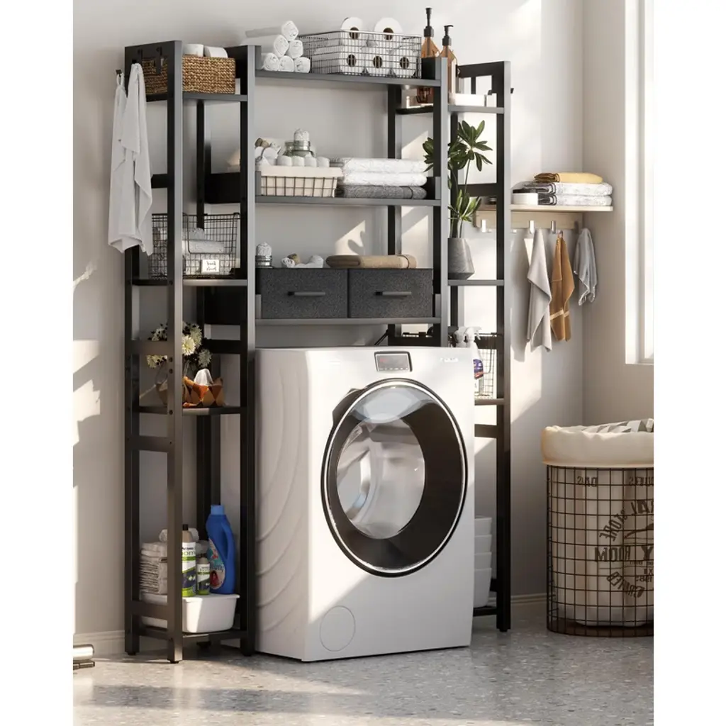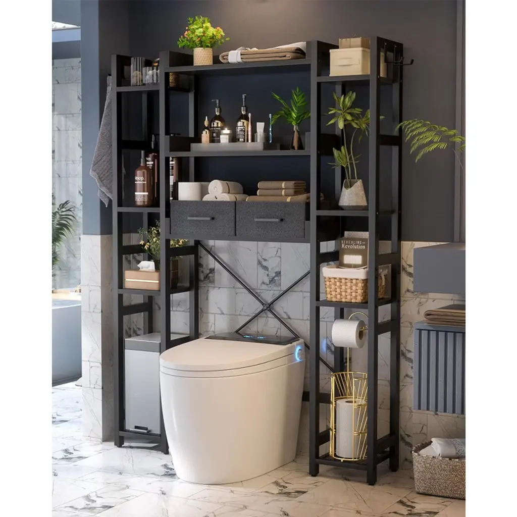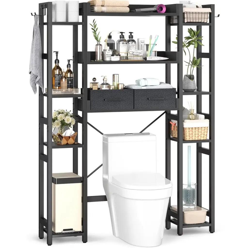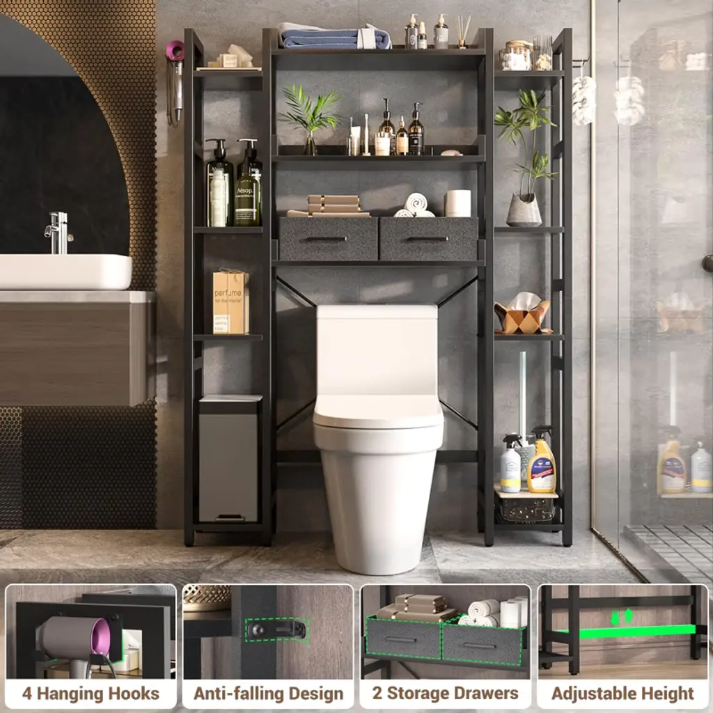 Maximize every inch of your bathroom with this versatile over-toilet organizer, designed to deliver both generous storage and adaptable functionality. Featuring 11 spacious tiers, 2 convenient fabric drawers, and 4 hooks, it neatly holds everything from toilet paper and towels to shampoo and daily essentials¡ªkeeping your space tidy and items within easy reach. Customize your setup with adjustable bottom and side shelves: set the lower height to 35" or 39.4" to fit most toilet lids, and adjust the bottom bar 4.7" or 9.4" from the floor to match your toilet¡¯s shape. Install it your way¡ªleft or right¡ªto suit any bathroom layout. While the sturdy MDF and metal frame offer reliable stability day after day. Durable, water-resistant, and built to last, this organizer brings smart, stylish storage to even the most compact bathrooms.