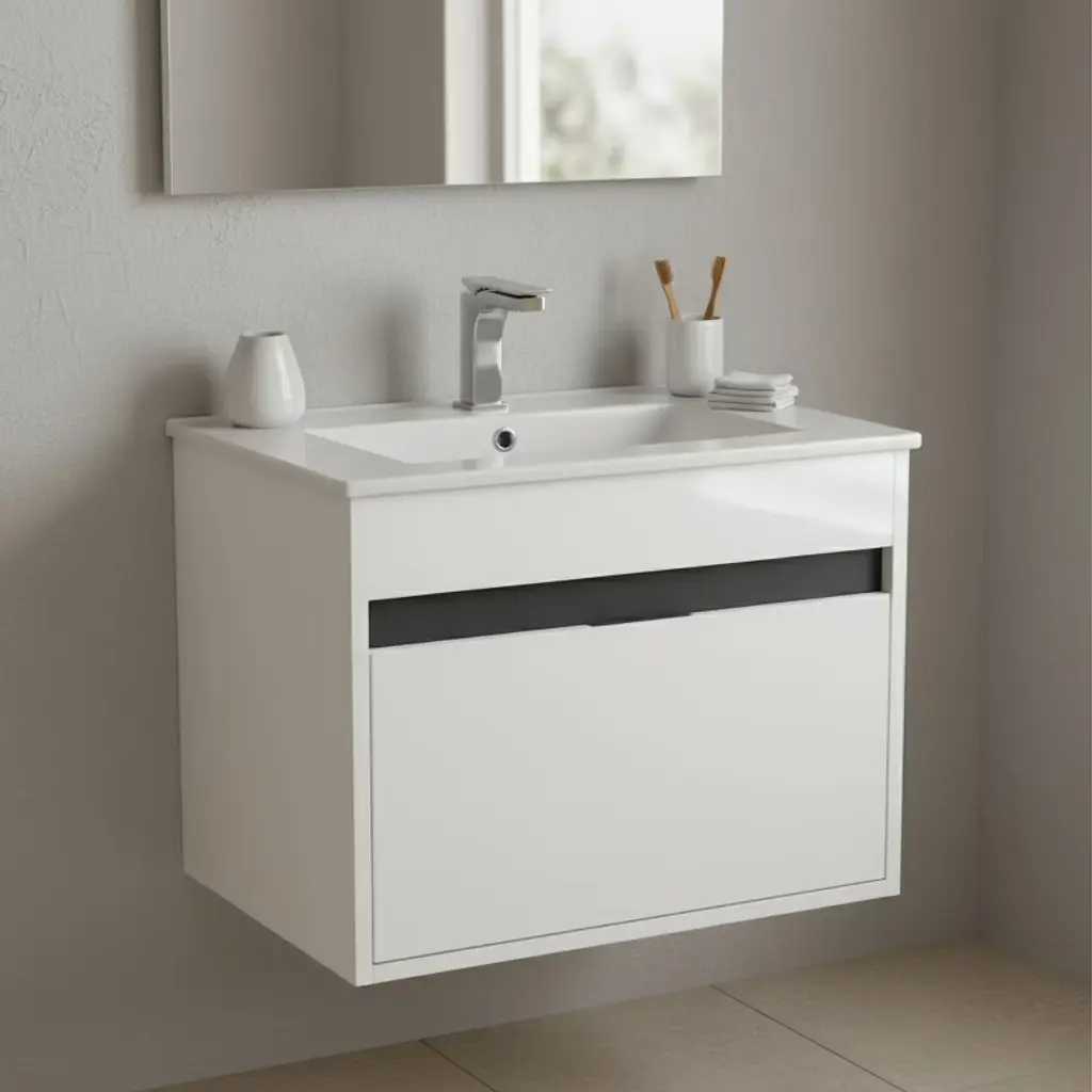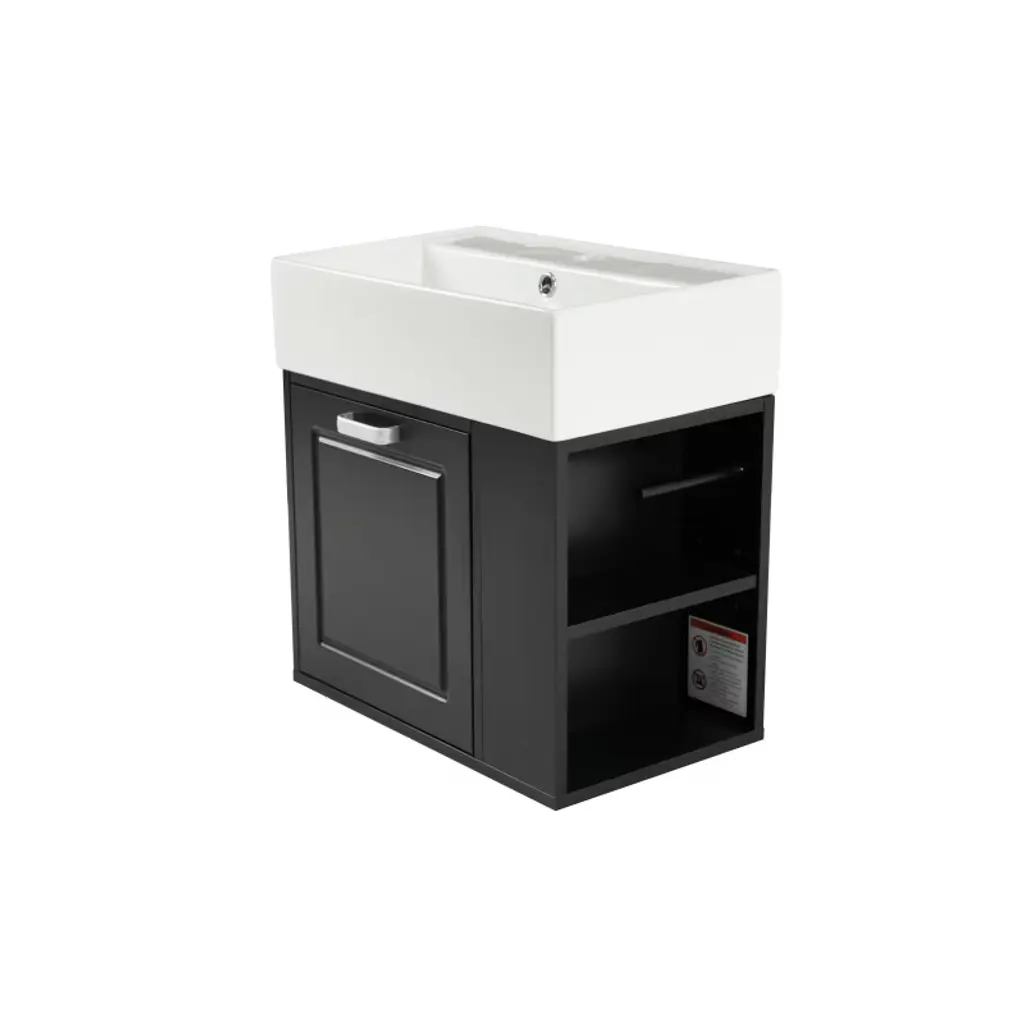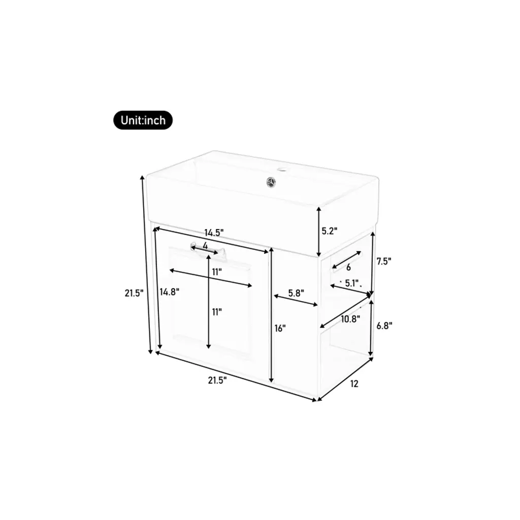 This 21.8-inch wall-mounted floating bathroom cabinet showcases a minimalist yet luxurious style. Its sleek design saves space and adds a touch of elegance to any bathroom decor, seamlessly blending aesthetics with functionality.