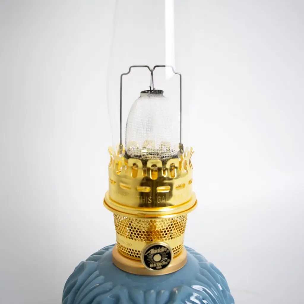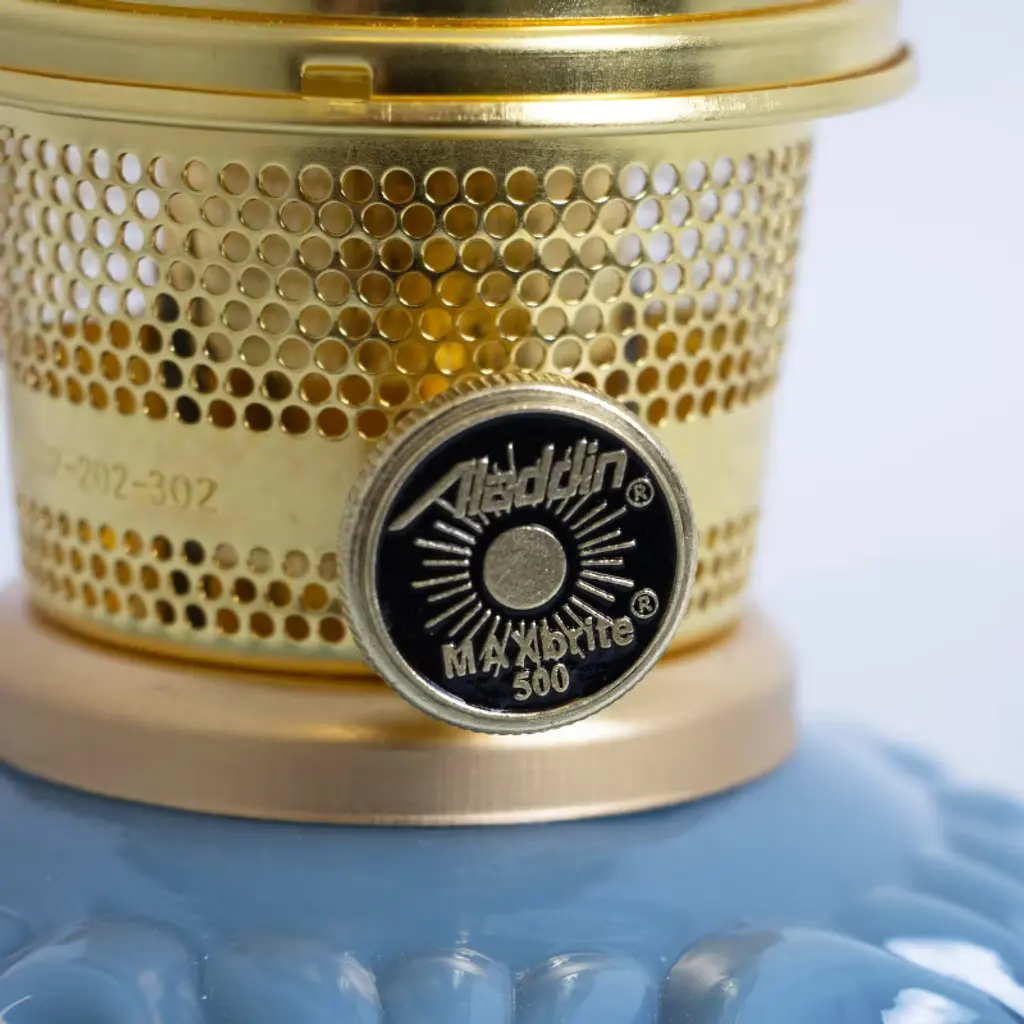 Limited Edition - Perfect for Aladdin Collectors Introducing Georgia Blue. . . the second color in the Aladdin Limited Edition Genie II Series! With only 200 made, this gorgeous glass lamp is perfect for collectors and Aladdin enthusiasts alike. Enjoy bright-as-electric lighting with showpiece quality. Limited Edition - The Georgia Blue is the second color in the Limited Edition Genie II Series. Released in 2024, get it before it is gone. . . only 200 were made!. Showpiece Quality - The stunning blue glass bowl is made in the USA. It's designed in a shape and pattern that is similar to a lotus blossom or water lily flower.. Bright as Electric - The brightness is equal to a 40 W bulb or 40 candlepower or 6 #2 flat-wick lamps.. Functional and Practical - Just like all Aladdin oil lamps, it comes equipped with an Aladdin burner, wick, glass chimney and mantle. Burns about 10-12 hours per fill; overall 19"H.. Helpful Hint: This lamp is designed without a filler plug. To fill it, just unscrew the unlit burner and add Aladdin Lamp Oil (you supply). History of the Aladdin Genie II Shelf Lamp The Aladdin Genie II was first introduced in 1990 with a unique lamp shape and pattern that is similar to a lotus blossom or water lily flower. Now we're excited to offer this lamp in new beautiful colors, now with the Georgia Blue. This lamp does not have a filler plug. This was a safety feature introduced in some versions of Model B lamps to help prevent people from filling their lamps when they were still burning. Just remove the unlit burner to fill. Color: Georgia Blue. Dimensions: 19"H. Weight: 6 lb. Origin: Assembled in the USA with domestic and imported parts.