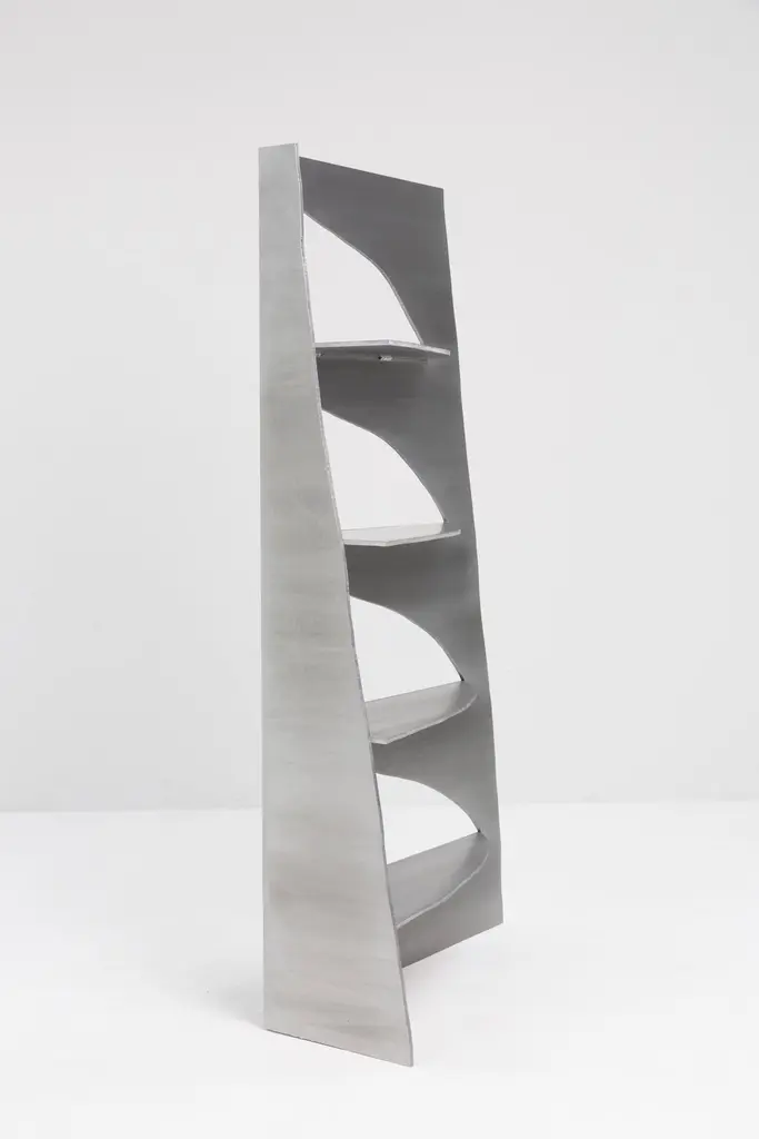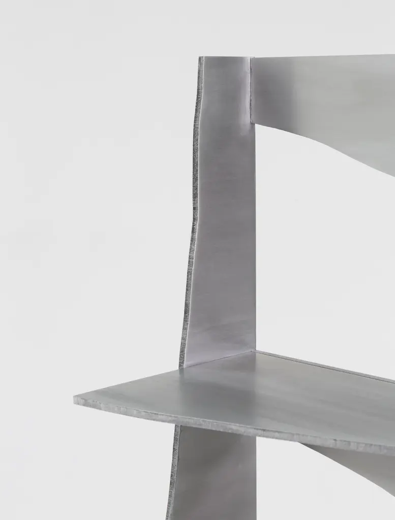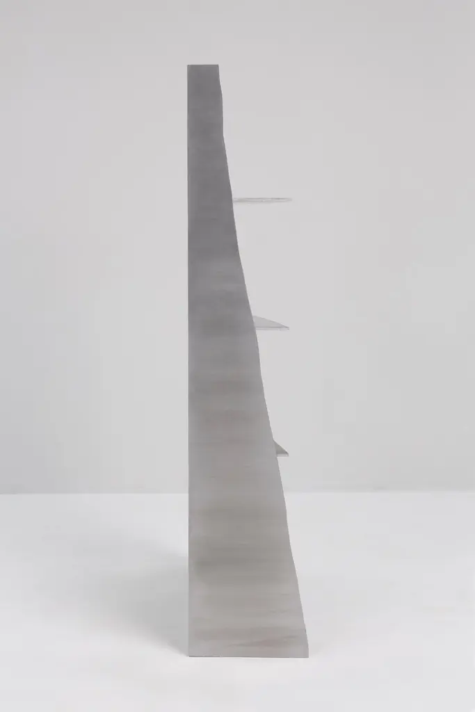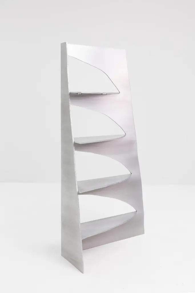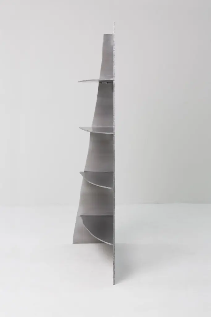 Aluminum rational jigsaw shelf by Studio Julien ManairaDimensions: 72.5 x 25 x 140 cmMaterials: brushed and waxed aluminumThe intention behind this project is to highlight the traces from the actions of the maker. In this sense, the choice of the jigsaw is deliberate and allows a strong physical relation between maker and material, that will remain tangible in the final object. Each of these cuts is unique and have their own character emanating from what happened on the very moment of the making. They stand out from the regular and smooth cuts realized digitally in a factory. Digital and manual inputs have equal importance in the objects. They communicate their differences in order to create a strong dynamic between the two methodologies of work. Without suggesting which is better, they create their own narrative and are the reflection of two temporalities: the digital work is continuous when the manual work is the track of a particular moment. The created objects intend to be the presentation of these approaches of the material. The dynamic and anarchic way of cutting by hand respond to the linear and supervised vision of the computer-cut elements. The pieces intend to be functional objects carrying the narrated discussion between the controlled and uncontrolled treatments of the material.Julien Manaira (France,1992) successively studied industrial design (La martinière, Lyon) and fine arts -option product design (Esad, Reims). in 2015 he came to Amsterdam to follow a temporary master program (Materialisation in Art and Design) at the Sandberg Institute where he graduated in 2017 before opening his studio in the same city. His graduation project ‘The once liquid plastic’ was awarded by the RADO Star Prize 2017 and the 3rd prize of the Pure Talent Contest at IMM Cologne 2018. In the last years, he exhibited his works in different established and recognized organizations such as Paris Design Week, IMM Cologne, Design Parade Hyères, and Milan Design Week. He was commissioned by different companies, among which Nilufar Gallery, Nubikk, Van Dijk Store as well as private clients. The main focus in his practice is setting processes that allow the manufacturer or him to be mentally and physically involved in the transformation of material towards an object. He believes that this empowerment is a way to engage deeper the audience or user’s perception, and therefore create a stronger connection with the object. Serendipity, combining industrial and artisanal material, are examples of how he aims to create objects that are able to communicate their undergone transformations. ©Iris Box.