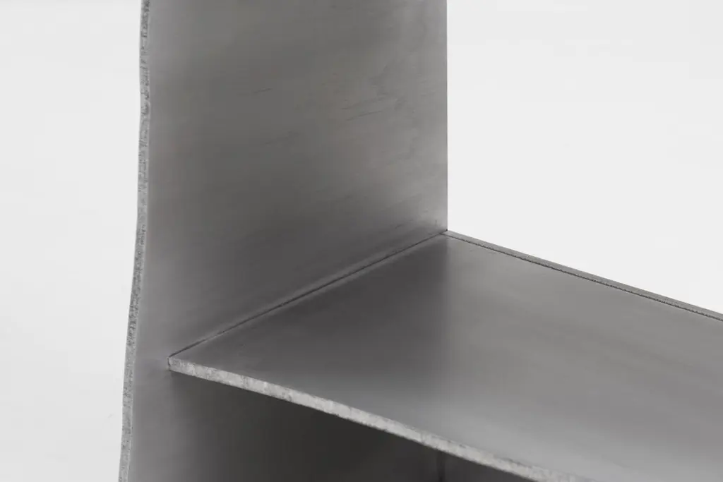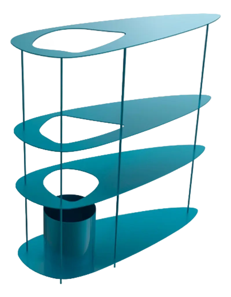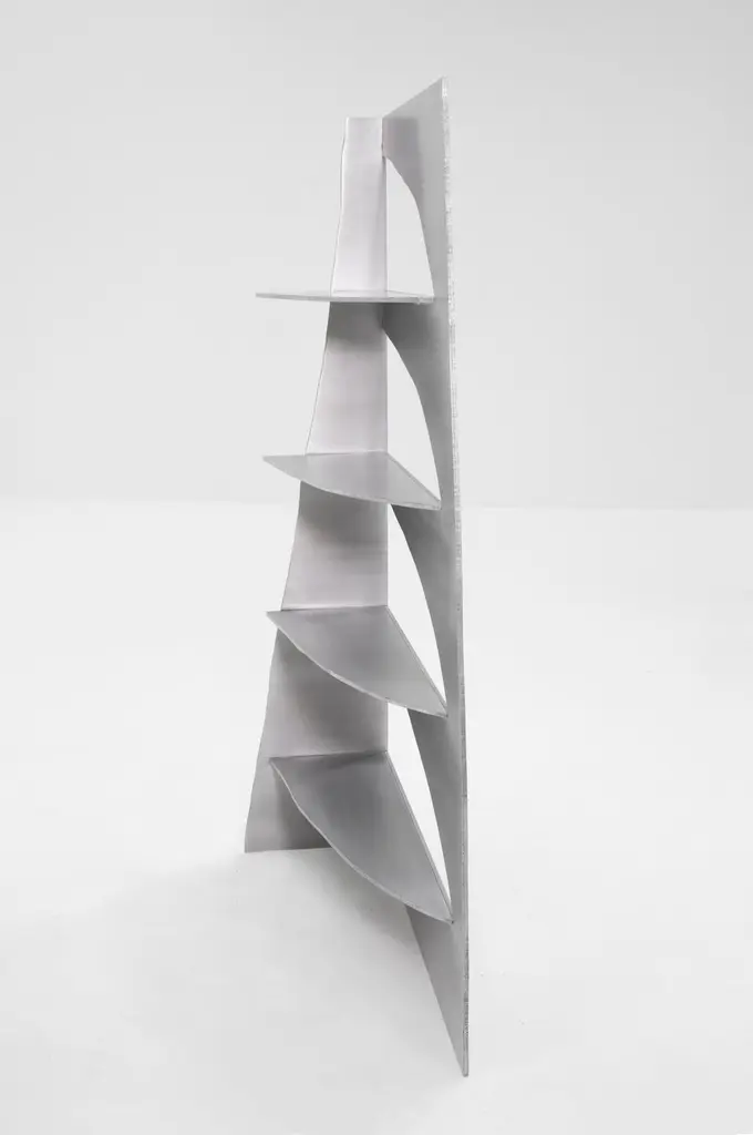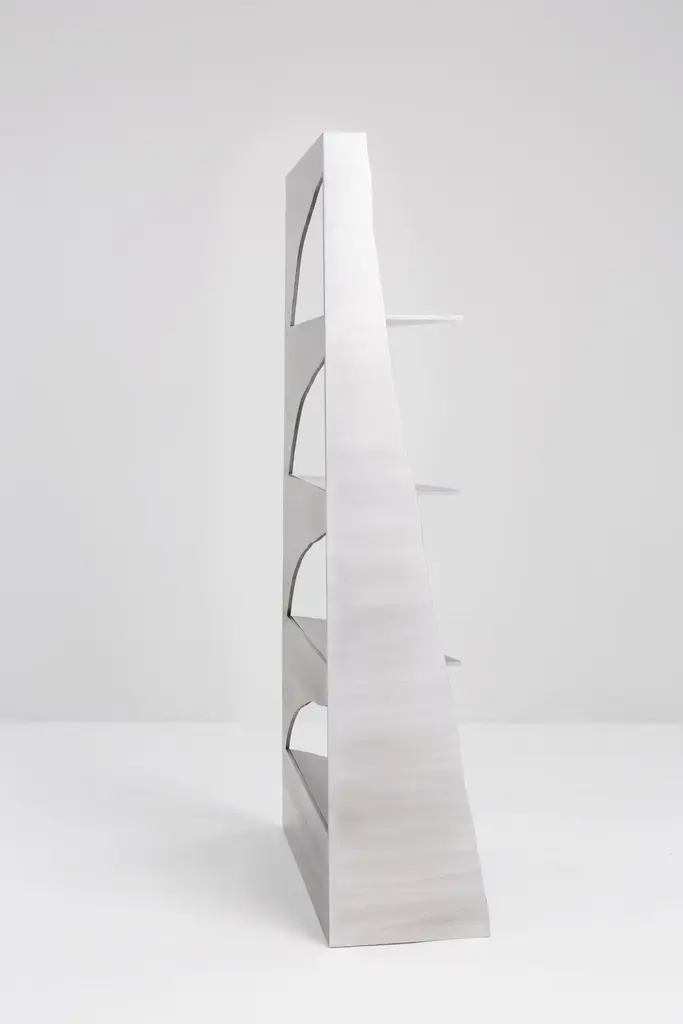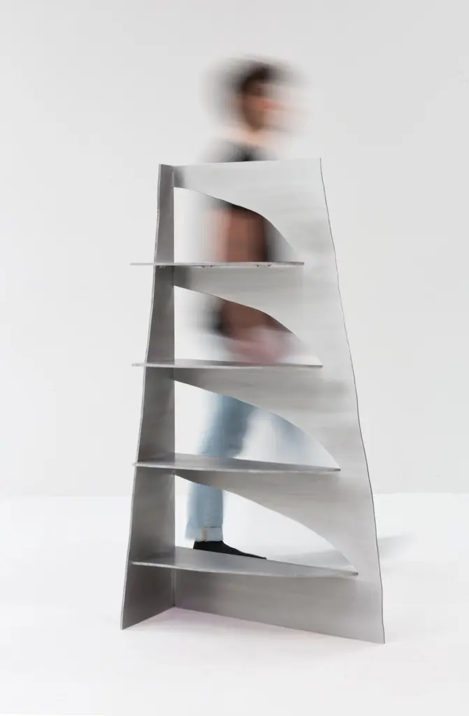 Aluminum rational jigsaw shelf by Studio Julien ManairaDimensions: 72.5 x 25 x 140 cmMaterials: brushed and waxed aluminumThe intention behind this project is to highlight the traces from the actions of the maker. In this sense, the choice of the jigsaw is deliberate and allows a strong physical relation between maker and material, that will remain tangible in the final object. Each of these cuts is unique and have their own character emanating from what happened on the very moment of the making. They stand out from the regular and smooth cuts realized digitally in a factory. Digital and manual inputs have equal importance in the objects. They communicate their differences in order to create a strong dynamic between the two methodologies of work. Without suggesting which is better, they create their own narrative and are the reflection of two temporalities: the digital work is continuous when the manual work is the track of a particular moment. The created objects intend to be the presentation of these approaches of the material. The dynamic and anarchic way of cutting by hand respond to the linear and supervised vision of the computer-cut elements. The pieces intend to be functional objects carrying the narrated discussion between the controlled and uncontrolled treatments of the material.Julien Manaira (France,1992) successively studied industrial design (La martinière, Lyon) and fine arts -option product design (Esad, Reims). in 2015 he came to Amsterdam to follow a temporary master program (Materialisation in Art and Design) at the Sandberg Institute where he graduated in 2017 before opening his studio in the same city. His graduation project ‘The once liquid plastic’ was awarded by the RADO Star Prize 2017 and the 3rd prize of the Pure Talent Contest at IMM Cologne 2018. In the last years, he exhibited his works in different established and recognized organizations such as Paris Design Week, IMM Cologne, Design Parade Hyères, and Milan Design Week. He was commissioned by different companies, among which Nilufar Gallery, Nubikk, Van Dijk Store as well as private clients. The main focus in his practice is setting processes that allow the manufacturer or him to be mentally and physically involved in the transformation of material towards an object. He believes that this empowerment is a way to engage deeper the audience or user’s perception, and therefore create a stronger connection with the object. Serendipity, combining industrial and artisanal material, are examples of how he aims to create objects that are able to communicate their undergone transformations. ©Iris Box.