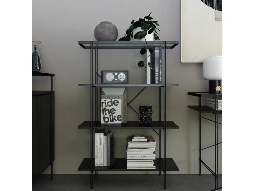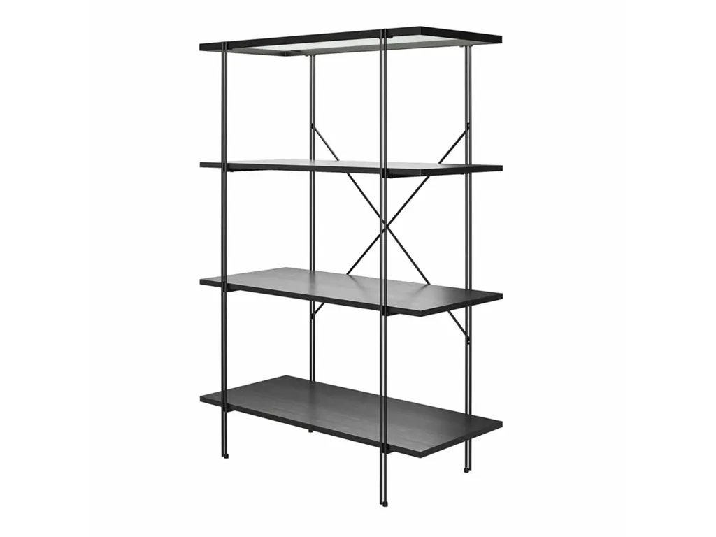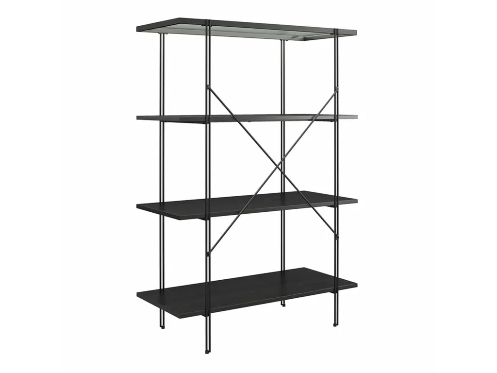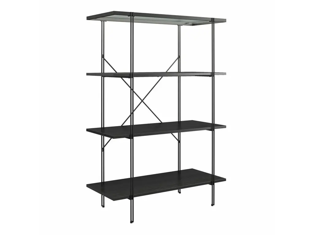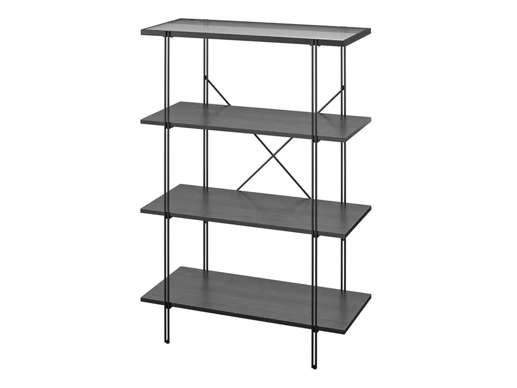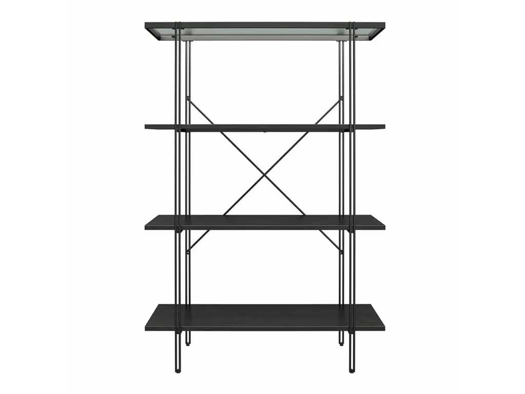 Add style and functionality to your living space with the Ameriwood Home Lakeland 4 Shelf Bookcase. This ultra-modern bookcase will give you a unique way to express your personality and show off your memorabilia, decor and books. The woodgrain finish on the laminated particleboard will look gorgeous with the fluted glass top shelf and sturdy metal frame. A wall anchor kit is included to secure the bookcase to the wall and prevent tipping injuries. Pair the bookcase with the rest of the Lakeland collection for a coordinated look for your entire room. The bookcase ships flat to your door and 2 adults are recommended to assemble. Each shelf can hold up to 25 lbs. Assembled dimensions: 46.06"H x 31.3"W x 14.5"D.