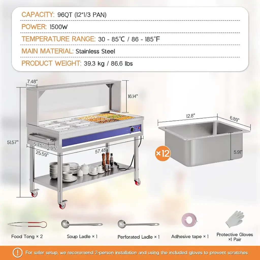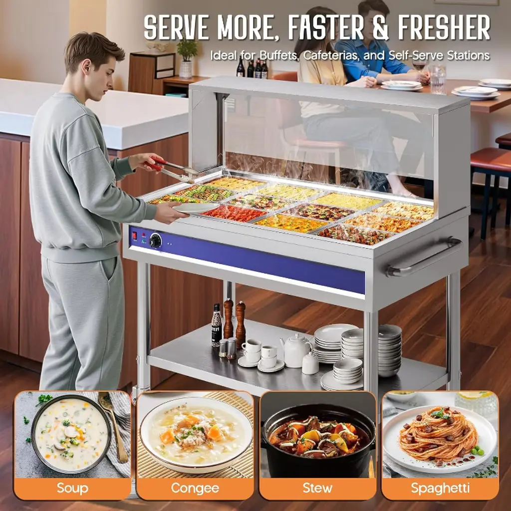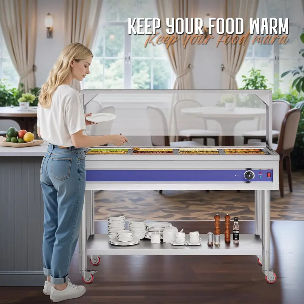 This 12-Pan 96QT Commercial Food Warmer is designed for professional kitchens, buffets, hotels, and catering services, offering a powerful 1500W heating system with precise temperature control. Built with durable stainless steel, it ensures reliable performance, easy cleaning, and long-lasting use. The unit includes 12 pans with lids and handles, providing ample capacity to serve a wide variety of dishes while maintaining food at safe and appetizing temperatures. Featuring a sneeze guard, undershelf, and smooth-rolling caster wheels, this buffet warmer combines safety, convenience, and mobility in one unit. With adjustable temperature (86–185°F / 30–85°C) and dry-burn protection, it guarantees both efficiency and safety for every event. Capacity: 96QT (12 x 1/3 size pans) Power: 1500W Voltage: 110V AC Temperature Range: 86–185°F (30–85°C) adjustable Material: Stainless Steel Mobility: 4 caster wheels (2 lockable)