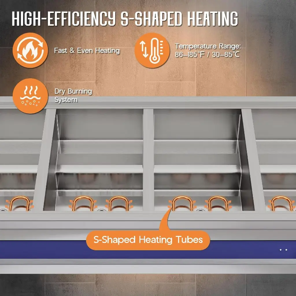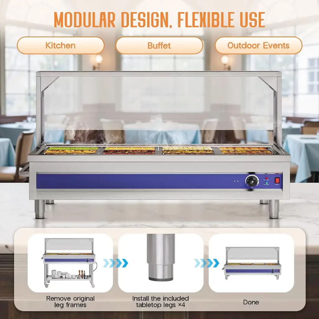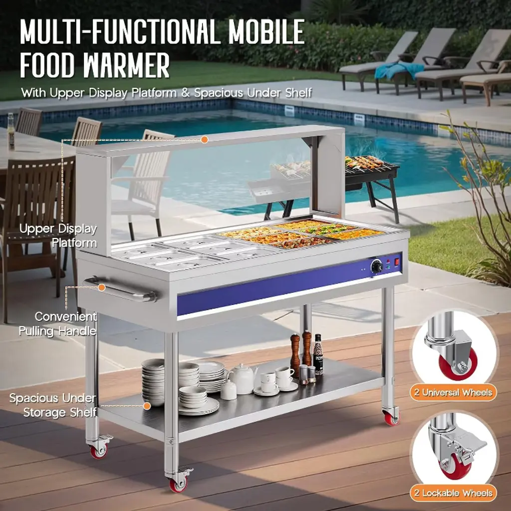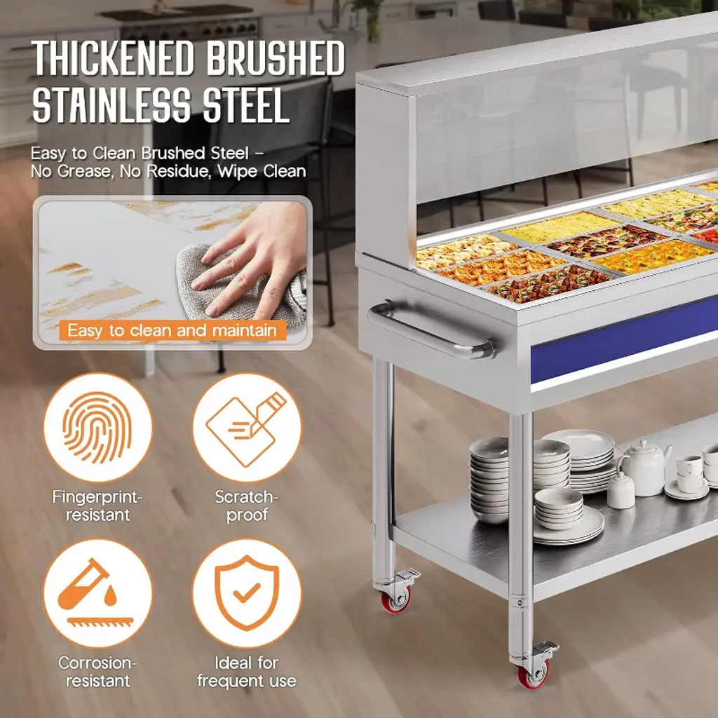 This 12-Pan 96QT Commercial Food Warmer is designed for professional kitchens, buffets, hotels, and catering services, offering a powerful 1500W heating system with precise temperature control. Built with durable stainless steel, it ensures reliable performance, easy cleaning, and long-lasting use. The unit includes 12 pans with lids and handles, providing ample capacity to serve a wide variety of dishes while maintaining food at safe and appetizing temperatures. Featuring a sneeze guard, undershelf, and smooth-rolling caster wheels, this buffet warmer combines safety, convenience, and mobility in one unit. With adjustable temperature (86–185°F / 30–85°C) and dry-burn protection, it guarantees both efficiency and safety for every event. Capacity: 96QT (12 x 1/3 size pans) Power: 1500W Voltage: 110V AC Temperature Range: 86–185°F (30–85°C) adjustable Material: Stainless Steel Mobility: 4 caster wheels (2 lockable)