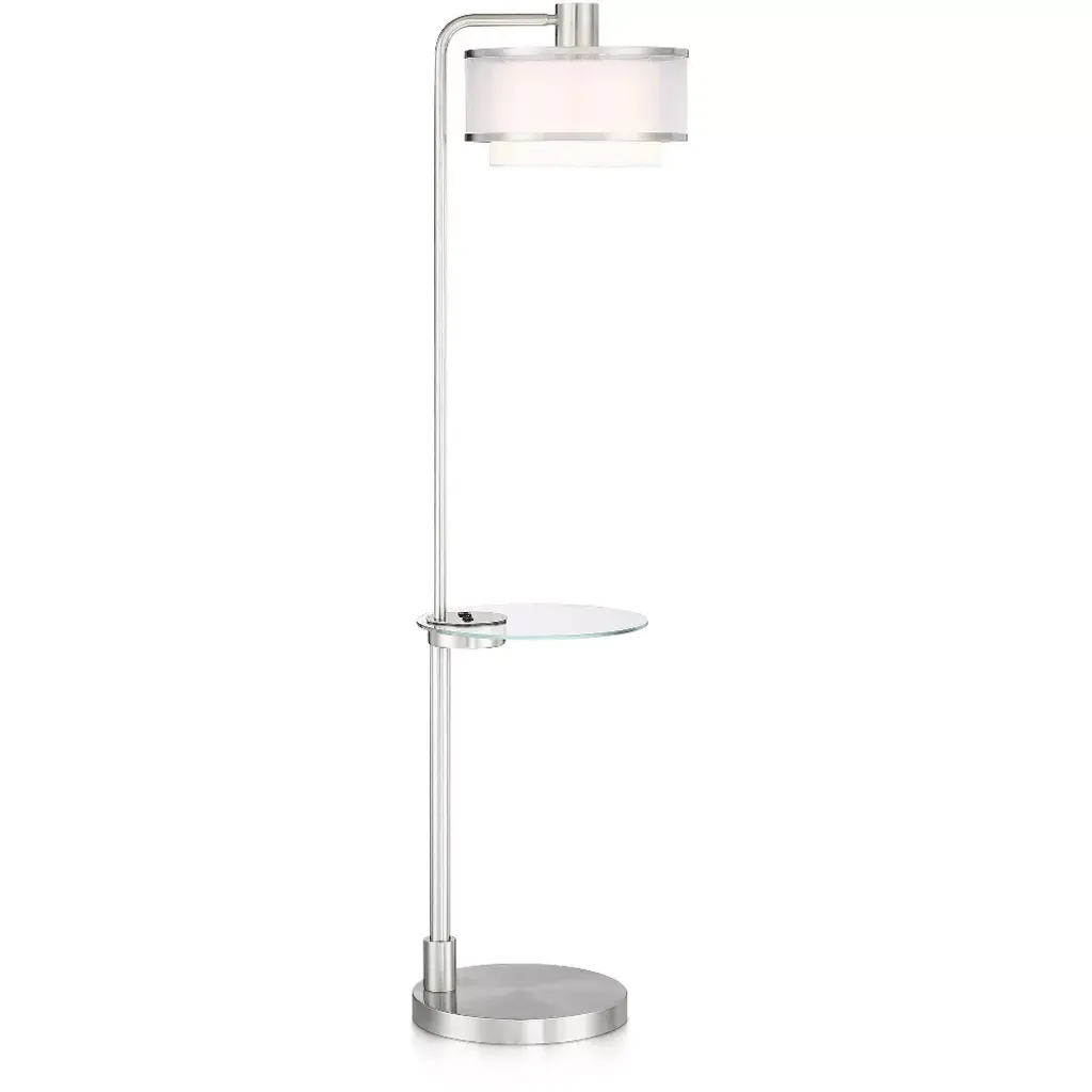 Form meets function in the Amira Shelf Floor Lamp, featuring a brushed steel finish, modern silhouette and a built-in surface to keep essentials close at hand. Display it anywhere for soft, adjustable illumination and a sleek, refined look.