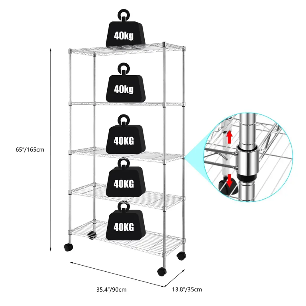 Angel Sar 5-tier Chrome Storage Shelf, 165x90x35cm Rolling Utility Rack With 1.5" Wheels, For Home Kitchen Bathroom Organization