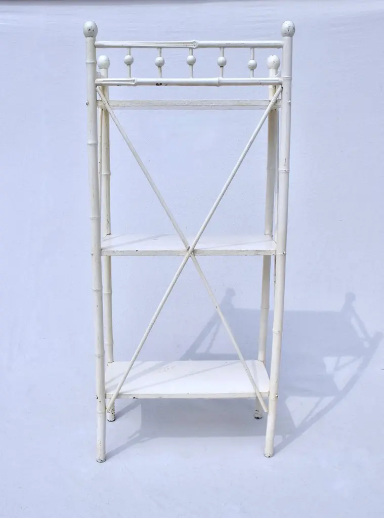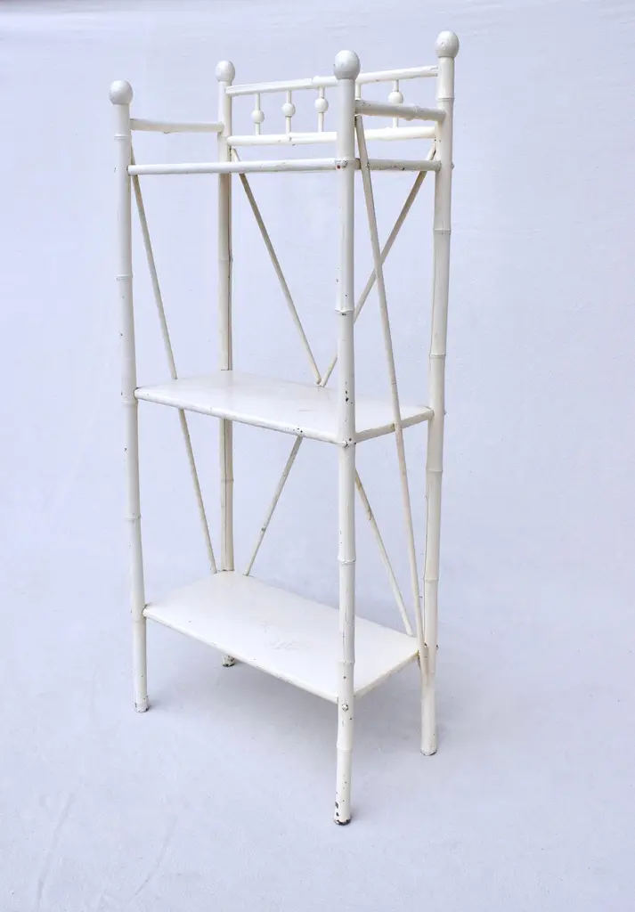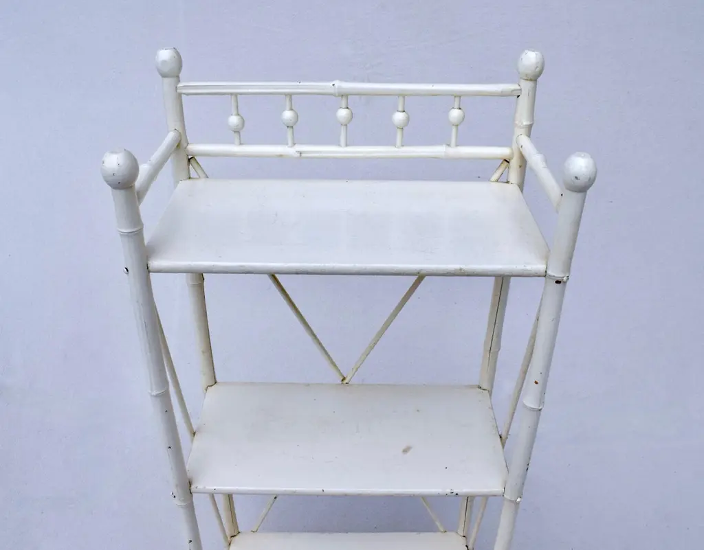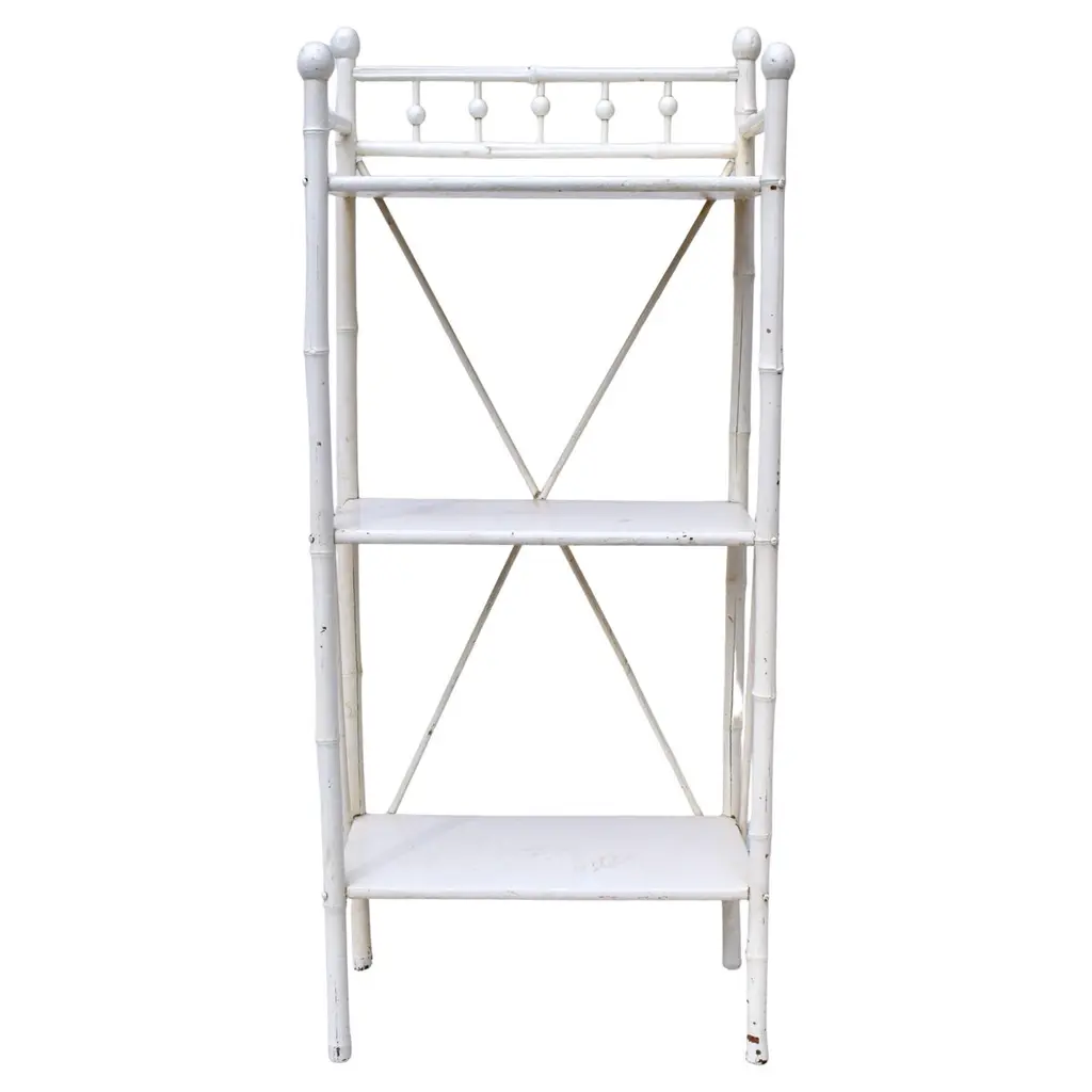 Late 19th century Victorian 'stick and ball bamboo display Étagère with three wood shelves and X stretcher to the back & sides ensuring solid construction. Patinated white paint nicely maintained in a naturally distressed finish.