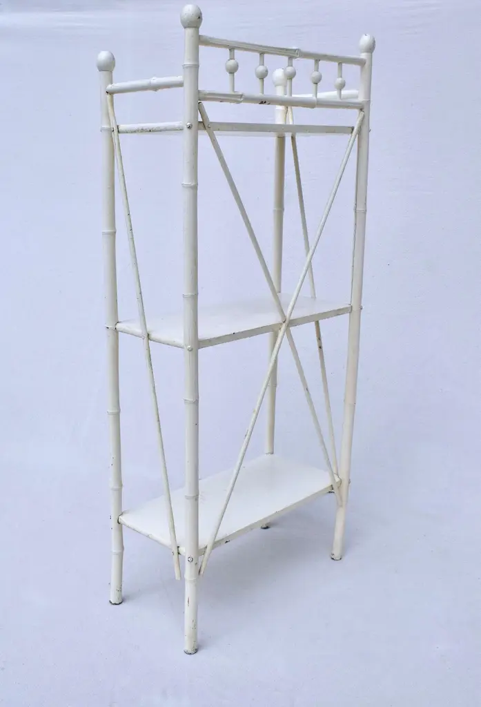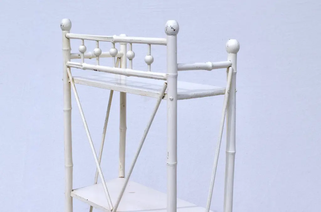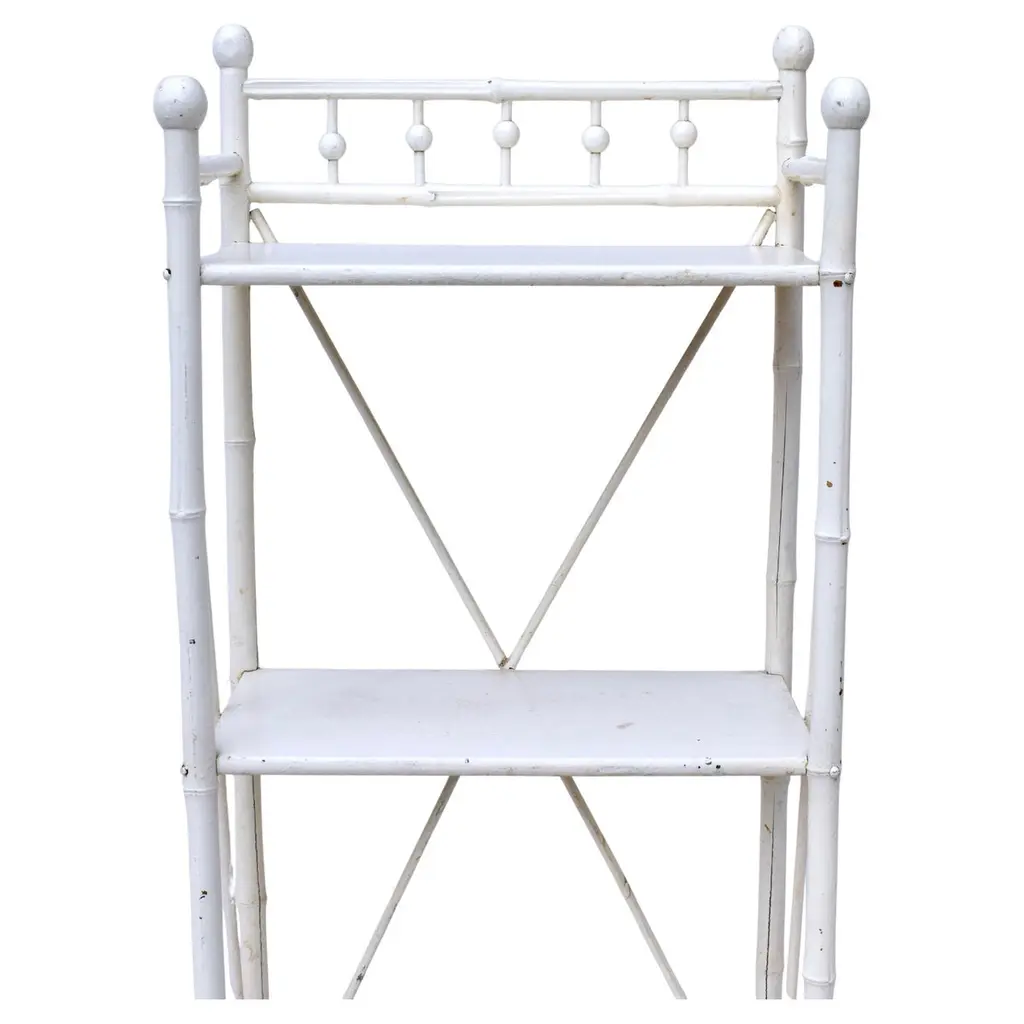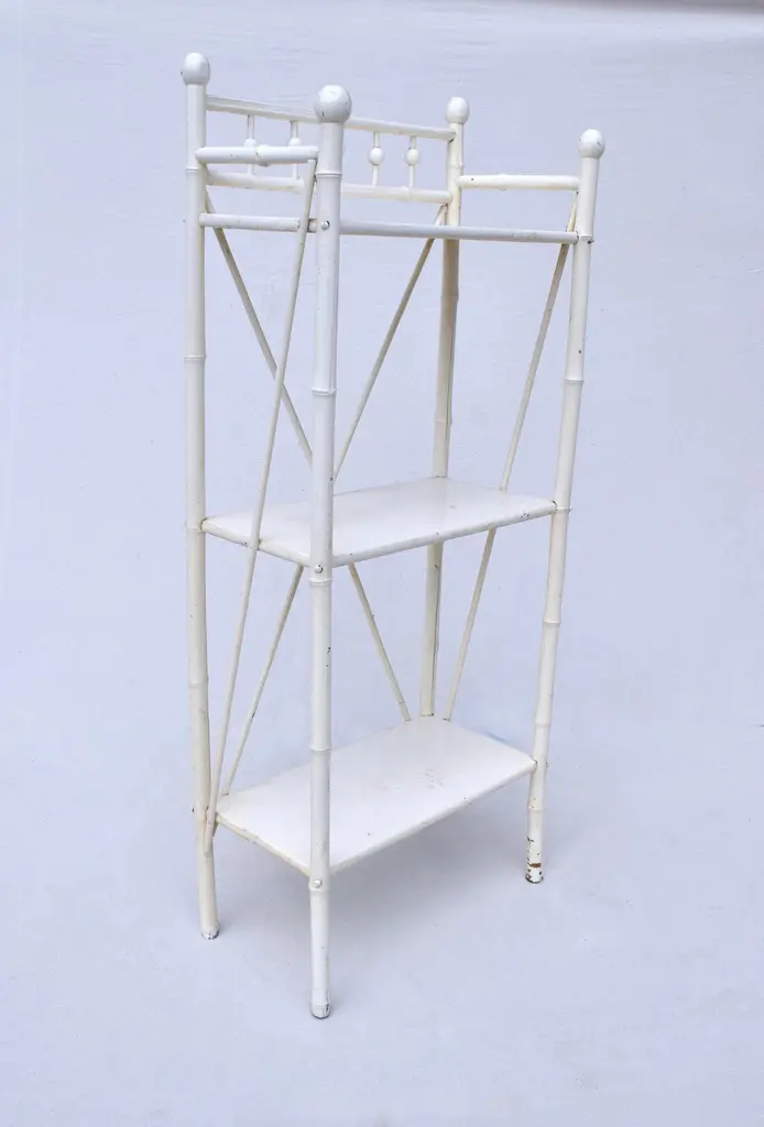 Late 19th century Victorian 'stick and ball bamboo display Étagère with three wood shelves and X stretcher to the back & sides ensuring solid construction. Patinated white paint nicely maintained in a naturally distressed finish.