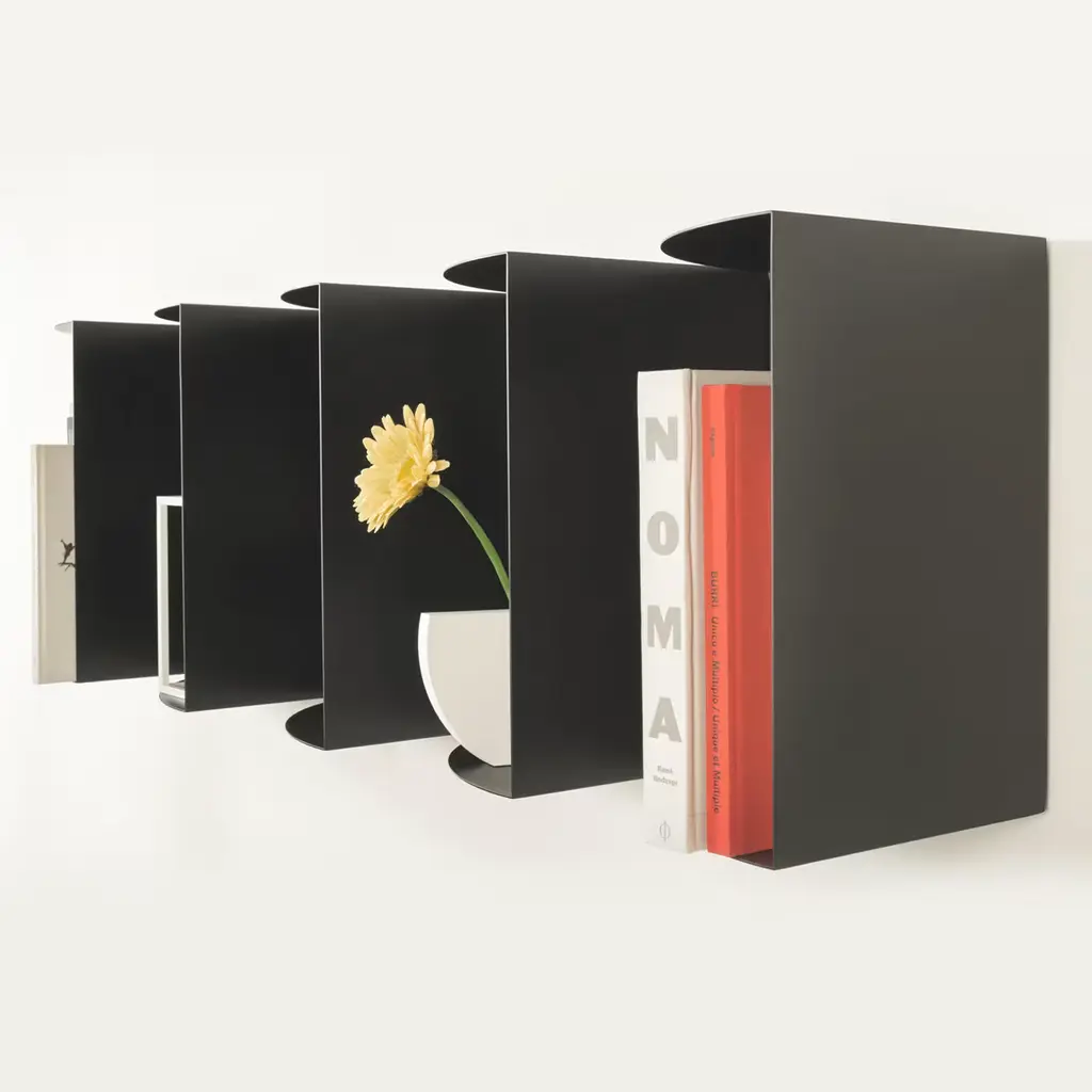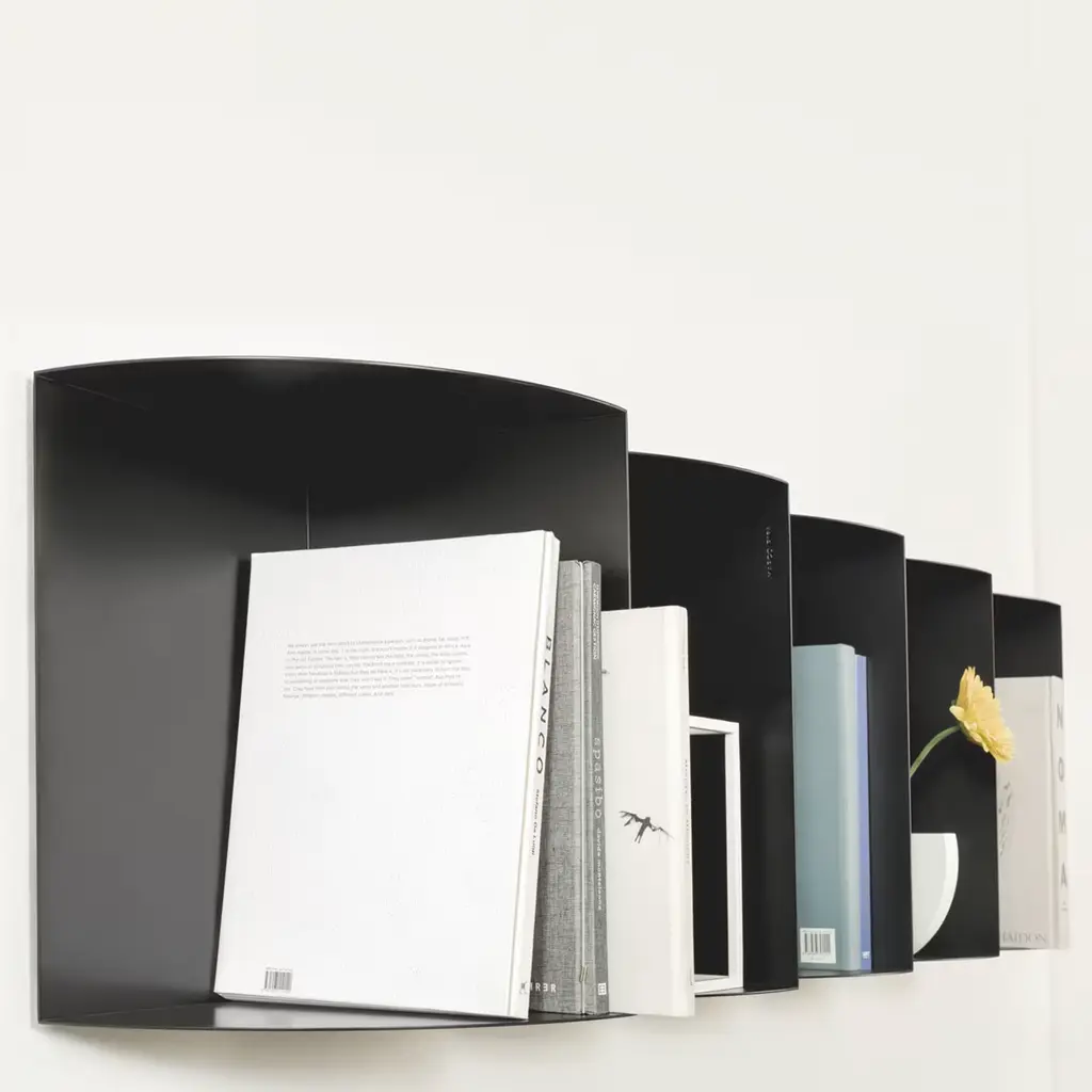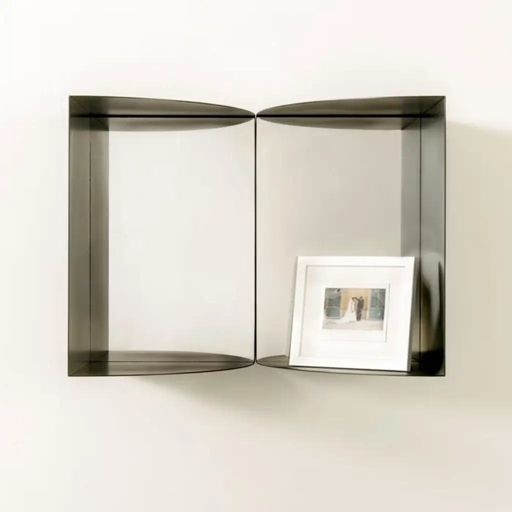 This floating shelf by designer Roberto Cicchinè reveals visual lightness and proportional harmony in a simple shape inspired by the movement of an opening window (aperture means openings in Italian). Crafted of black-lacquered metal, this modular shelf can be hung both vertically and horizontally, alone or in combination with others to create an entire wall unit. Perfect for adding functional and decorative surface in entryways or above desks and consoles, it is available also in white, and the interior can be enriched with a mirrored sheeting (chrome or 24-carat gold) upon request.