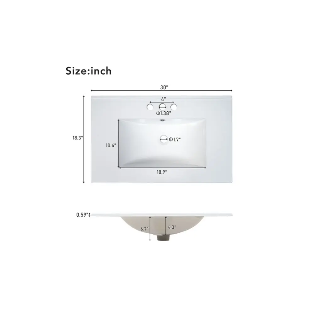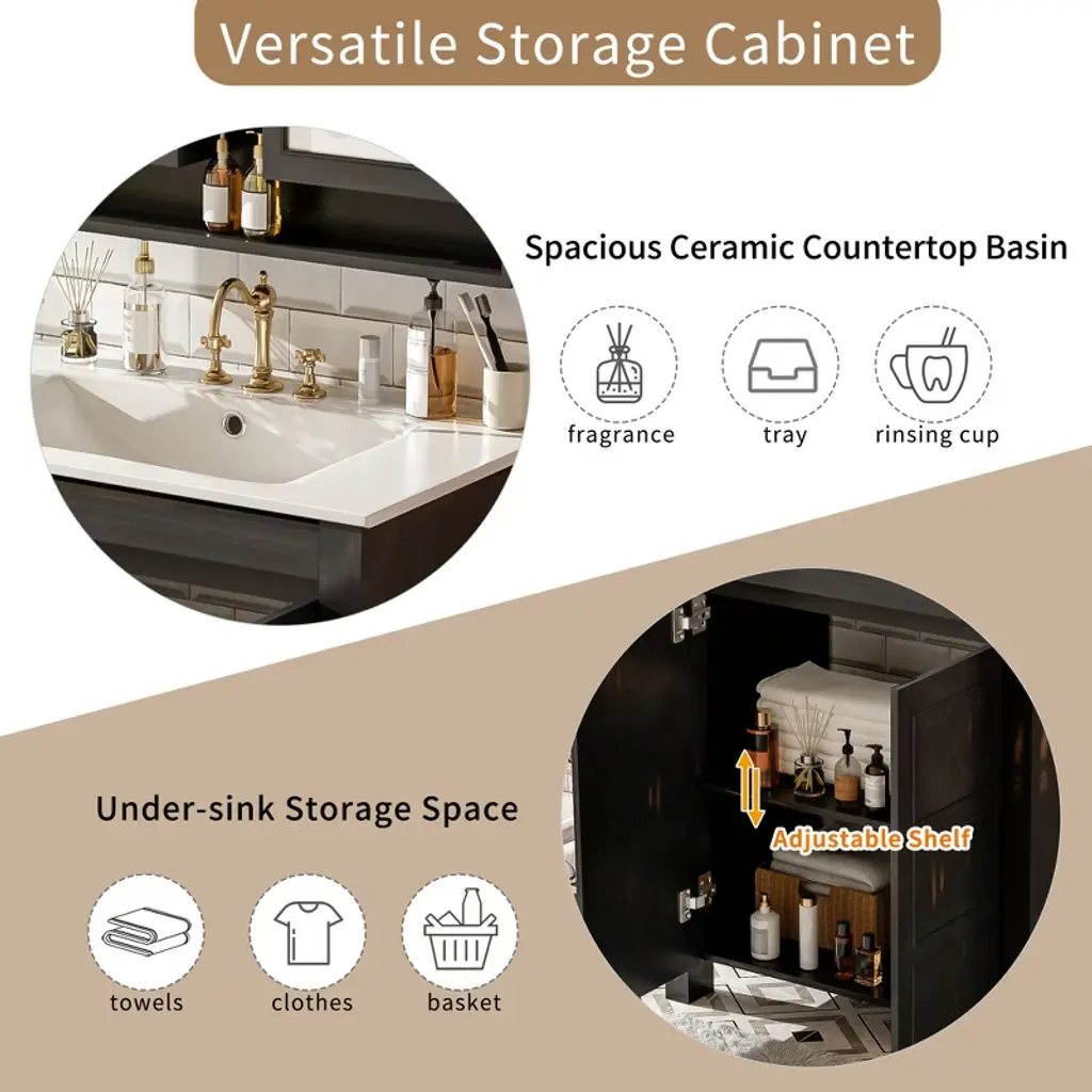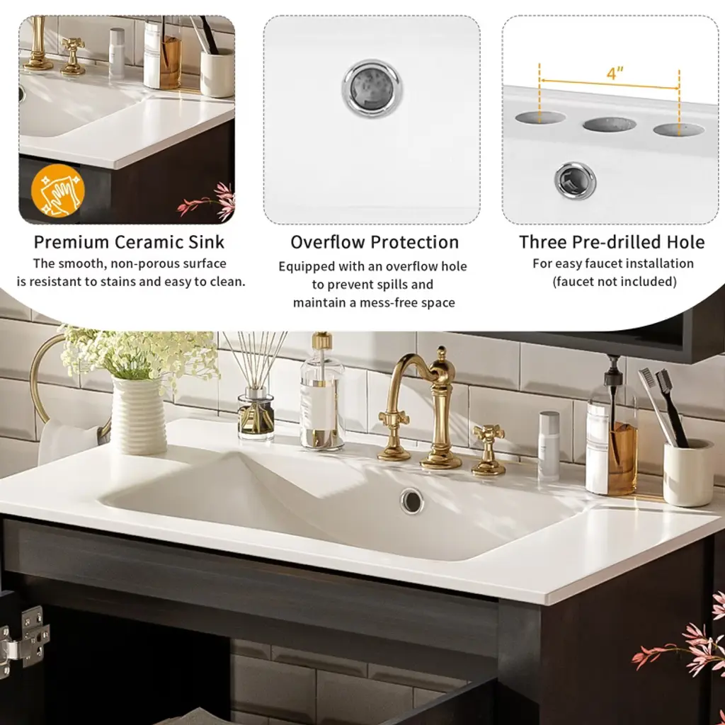 Upgrade your bathroom with the 30" Rustic Bathroom Vanity featuring a ceramic sink, perfectly suited for small to medium bathrooms. The rich coffee color and elegant design bring a fresh look to your space. The ceramic sink is easy to clean and includes an overflow hole to keep your bathroom dry. With spacious storage and adjustable shelves, it offers convenient organization, solving storage issues while enhancing both the functionality and beauty of your bathroom.