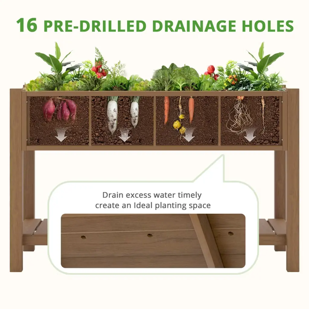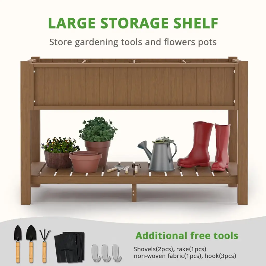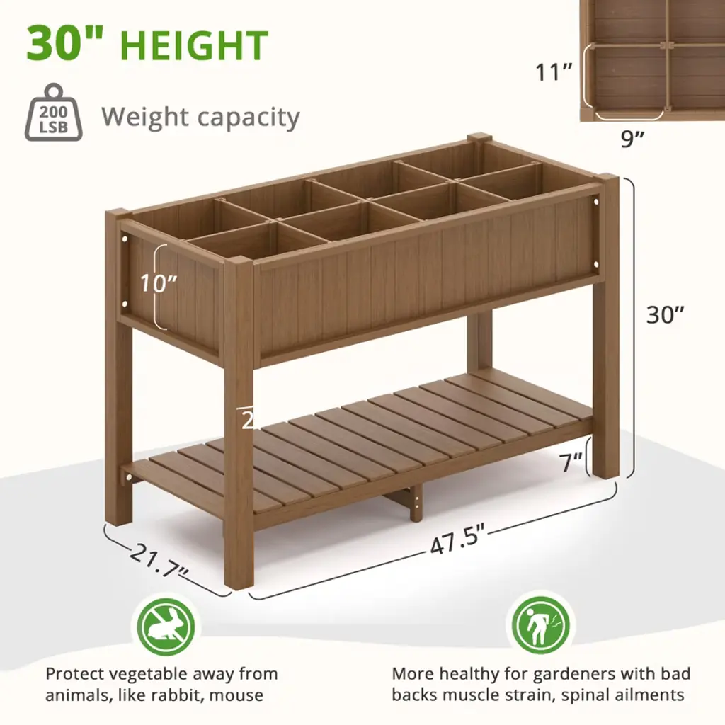 Sturdy Frame Construction: 47.5"L x 21"W x 30"H, 10"depth; Features an enlarged shelf for additional storage of agricultural tools; Accommodates approximately 3.1 cubic feet of soil, with a weight capacity of around 200 LBS Safe HDPS Material: Constructed from HDPS material that resists water absorption; Designed to avoid cracking, mustiness, or rot in various weather conditions; Requires minimal maintenance—simply wash with a hose to keep colors vibrant Customizable Garden Dividers: Each divider grid is removable to meet diverse gardening needs; Allows for the cultivation of different herbs and plants in separate compartments; Equipped with plastic pockets in the smallest grids to reduce nutrient loss Ergonomic Height: Stands 30 inches tall to safeguard plants from animals, weeds, and pets; Ideal for gardeners who prefer not to bend down or lean over; Supports comfortable gardening for users of all ages Included Tools: Comes with non-woven fabric, a rake, two shovels, and three hooks