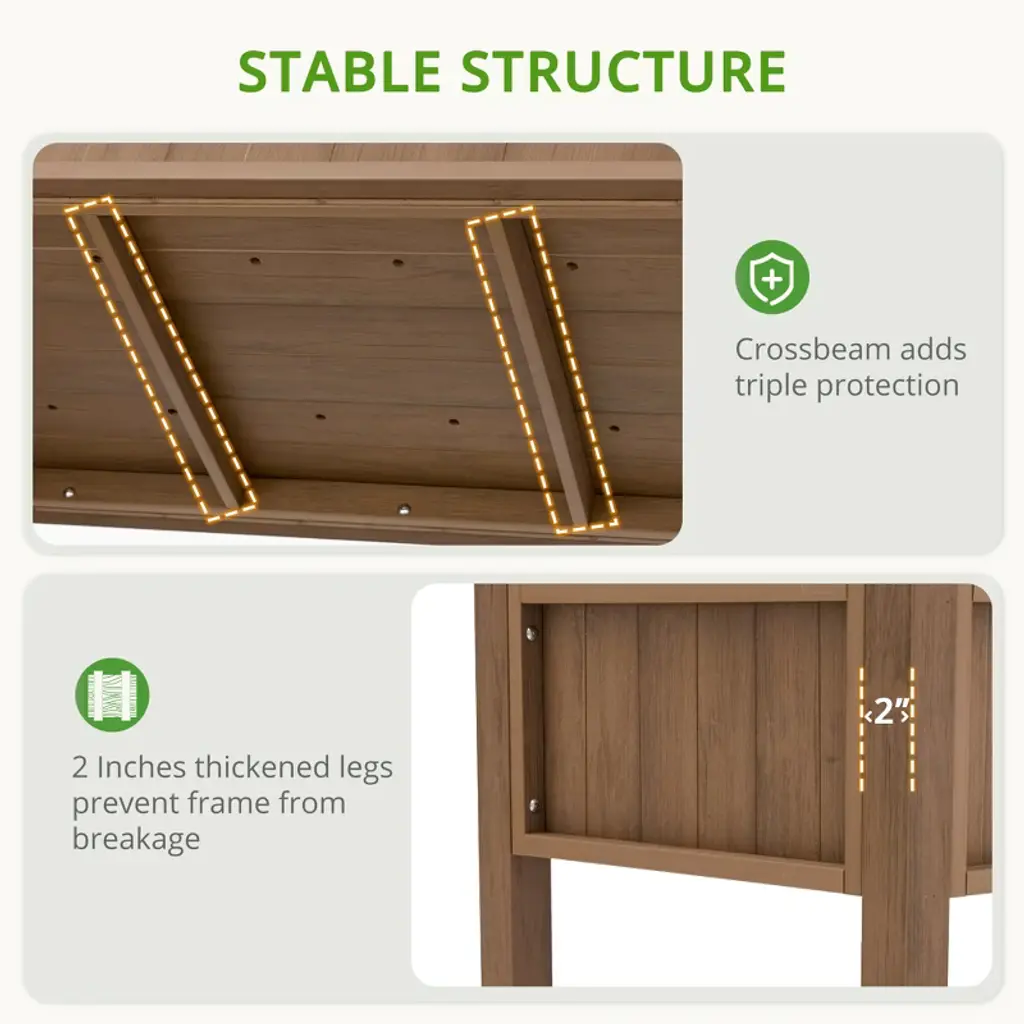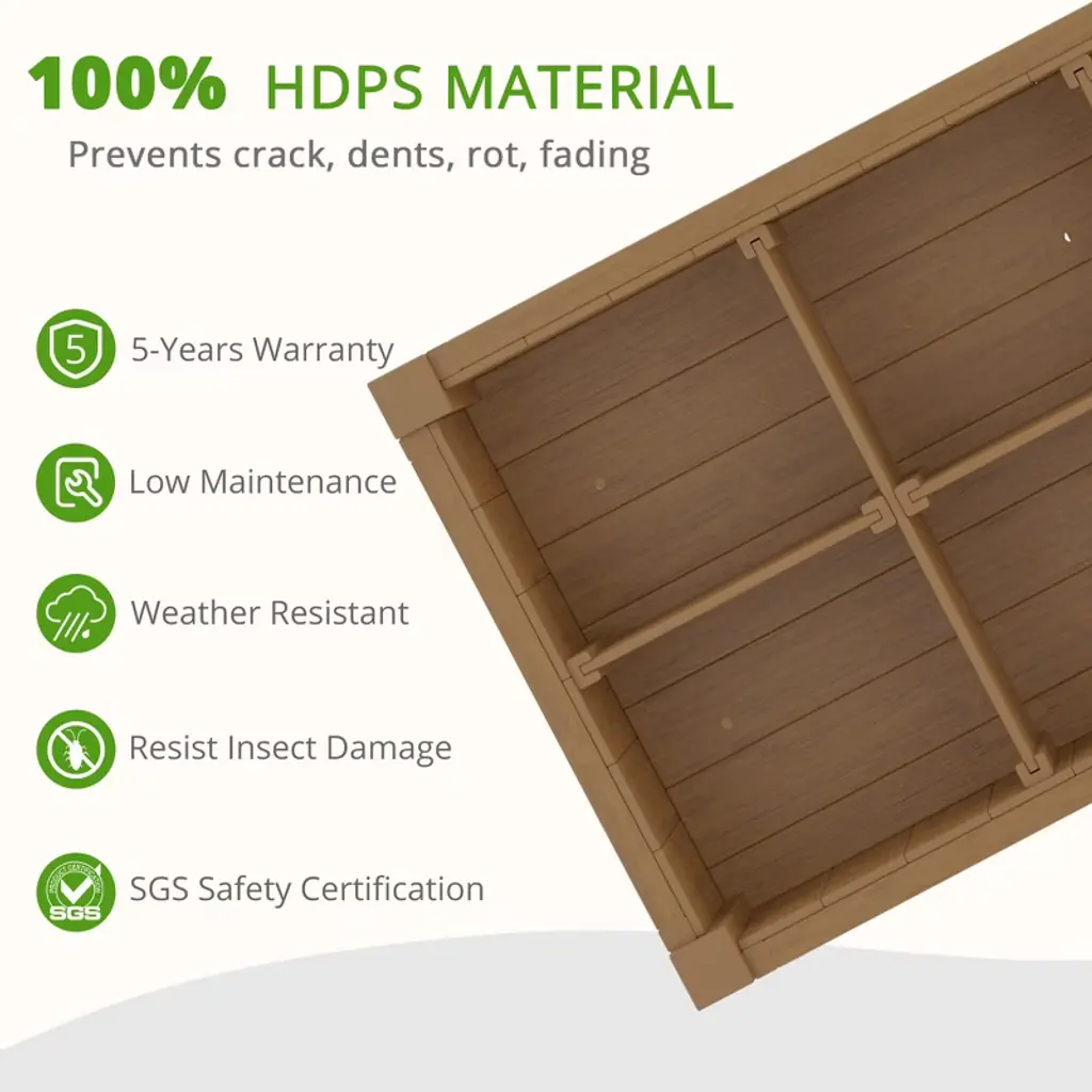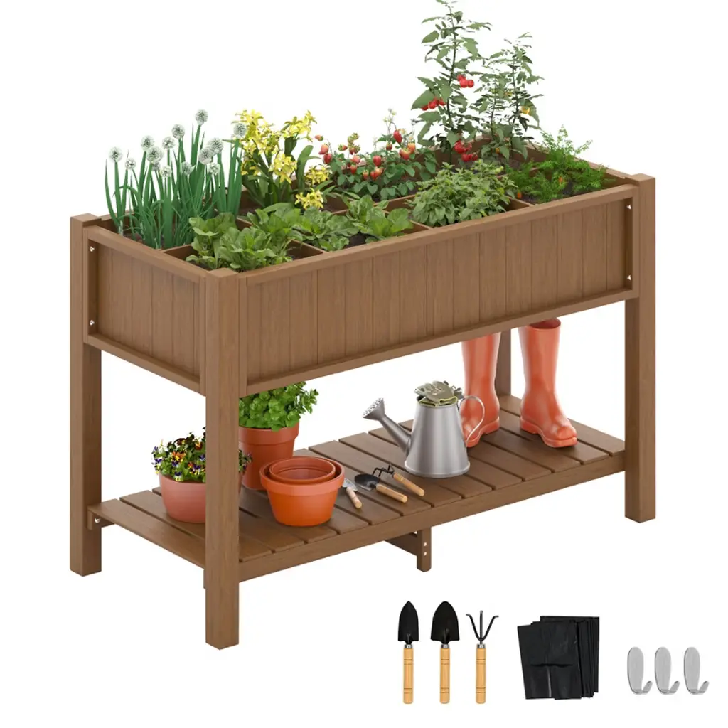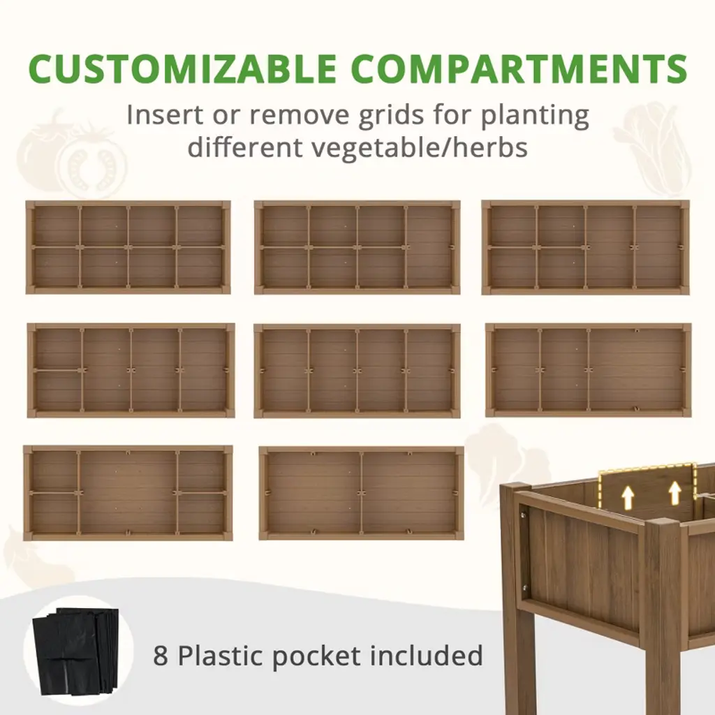 Sturdy Frame Construction: 47.5"L x 21"W x 30"H, 10"depth; Features an enlarged shelf for additional storage of agricultural tools; Accommodates approximately 3.1 cubic feet of soil, with a weight capacity of around 200 LBS Safe HDPS Material: Constructed from HDPS material that resists water absorption; Designed to avoid cracking, mustiness, or rot in various weather conditions; Requires minimal maintenance—simply wash with a hose to keep colors vibrant Customizable Garden Dividers: Each divider grid is removable to meet diverse gardening needs; Allows for the cultivation of different herbs and plants in separate compartments; Equipped with plastic pockets in the smallest grids to reduce nutrient loss Ergonomic Height: Stands 30 inches tall to safeguard plants from animals, weeds, and pets; Ideal for gardeners who prefer not to bend down or lean over; Supports comfortable gardening for users of all ages Included Tools: Comes with non-woven fabric, a rake, two shovels, and three hooks