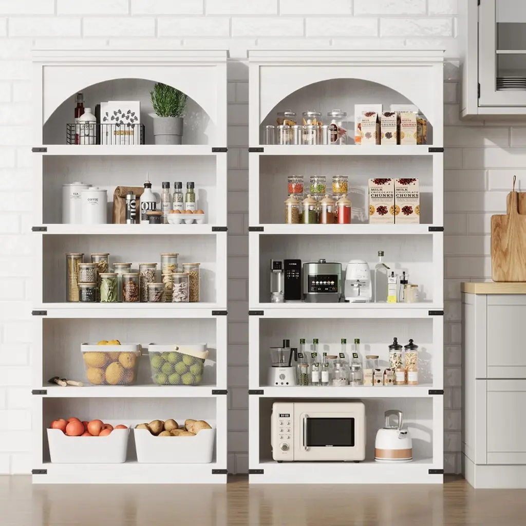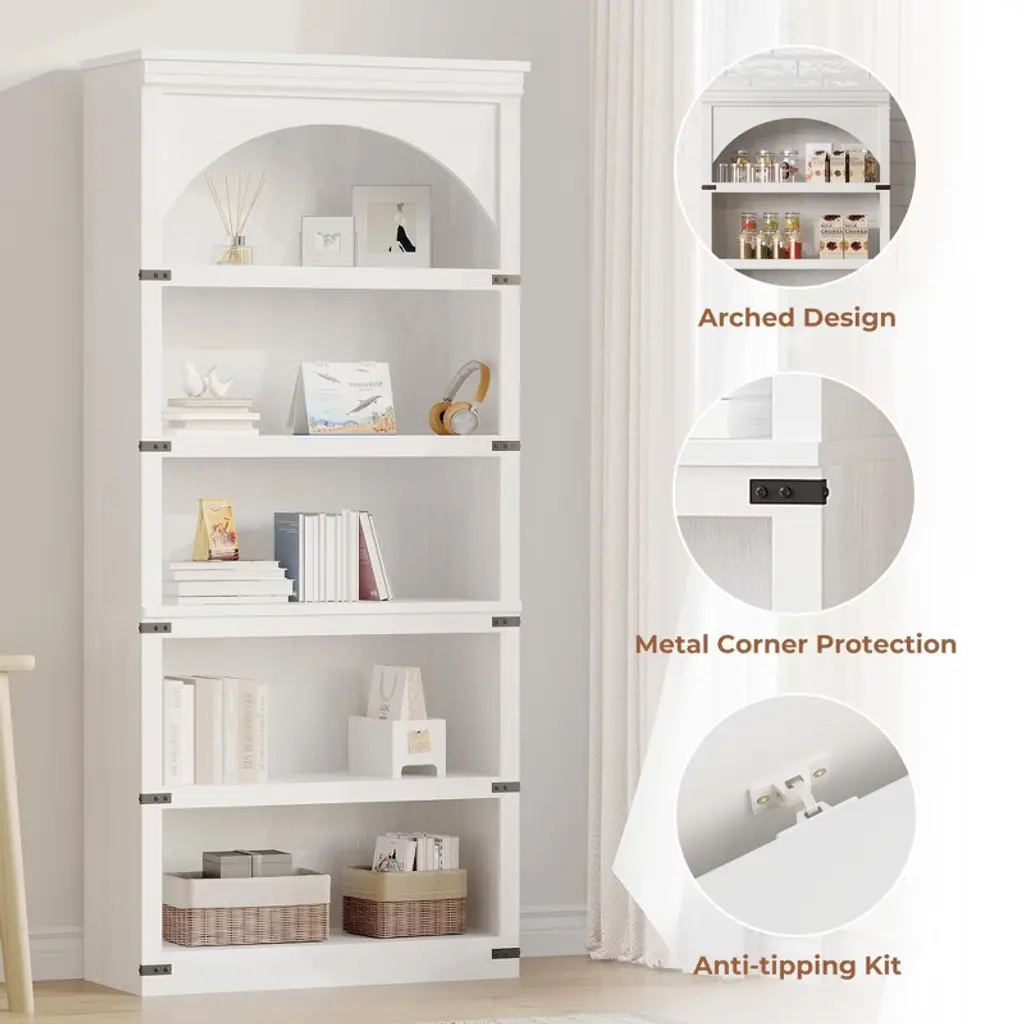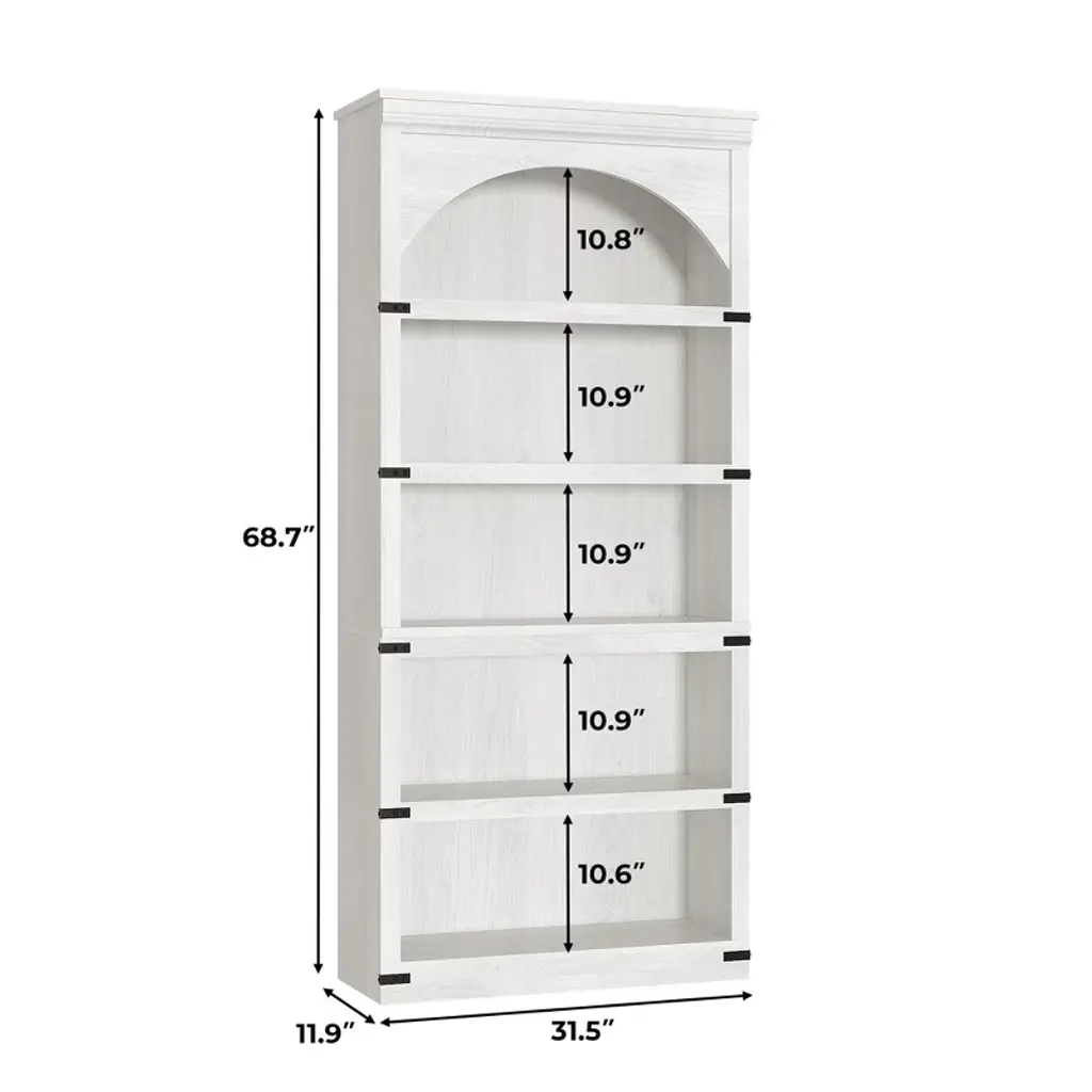 Arched 5-shelf Bookcase 68.7 Inch Tall, Farmhouse Wooden Storage Shelf For Home Office, Living Room, White