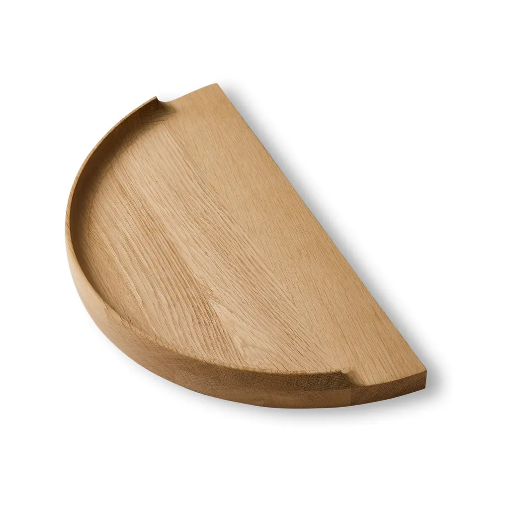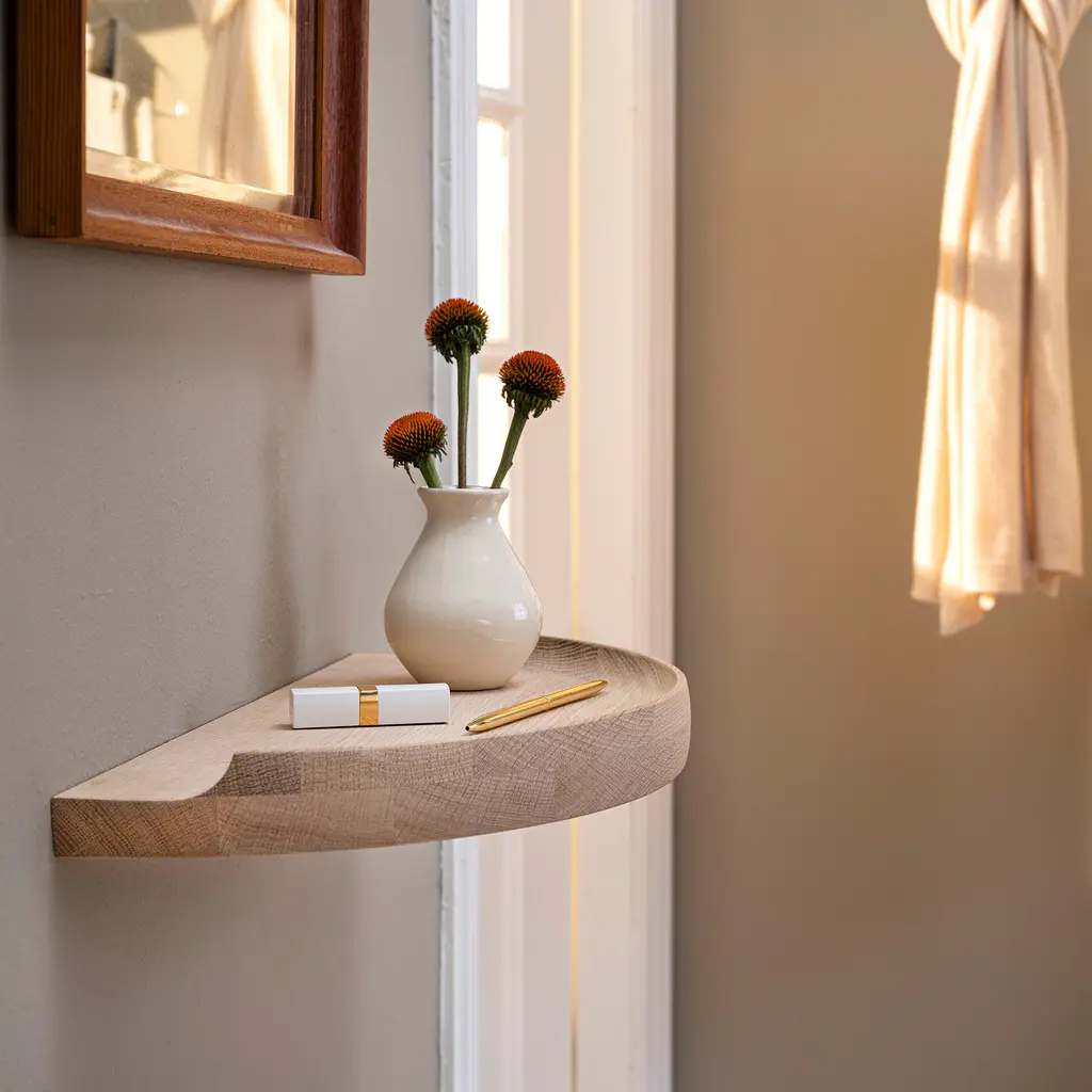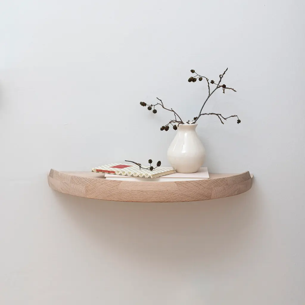 Traditional craftsmanship and the elegance of Danish furniture design come together in the Intarsia Furniture Arcus Console Shelf. Giving a nod to the furniture designs created by Jørgen Aakjær Jørgense in the 1950s, this shelf is a modern classic. It boasts a semicircle shape and a chamfered border that reflect the heritage and lasting impact of Danish mid-century modern design. Crafted by hand, the Arcus Console Shelf is made from solid oak to enhance your home décor with the textures of the natural material. The white oiled, smoked and natural oil versions each offer something different aesthetically, but all three look at home in any living space. Install this shelf in a bedroom as a bedside table, in a living room to display decorative items, or in an entryway to keep essentials and EDC objects accessible.