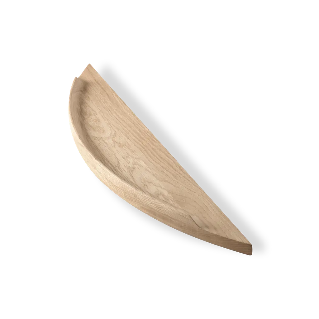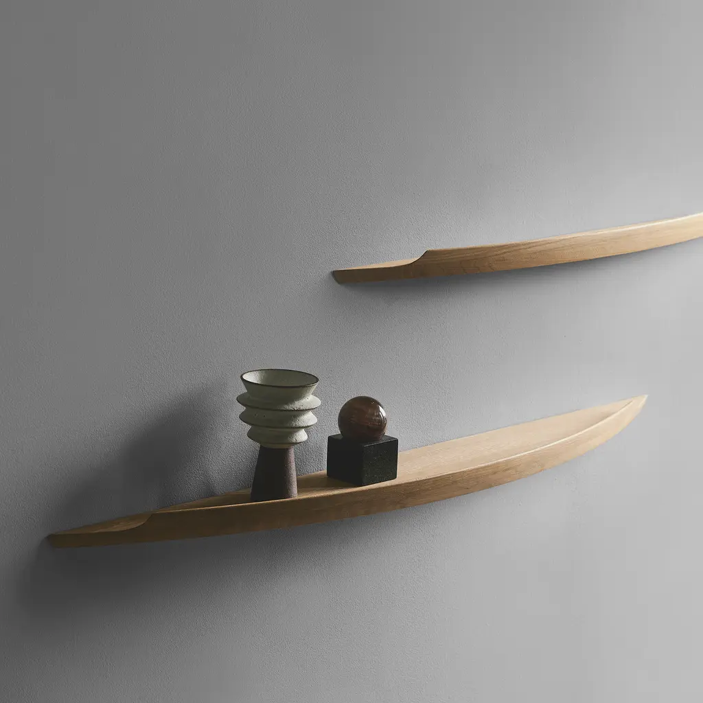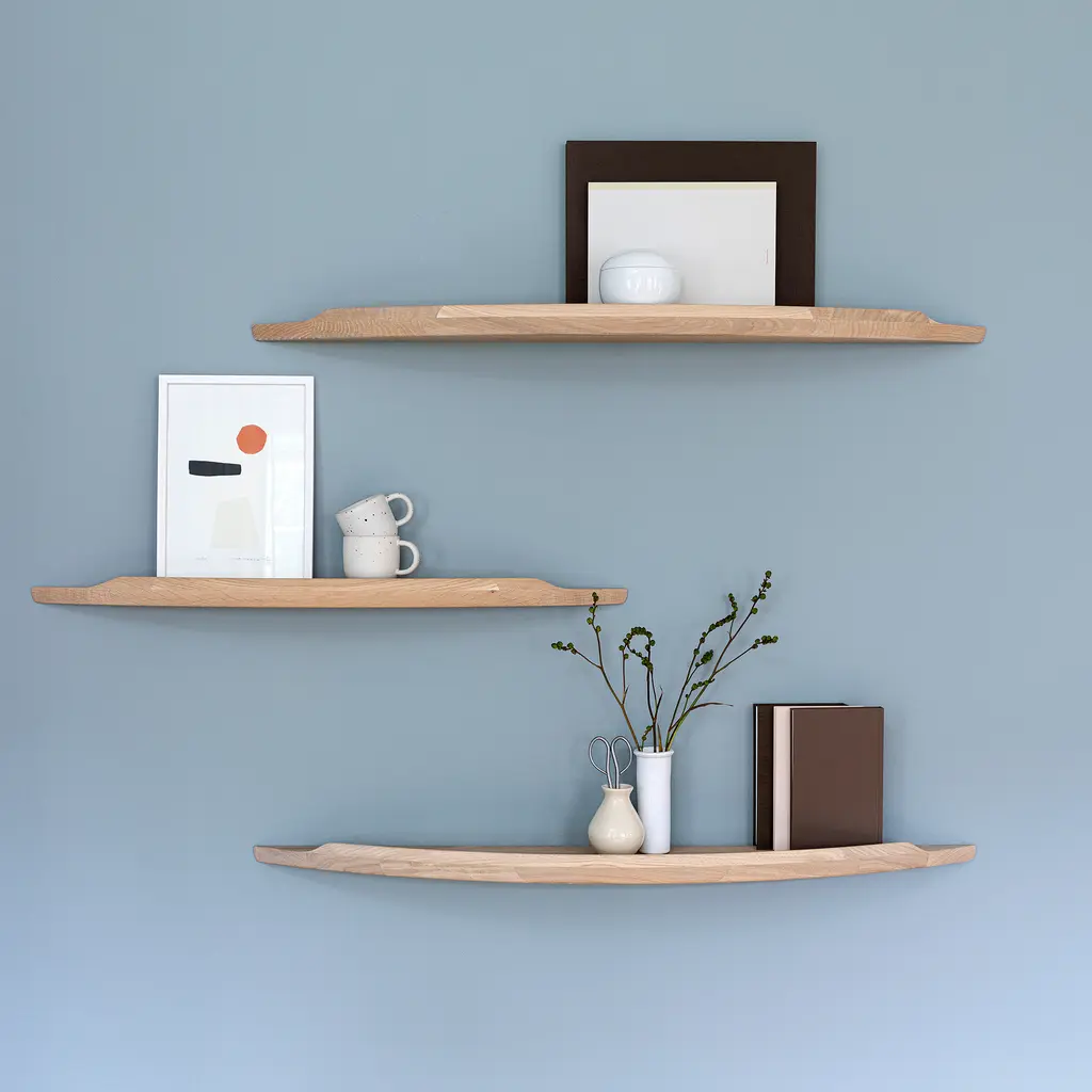 The largest shelf from the Arcus shelf series adds extra visual impact to your home décor. Whether used individually or installed in a configuration with the small and medium shelves from the same collection, Arcus offers a refined solution to display art, family photos, vases, and decorative objects. Designer Nanna Aakjær Svendsen referenced the furniture designs created by her grandfather Jørgen Aakjær Jørgensen, resulting in an organic shelving system that is as practical as it is beautiful. This shelf features a chamfered edge and curves to make a variety of items look their best. Every Arcus Shelf, Large is handmade from solid oak and comes in three versions: natural oil, smoked, or white oil finishes. A console shelf from the same series is also available.