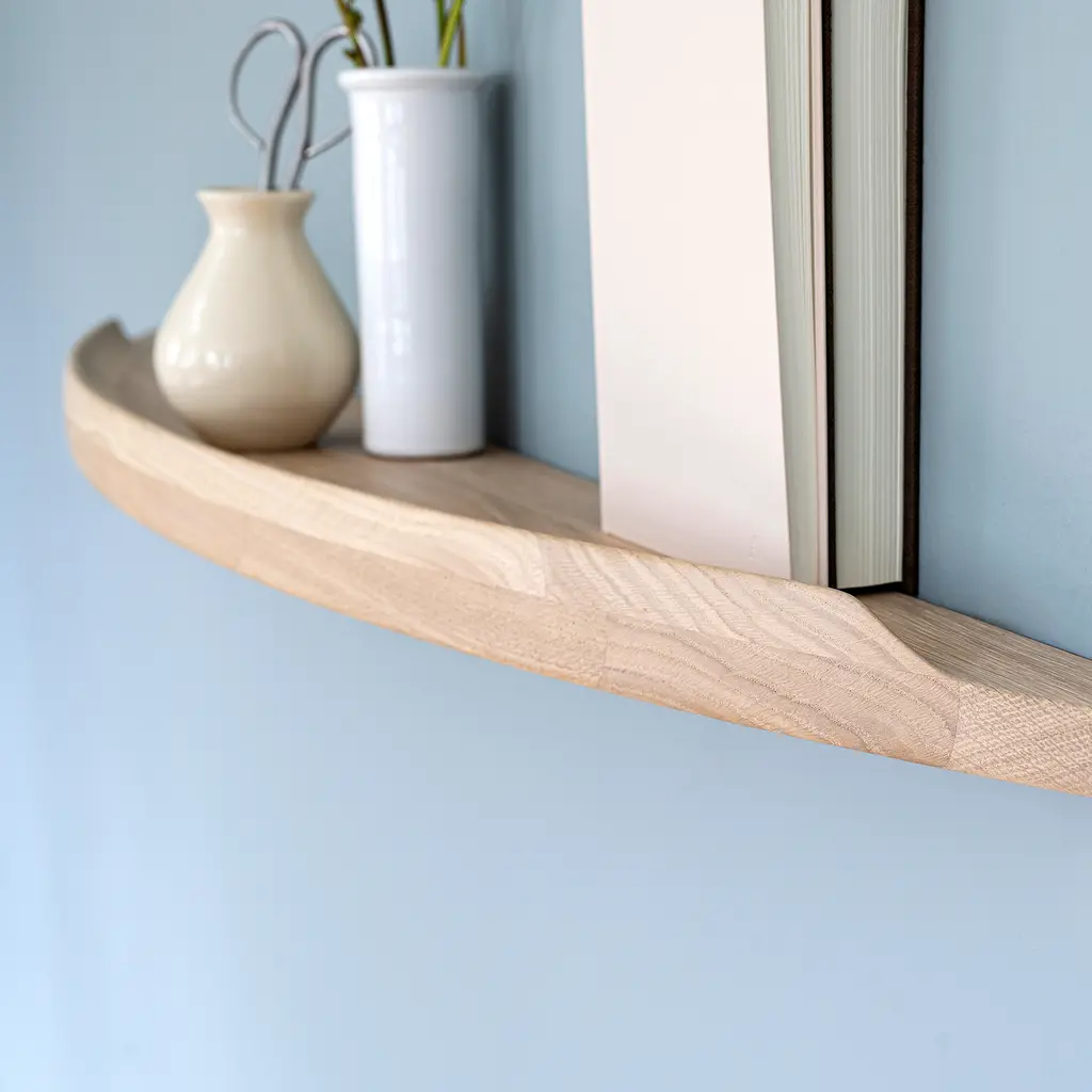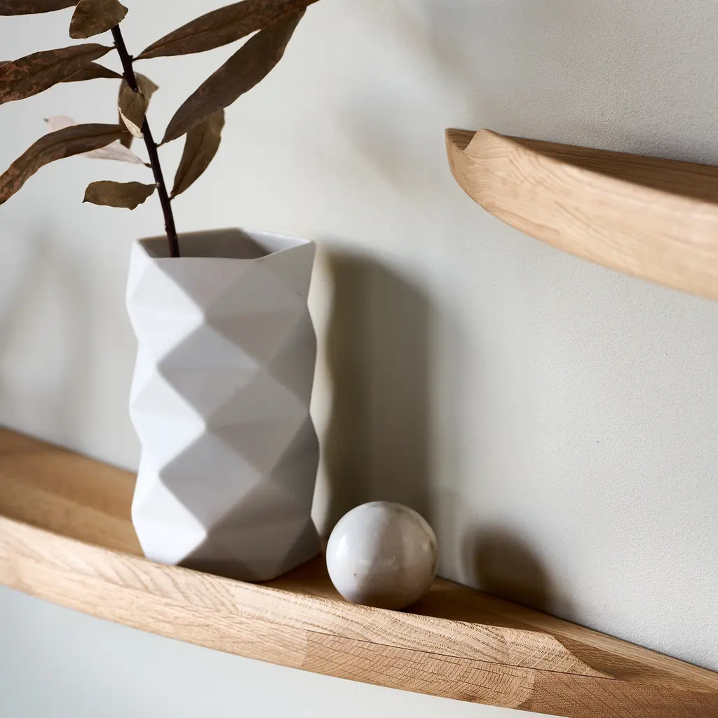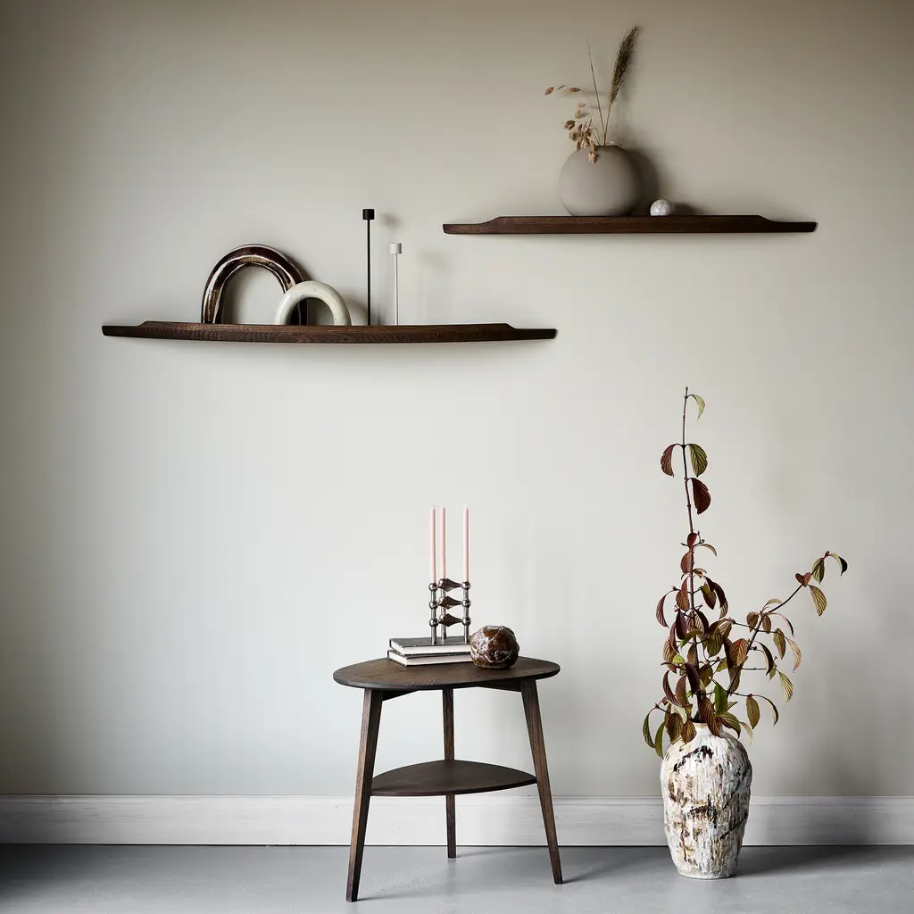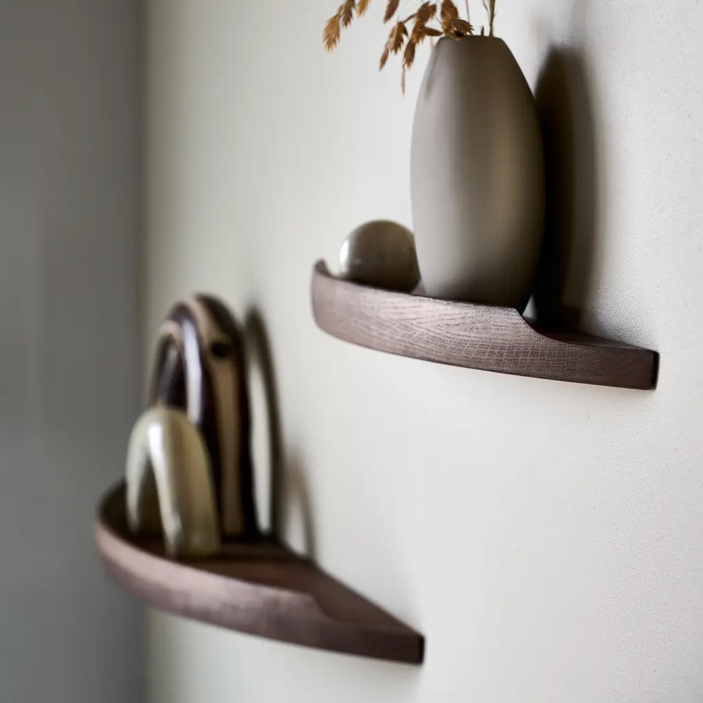 Danish furniture design traditions are gracefully reinterpreted in the Arcus Shelf, Medium. Created by Nanna Aakjær Svendsen as an homage to her grandfather’s classic furniture designs, this shelf features an elegant chamfered edge and a curved silhouette. The organic shape of Arcus makes it perfect as a functional object that also serves an aesthetic purpose. Installed on a wall in a living room, bedroom or home office, it adds a refined accent to any décor while presenting decorative objects, books, vases and more in an elegant way. Crafted by hand from solid oak, the medium version of the Arcus shelf comes with natural, smoked, or white oiled finishes. Small and large versions of this shelf are also available.