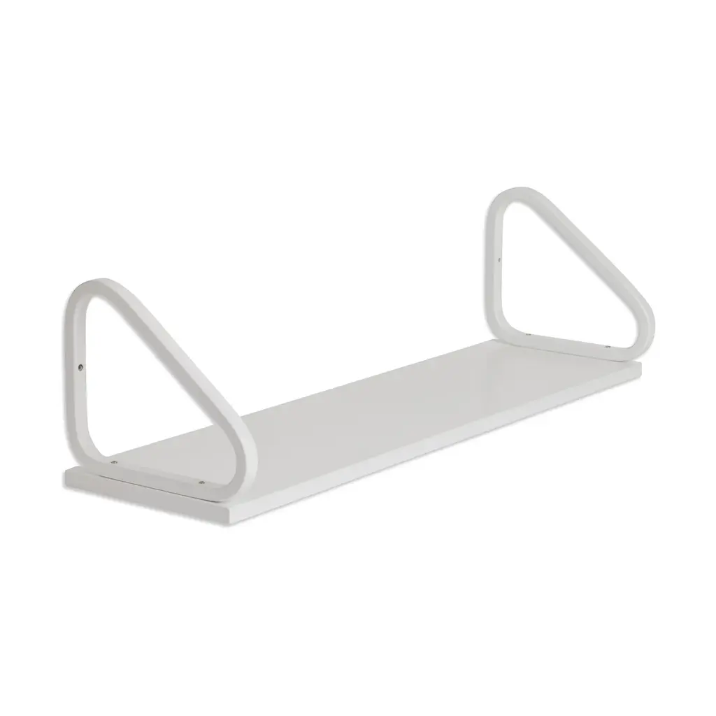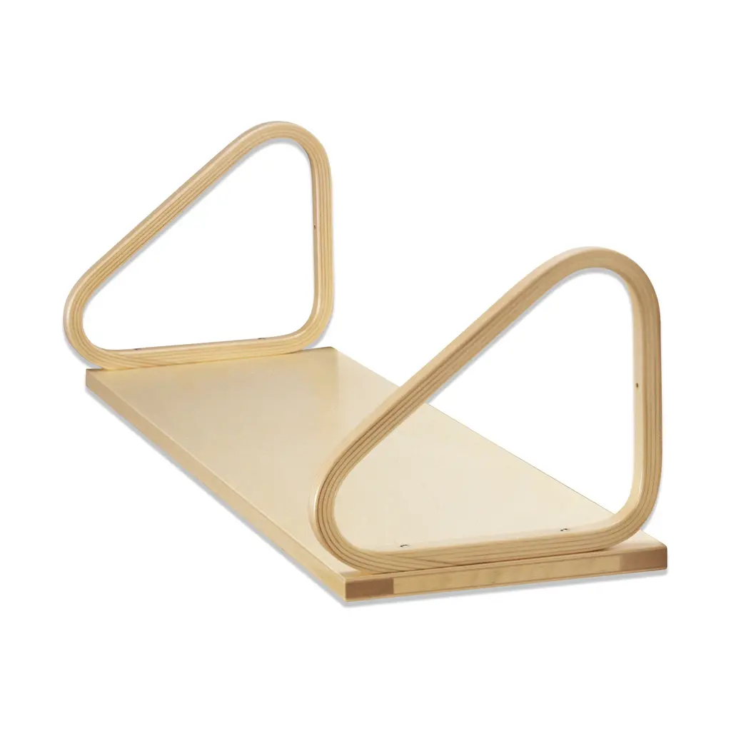 Supported by form-bent birch wood loops that act as brackets, the Wall Shelf 112B is an elegant and practical storage solution for your home. Designed in 1936 by Alvar Aalto, this shelf offers two ways to attach it to your wall, with the brackets either below or above the panel, in which case the loops can be used as bookends. Use the Wall Shelf 112B for books, objets, towels, toys, plants and more. Made in Finland from solid birch, the Wall Shelf 112B measures 9.75h x 35.5”w, with 10.5”w brackets. Some assembly required. Both Alvar Aalto and the shelf’s manufacturer, Artek, have work in MoMA’s collection.
