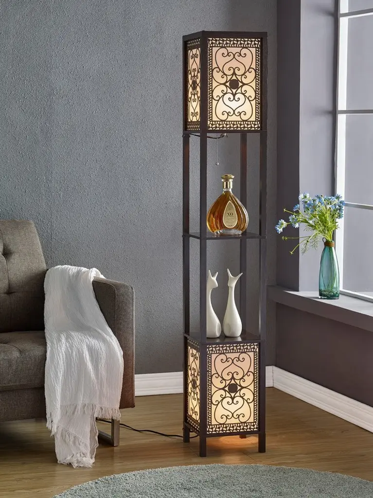 Light up your living room, bedroom or office with this sleek and modern "Infinity Heart" 2-Light floor lamp from Artiva USA. A perfect addition to any rooms with modern or contemporary /Asian decors. The Infinity Heart shade panels adds a soft note to your decor. Standing over 5 feet, the fixture has small floor print and draws attention. This Artiva Shelf lamp provides ample lighting suitable for reading, writing or creating a spot light in the setting behind/next to the couch, in the corner or in the center of your living room. Features 2-display Shelf for your favorite collectibles, Vases, books and etc. Smart Outlet Compatible. Works with Smart outlets that Alexa, Google Home assistant or Apple HomeKit enable to turn the lamp on/off.2 Light Infinity Heart decorative Shade Panels2-Large display Shelf size: 10.25"X 11"x16"HHeavy Duty off- white Fabric/pvc Shade 8.5X13.5"hPull Chain On-off Switch. Smart Outlet Compatible . Works with Smart outlets that are Alexa, Google Home assistant or Apple HomeKit enabled to turn the lamp on/off.Versatile Design . Made with heavy duty MDF Wood in Expresso finish.US Patent Pending Design US D934, 487 S