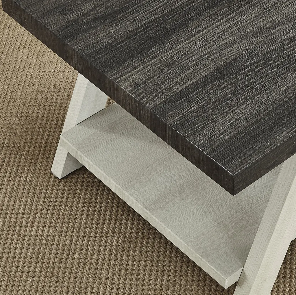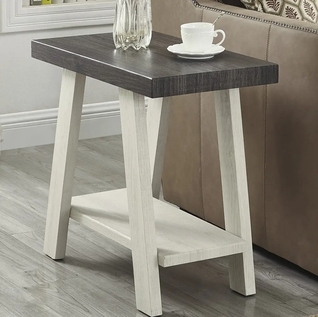 Side table with a weathered charcoal finish on table top and beige finish on the base Features overextended rectangular top and a splayed-leg look. A shelf underneath the table top provides extra storage space The table is constructed of high-quality manufactured wood Dimensions: 14"W x 23.5"D x 22"H. Table top thickness: 1.77" Some assembly required. Photo may be slightly different from the actual item in terms of color due to the monitor's display
