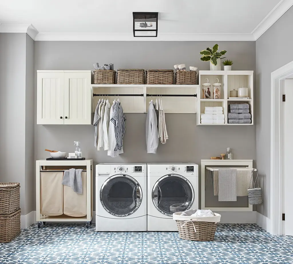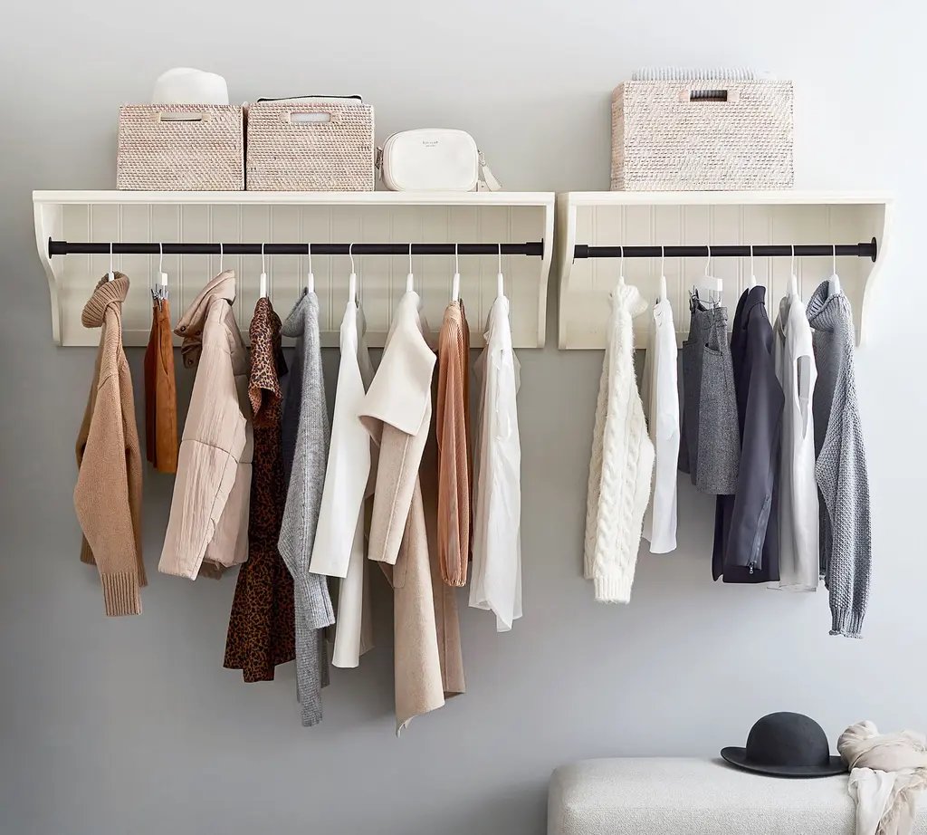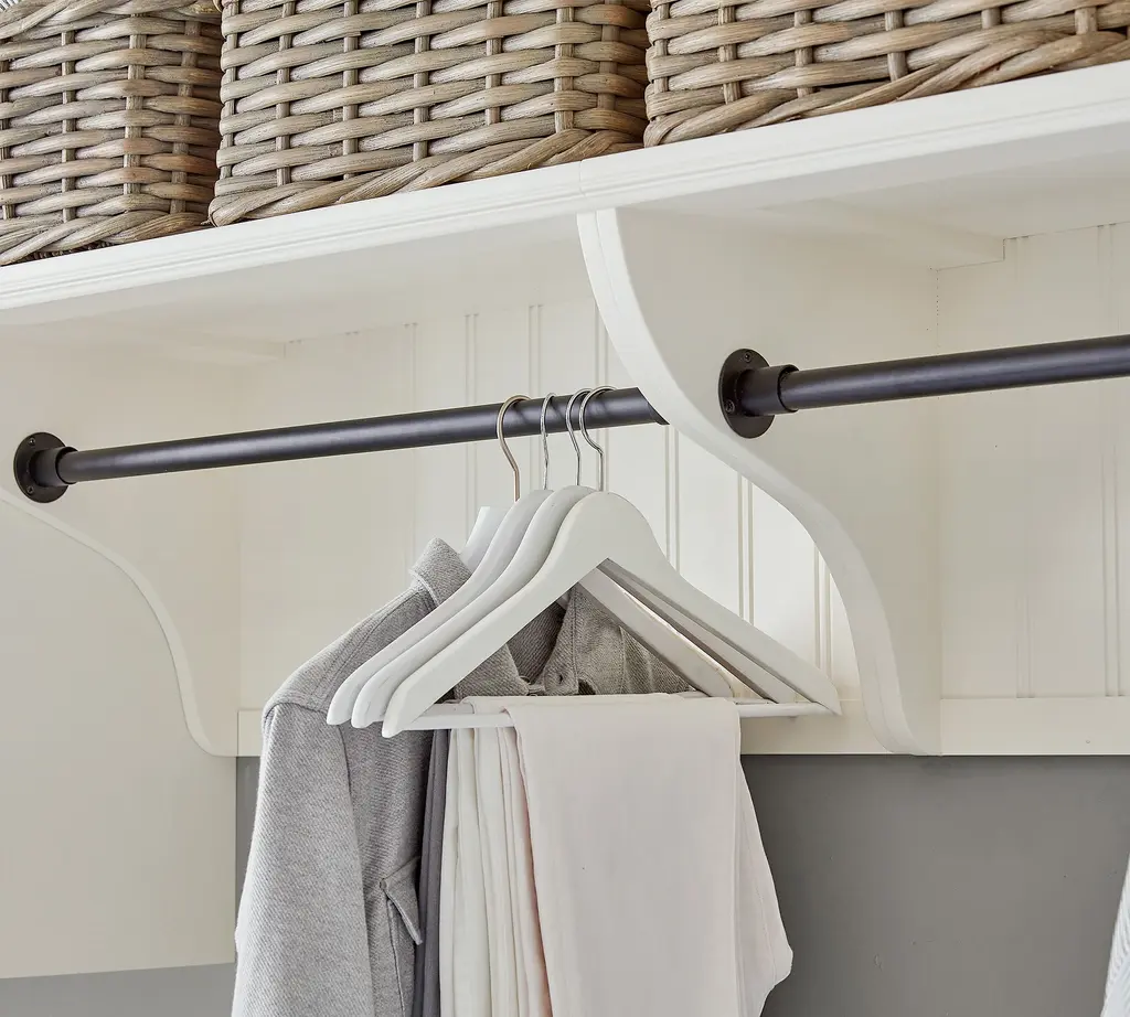 Our iconic Aubrey Collection expands into the hardest working room of the house with stylish solutions in countless configurations. With a multifunctional, wall-mounted design for air-drying delicates and steaming stubborn wrinkles, this shelf with closet rail is part of a full laundry organization system that even fits into those makeshift nooks or multipurpose mudrooms. Boasting handsome details like beadboard paneling, crown molding, and plinth bases, this collection is built so that the components fit flush together for seamless style.