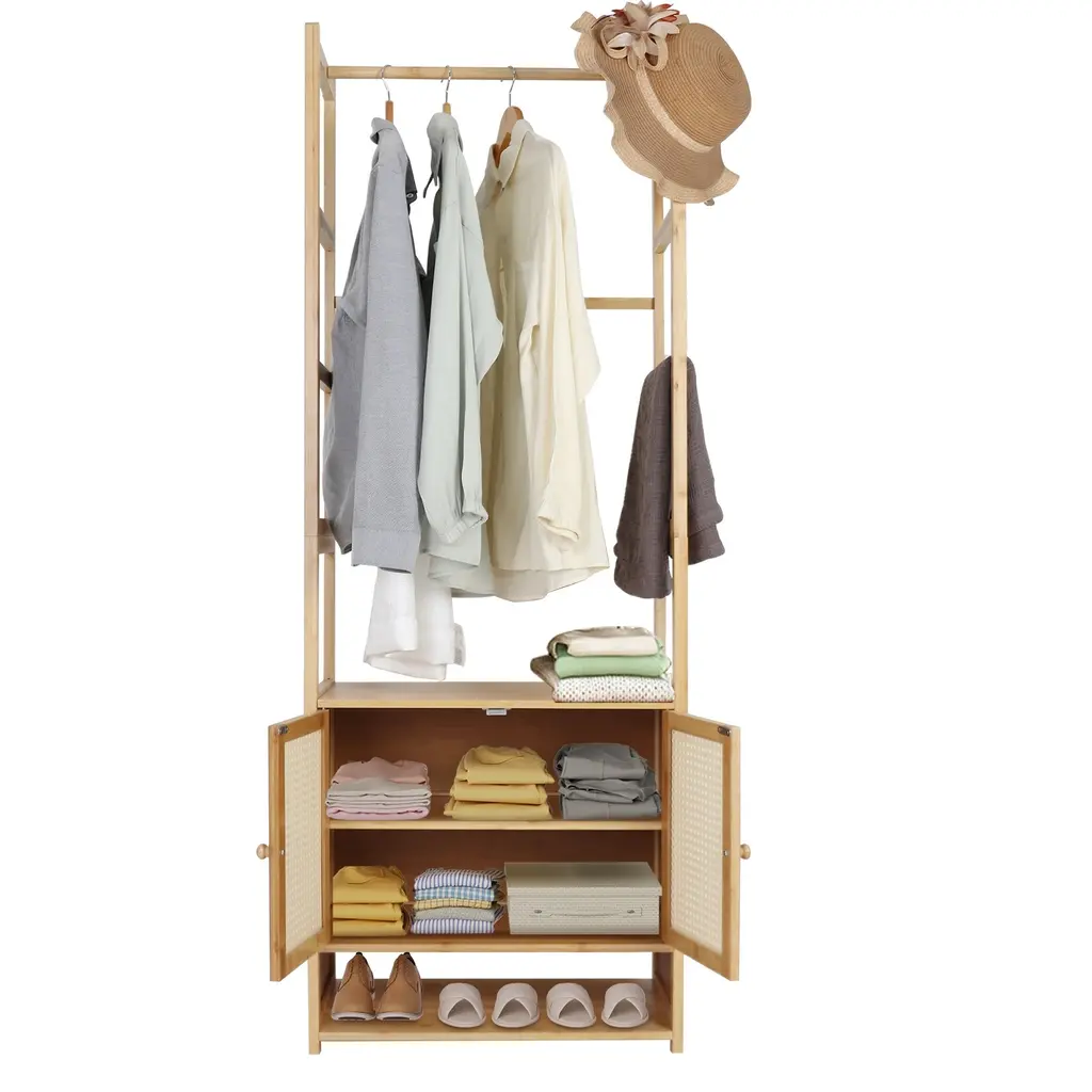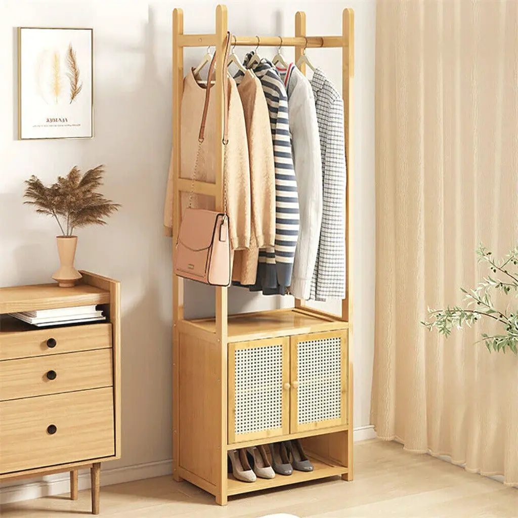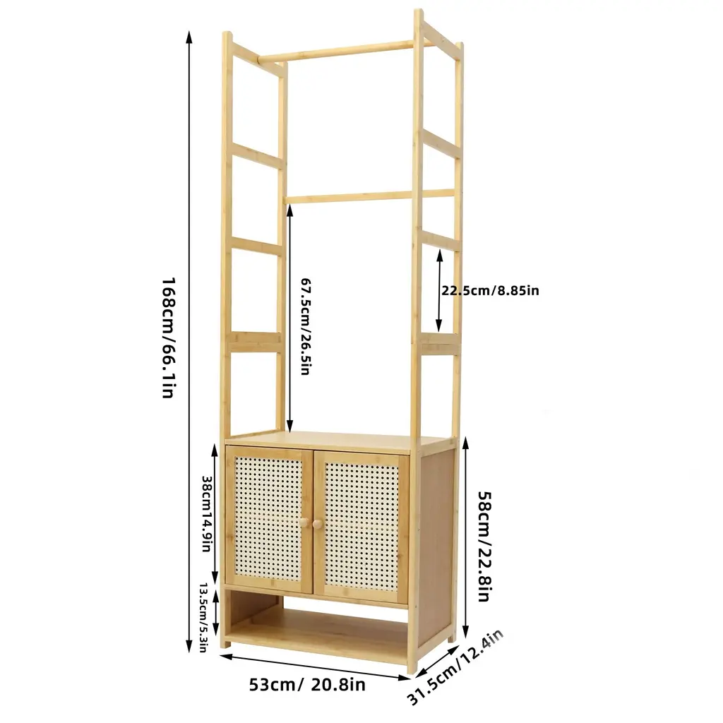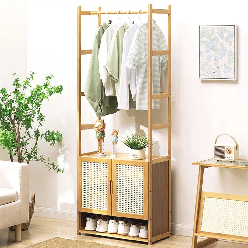 Bamboo Clothes Rack Stand With Cabinet Andshoe Shelf - Brown
