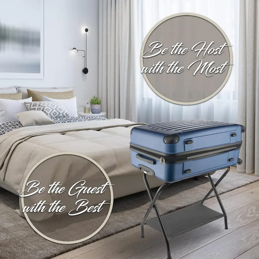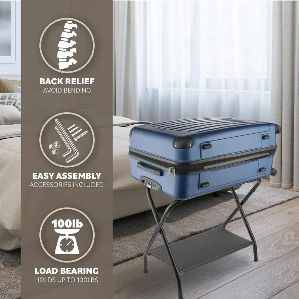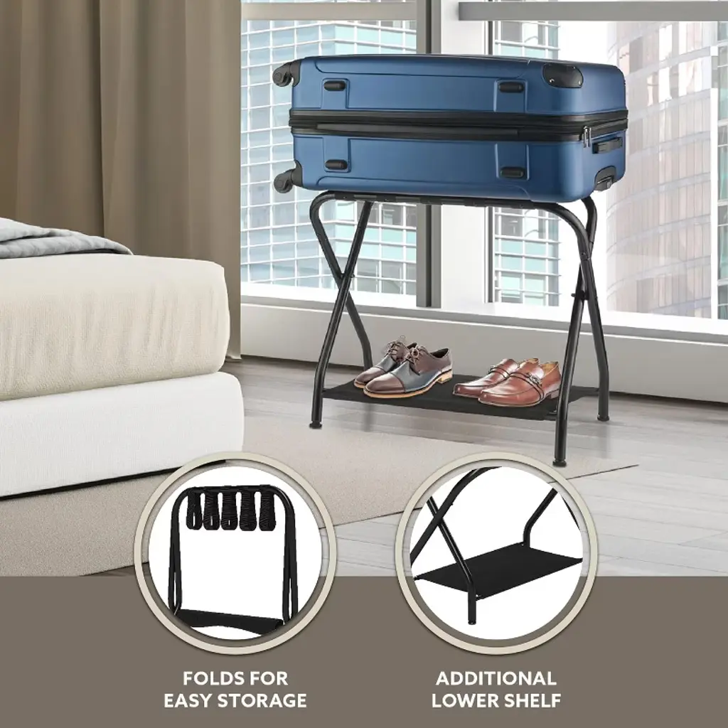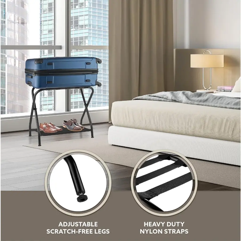 Upgrade your hospitality game and streamline your home with the Bartnelli 2‑Pack Premium Luggage Rack with Folding Storage Shelf—a stylish, functional essential designed for convenience and durability. Picture welcoming overnight guests into your home or hotel room: no clutter, no mess—just polished, organized comfort. With this matching set of two luggage racks, you can offer everyone a stable, dignified place for their suitcase. Each rack unfolds to a generous 26.9″ long × 13.3″ wide × 22.6″ high platform—ideal for standard to oversized luggage. Crafted for longevity, each rack features baked-finish steel tubing combined with rugged nylon straps, providing unbeatable support up to 100 lb (45.4 kg). From stacked trunk-style luggage to soft duffels, your luggage stays secure and stable. The non-slip PP plastic feet prevent scratching and shifting on tile, wood, or carpet—a thoughtful touch that shows craftsmanship. But what truly sets it apart is ease of storage. Each rack collapses flat to a slim 26.9″ × 4.5″ × 26.6″, slipping effortlessly into a closet, behind a door, or under a guest bed. Imagine pulling one out when guests arrive, then sliding it back out of sight in seconds—no hassle, no fuss. This rack isn’t just practical—it’s built for atmosphere. A sleek black finish adds a modern, polished look in any room, from boutique hotel to chic guest suite. And with straightforward assembly, you can have them ready in minutes—no tools, no frustration. Imagine the toolkit—one rack under a duffel for last-minute packing, another as a stylish makeshift side table during your trip. In hospitality or home, this luggage rack set brings ease, elegance, and smart functionality together.