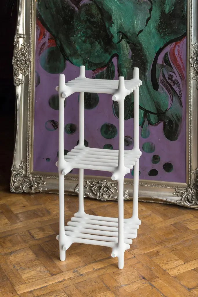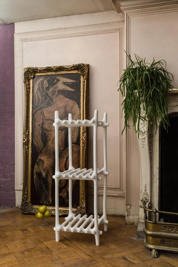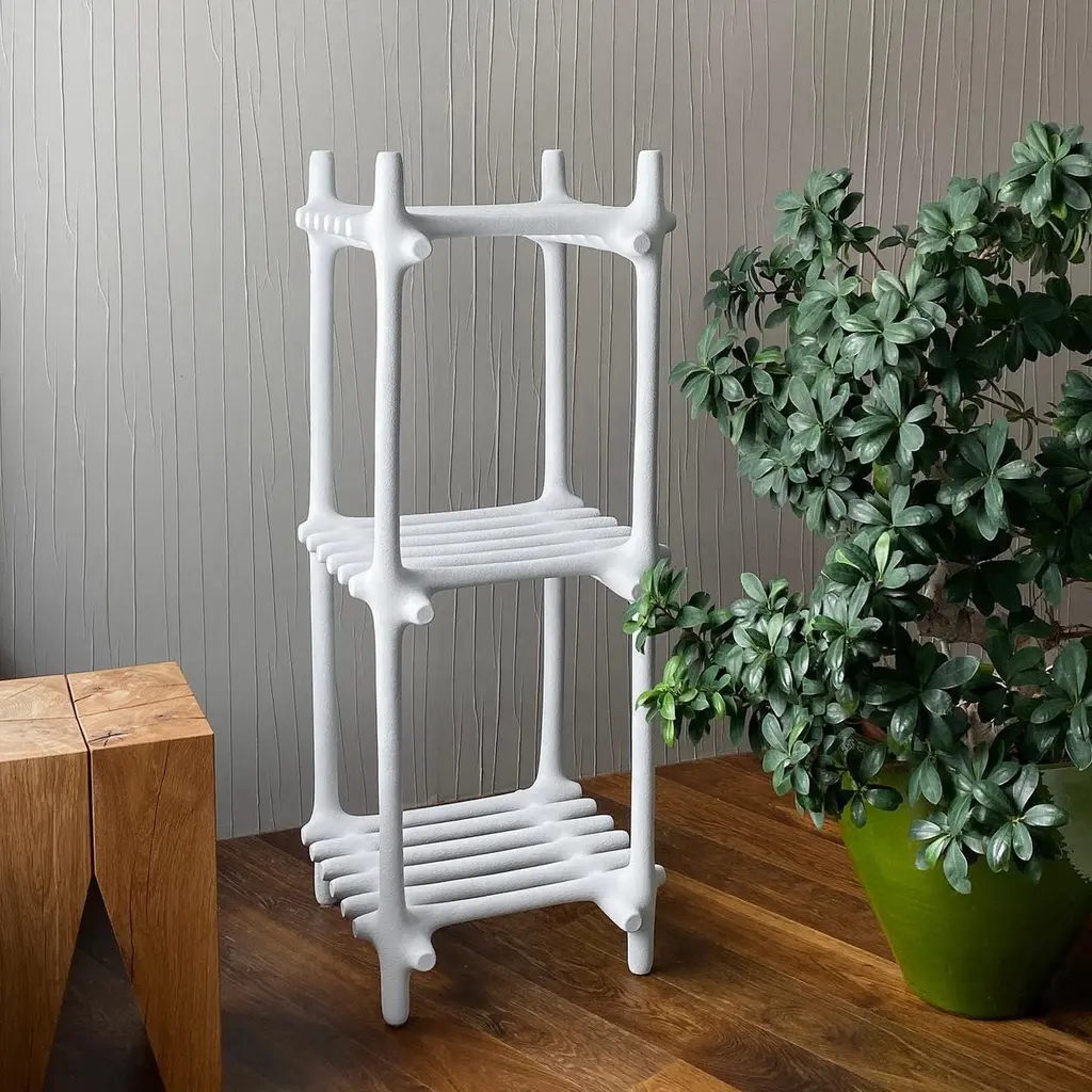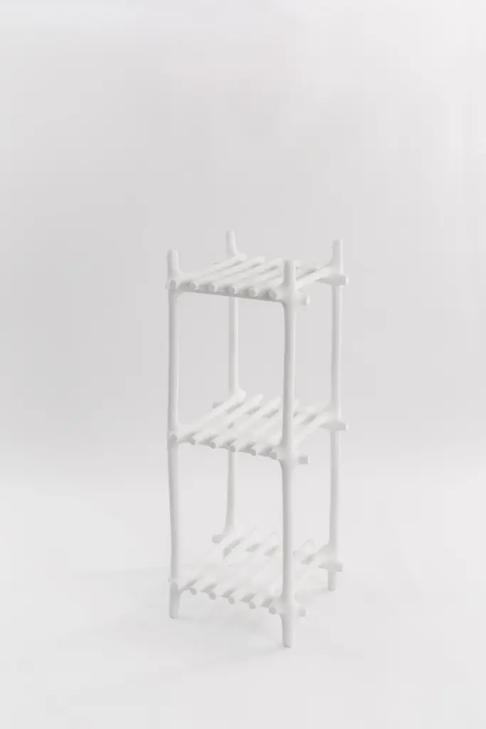 Basic Limited Edition Sustainable Sand and Nylon Shelf by Hot Wire ExtensionsLimited editionMaterials: Waste SLS 3D nylon powder, Sand from sustainable sourcesDimensions: H 112 x W 42 x D 42 cm Colour: whiteHot Wire Extensions is a young sustainable design brand, presenting a bold innovative manufacturing process.Exploration is central to our philosophy and the Hot Wire Extensions process is conceivedwith this in mind. Using waste SLS 3D nylon powder, a material that is currently not recycled, and inspired by the way a vine grows around a tree, we reuse the material to create organic bone-like structures builtaround a wire.We design and develop a diverse range of products, furniture and installations as well as bespoke commissions all characterised by our dedication to the mindful exploration ofnew material landscapes.