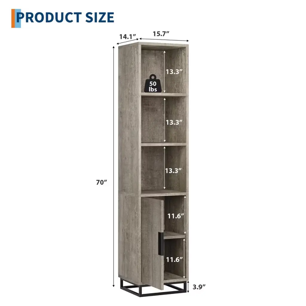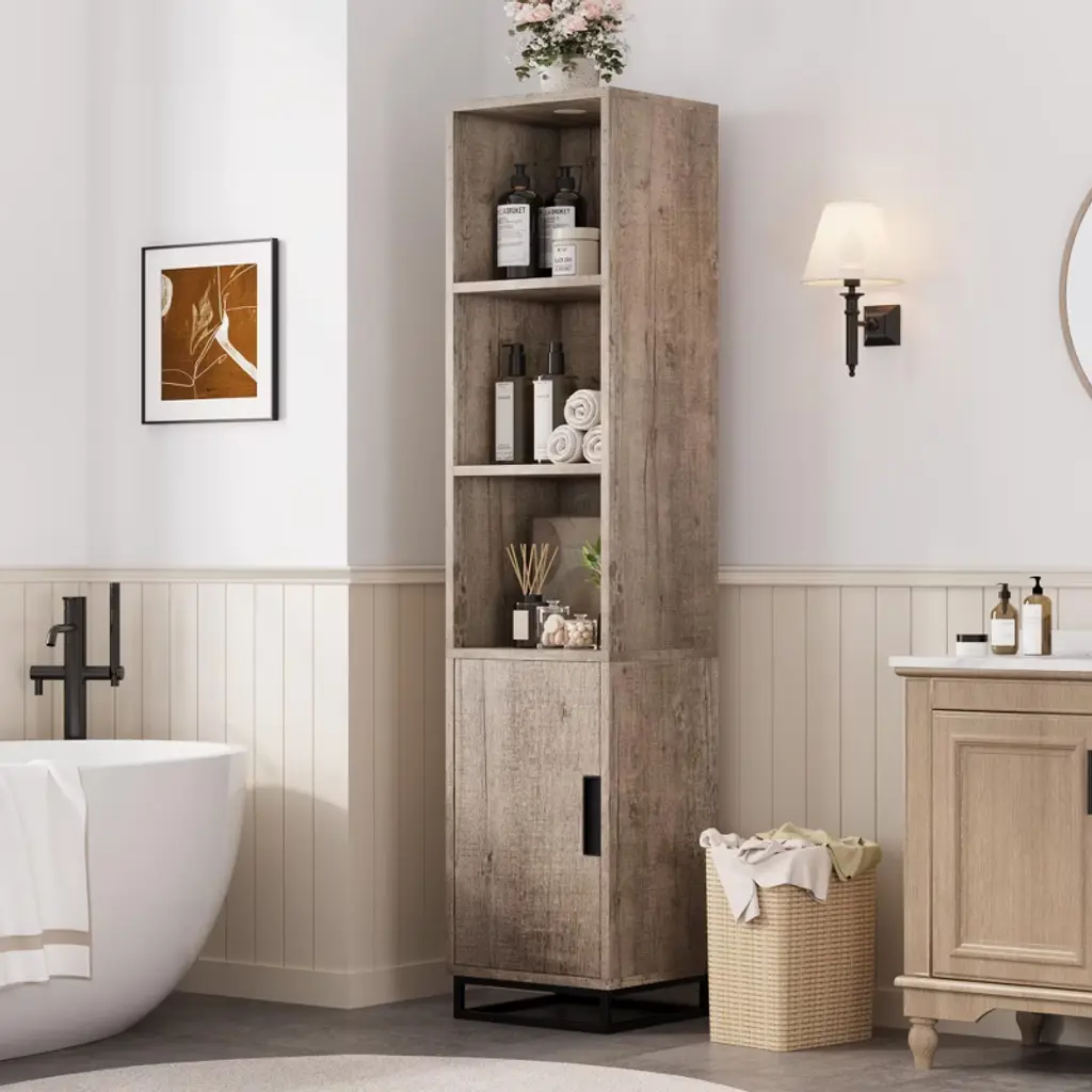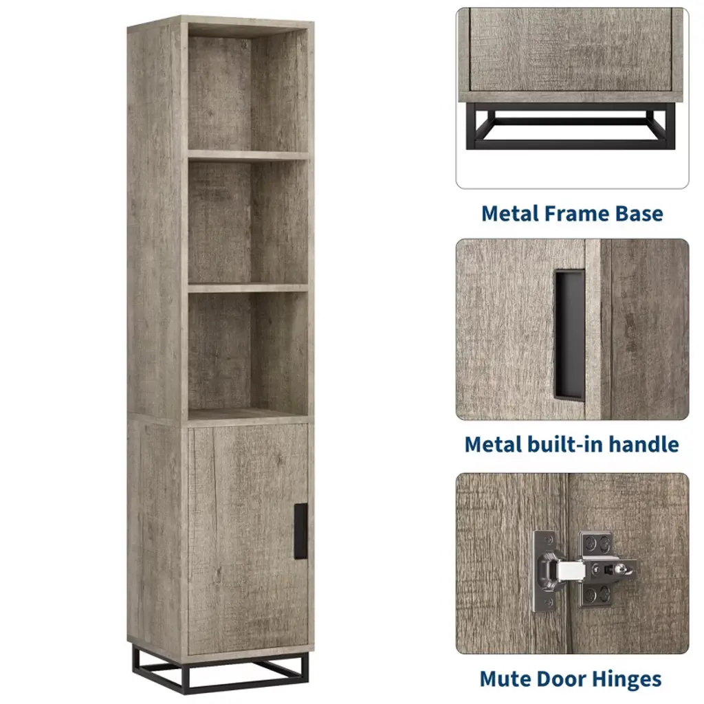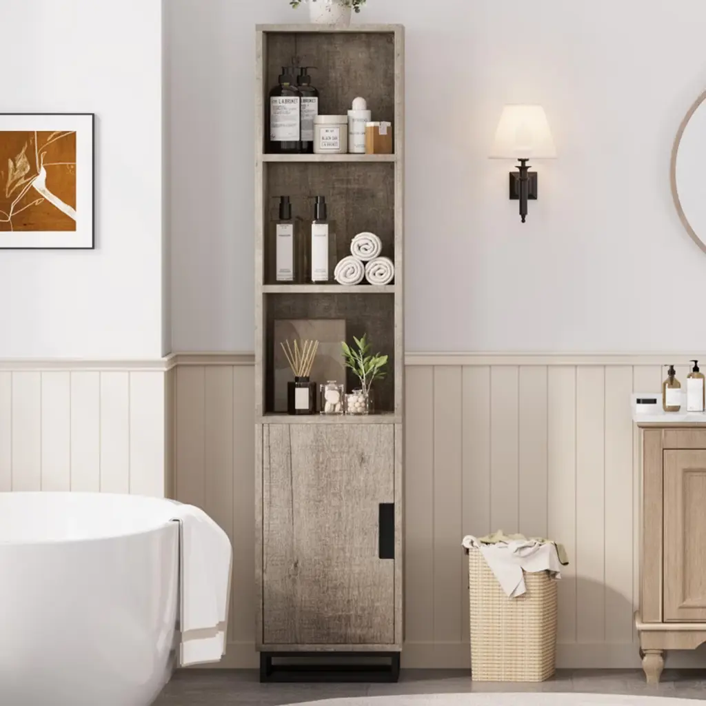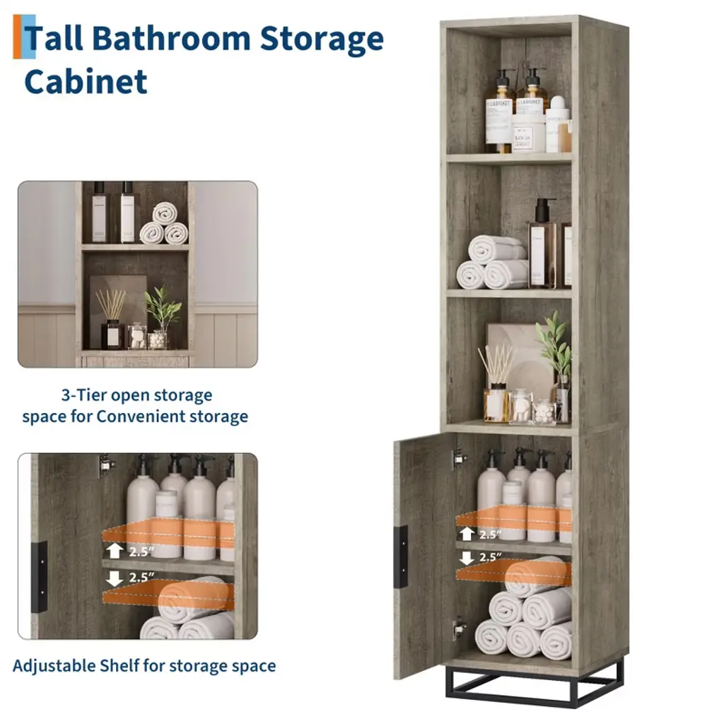 **Slim Storage Cabinet with Adjustable Shelves ¨C Space-Saving Organizer for Bathroom & Kitchen** ### **Premium Features** 1. **Smart Vertical Storage Design** - **70" height optimization** for vertical space utilization - **3-tier open shelving** + **1 enclosed compartment** - **Adjustable shelf** (6-position height customization) - **14.1" ultra-slim depth** fits tight spaces 2. **Multi-Environment Adaptability** - **Humidity-resistant engineered wood** (¡Ü85% RH) - **Reinforced metal base** (anti-wobble design) - **Dual-purpose configuration**: * Open shelving for daily essentials * Lockable cabinet for valuables 3. **Modern Farmhouse Aesthetic** - **Authentic wood grain finish** (scratch-resistant coating) - **Matte black hardware** (corrosion-resistant handles) - **Seamless integration**: * Urban apartments * Coastal homes * Rustic cottages 4. **Commercial-Grade Construction** - **CARB Phase 2 compliant** engineered wood - **2.5mm thick steel frame** - **Adjustable door hinges** (¡À3mm tolerance) - **150lb distributed load capacity** 5. **Tool-Free Assembly System** - **Pre-drilled components** (error-proof design) - **QR code video instructions** - **Modular panel construction** (30-min setup) - **Magnetic door alignment tool** included ### **Technical Specifications** - **Materials:** P2 particleboard + steel frame - **Finish:** E1 grade laminate (20+ color options) - **Door Swing:** 90¡ã hinge rotation - **Hardware:** Zinc-alloy handles & hinges - **Certifications:** ASTM F2057 safety standard **Complete Package Includes:** - 1 cabinet frame - 3 adjustable shelves - 1 removable back panel - All necessary hardware - 5-year hardware warranty **Professional Organization Tips:** ? Use enclosed section for medications/chemicals ? Install rubber bumpers for silent closing ? Apply furniture wax annually ? Maximum 25lb/shelf for dynamic loads