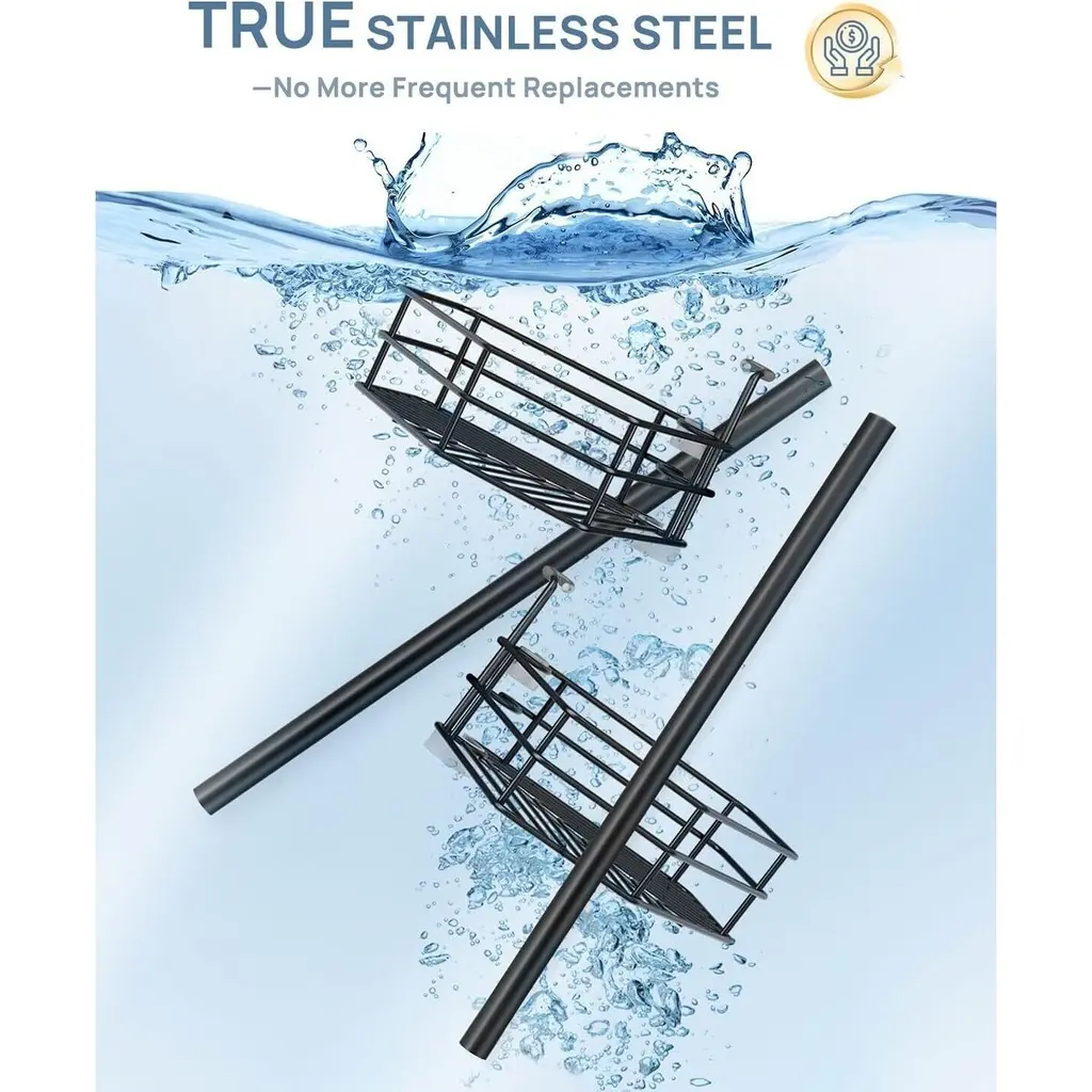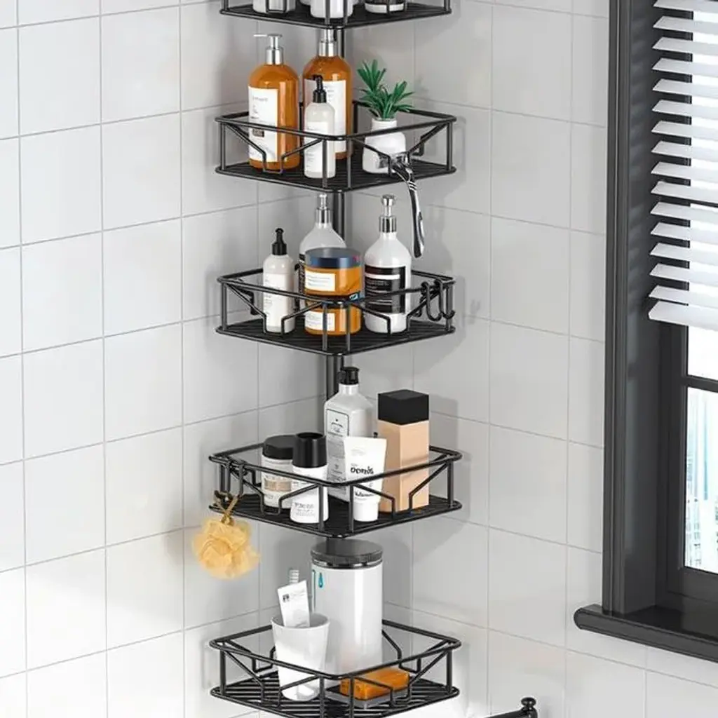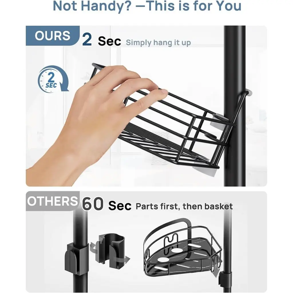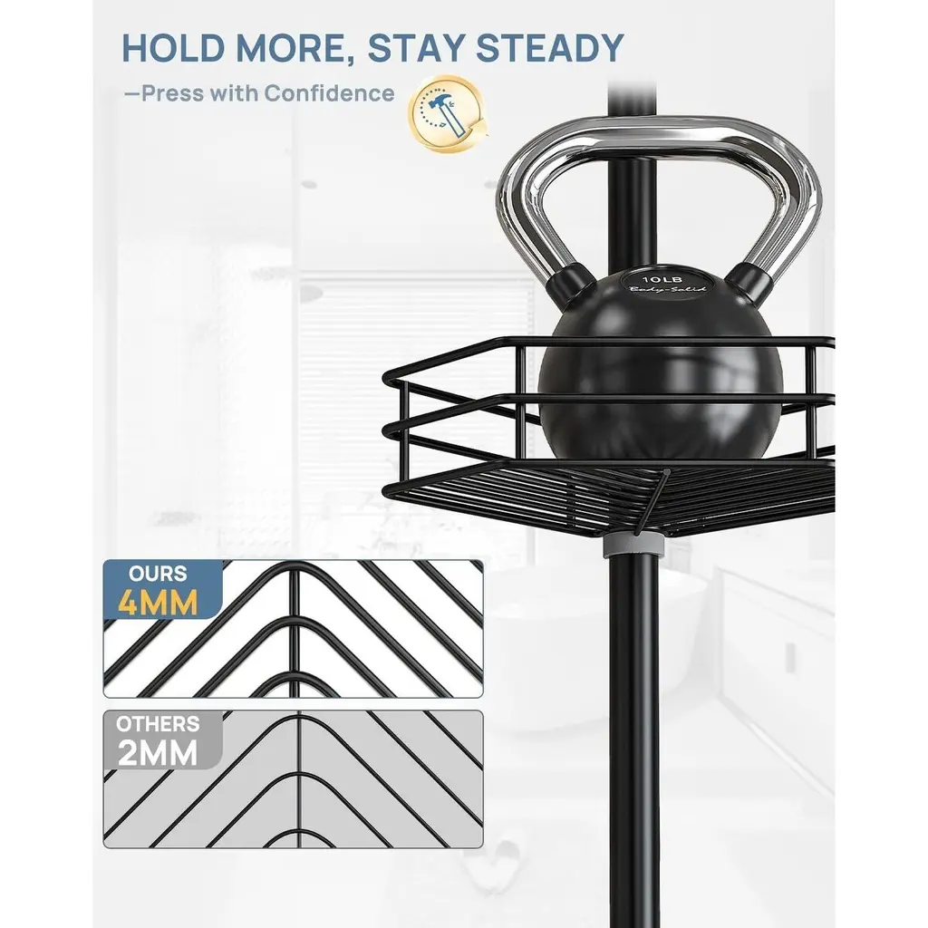 Corner Shower Caddy Tension Pole, Quick Setup, Rust-Free Bathroom Shower Organizer Corner for Bathtub Shampoo Storage, 4-Tier Adjustable Shelf, Drill Free, Fits 39 to 113 Inch HeightNumber of Shelves: 4Style:ContemporaryAssembly Required:YesFinish Type:Powder CoatedSpecial Feature:Adjusted, Rust ResistantProduct Dimensions:6.2"D x 10.5"W x 113"HProduct Care Instructions:Wipe with Dry ClothRecommended Uses For Product:Bathroom, DormIncluded Components:Poles, Baskets, End CapInstallation Type:Tension MountRustProof Material - All poles and shelves are fully made of stainless steel, which made it durable and withstand rustproof for years. It can be installed in bathroom, shower room, college dorm, toilet and beside vanity.Special Design - 4 large shelves & 3 kinds removable accessories include 1 Toothbrush Holder & 2 Hooks & 1 towel bar】- Include 4 Wire storage baskets, it is an Ideal for contain bath supplies like shampoo, soap, conditioner, body wash. And 1 small removable basket can storage toothbrush, toothpaste and other small accessories. And 2 Removable hooks for razor and sponge.THE MOST EASY TO INSTALL - Different than the normal shower shelf on the market, you just need to hang the 4 baskets on the pole and adjusted up and down freely, fitting any height of shower bottles. Super convenient for you to install and adjust its position anytime.(Note: This shower caddy set is not designed for sloped ceilings.)Fully Adjustable to Fit Your Shower - The shower racks for inside shower comes with 8 poles for you to adjust the height, no need to bother you to cut the rod, you can place this corner shower shelf on any height as described within 39.2 to 113 inch.