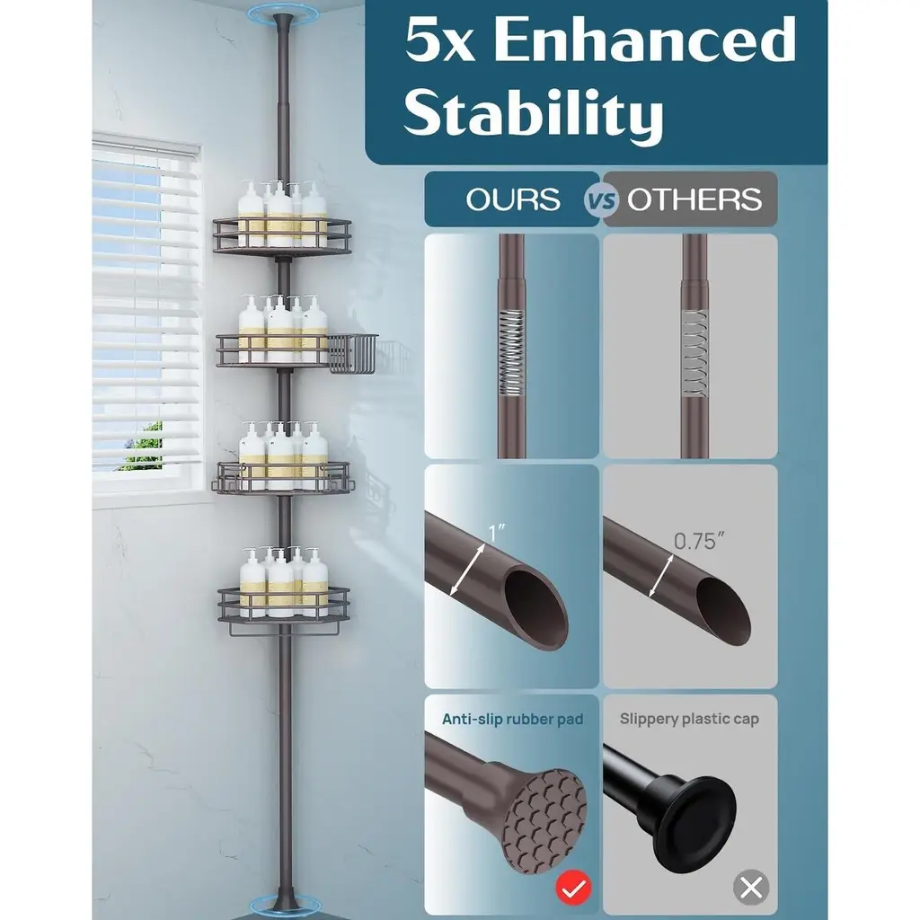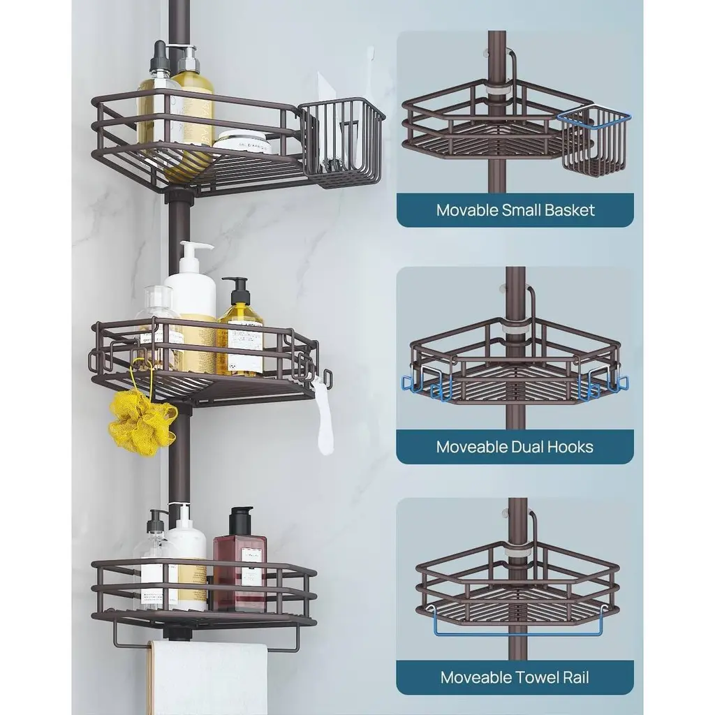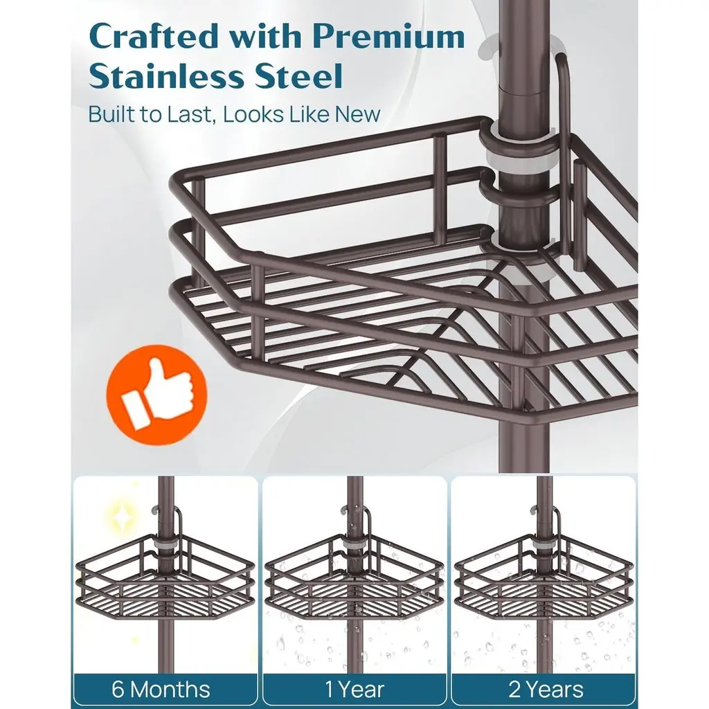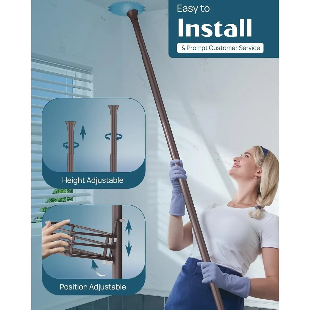 Corner Shower Caddy Tension Pole, Quick Setup, Rust-Free Bathroom Shower Organizer Corner for Bathtub Shampoo Storage, 4-Tier Adjustable Shelf, Drill Free, Fits 39 to 113 Inch HeightNumber of Shelves: 4Style:ContemporaryAssembly Required:YesFinish Type:Powder CoatedSpecial Feature:Adjusted, Rust ResistantProduct Dimensions:6.2"D x 10.5"W x 113"HProduct Care Instructions:Wipe with Dry ClothRecommended Uses For Product:Bathroom, DormIncluded Components:Poles, Baskets, End CapInstallation Type:Tension MountRustProof Material - All poles and shelves are fully made of stainless steel, which made it durable and withstand rustproof for years. It can be installed in bathroom, shower room, college dorm, toilet and beside vanity.Special Design - 4 large shelves & 3 kinds removable accessories include 1 Toothbrush Holder & 2 Hooks & 1 towel bar】- Include 4 Wire storage baskets, it is an Ideal for contain bath supplies like shampoo, soap, conditioner, body wash. And 1 small removable basket can storage toothbrush, toothpaste and other small accessories. And 2 Removable hooks for razor and sponge.THE MOST EASY TO INSTALL - Different than the normal shower shelf on the market, you just need to hang the 4 baskets on the pole and adjusted up and down freely, fitting any height of shower bottles. Super convenient for you to install and adjust its position anytime.(Note: This shower caddy set is not designed for sloped ceilings.)Fully Adjustable to Fit Your Shower - The shower racks for inside shower comes with 8 poles for you to adjust the height, no need to bother you to cut the rod, you can place this corner shower shelf on any height as described within 39.2 to 113 inch.