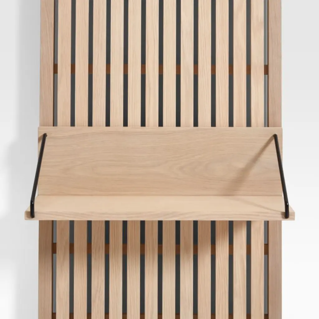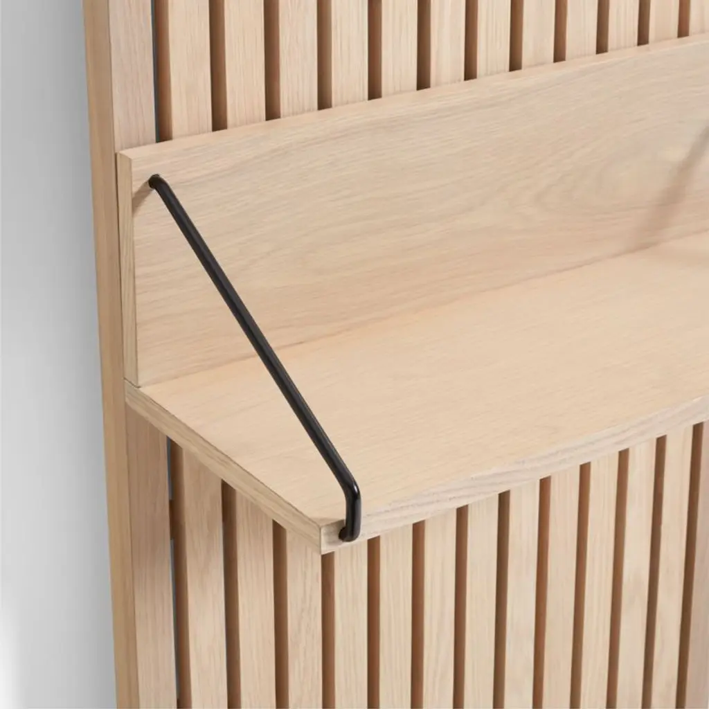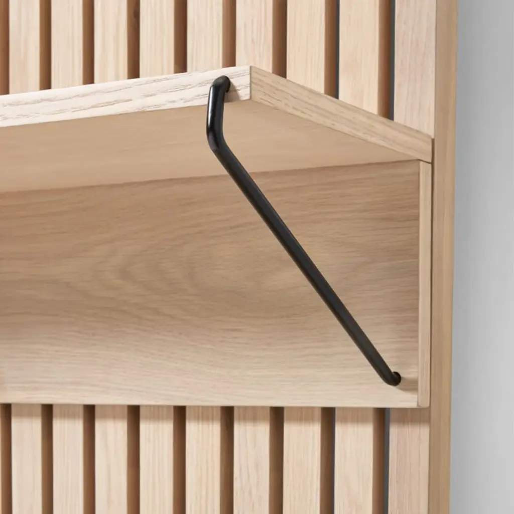 Designed to coordinate with the wall-mounted Batten modular storage system, this wall shelf features the same white oak finish, slatted detailing and black iron accents. Mounted on the Batten back panel (sold separately), the reversible shelf can be hung with brackets on top or underneath the shelf to give you lots of storage options for pantry, entryway or office. Try it brackets-up above the Batten desk as a handy way to secure books, or brackets-down above the Batten storage bench for easy-access to hats and bags. A great option for apartment living, Batten is designed for us exclusively by Bill Eastburn of William Eastburn Design.