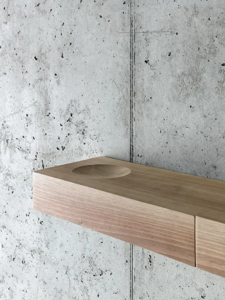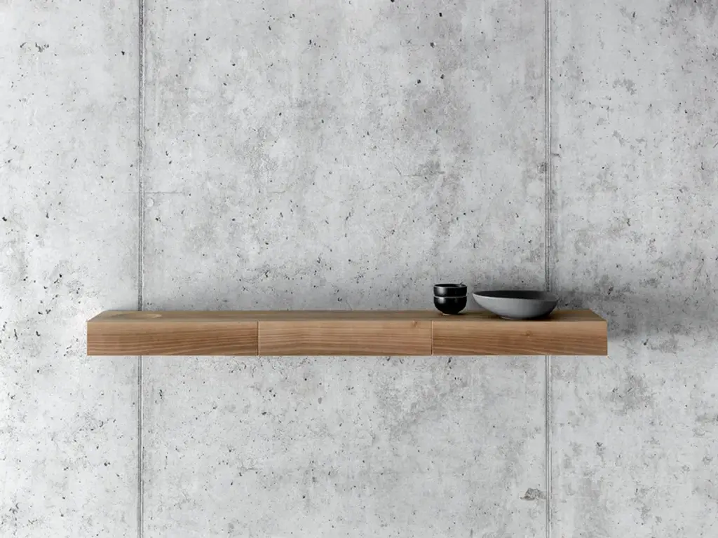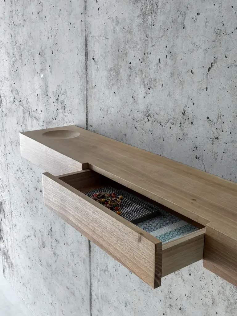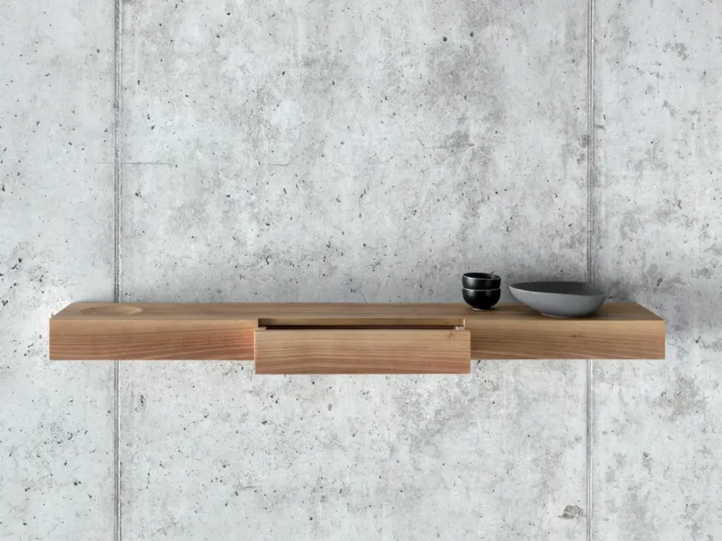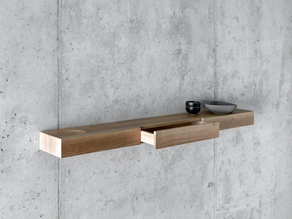 Bàuti - Shelf in solid walnut provided with drawers and a circular groove as coin tray. In two dimensions. A linear shape, versatile and freely adaptable in its placement. An item with refined proportions. Finishes: solid walnut.