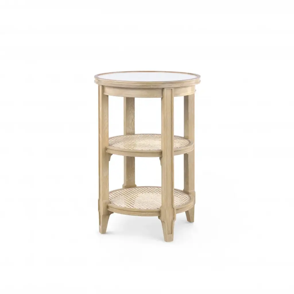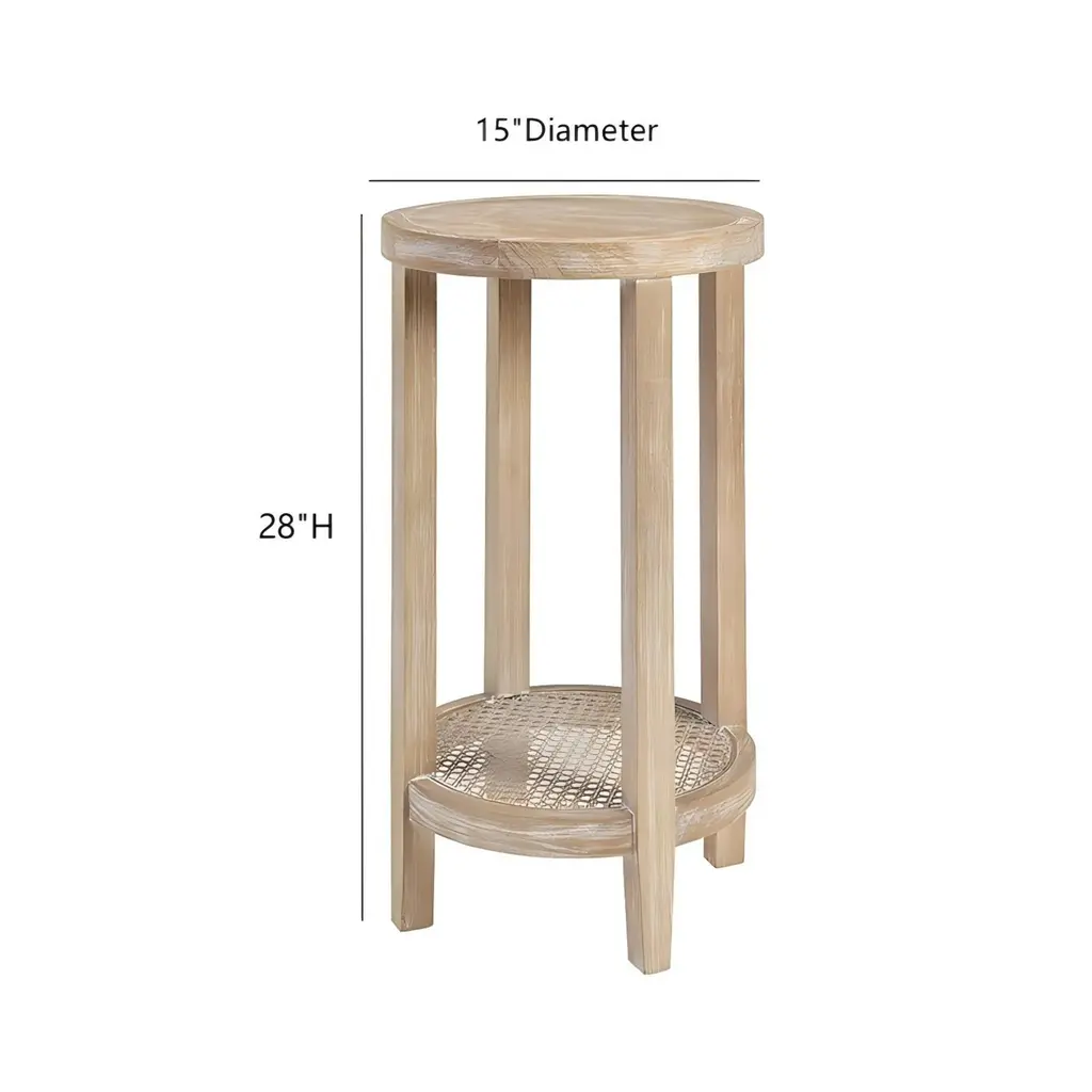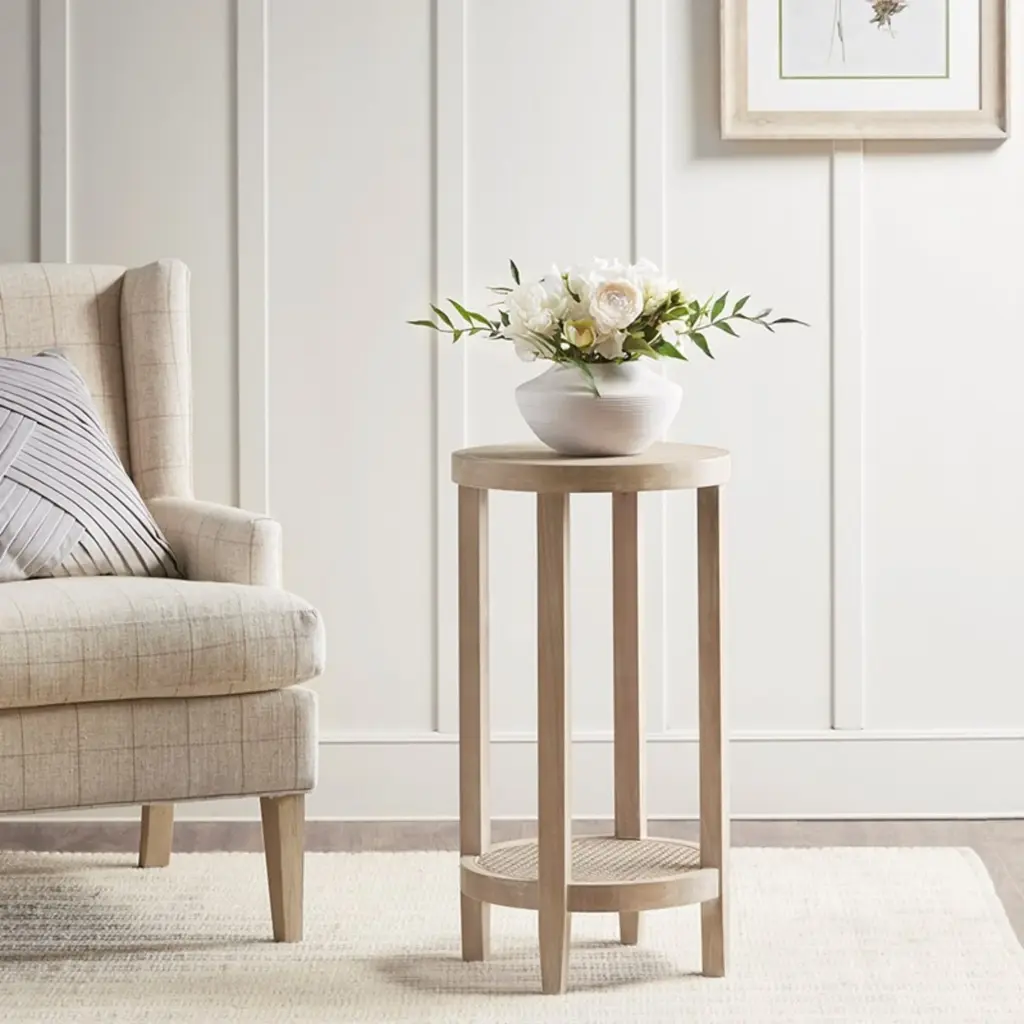 Created exclusively for the Martha Stewart Bedford furniture collection that embodies country farmhouse living, the Harley Accent Table provides a simple and charming addition to your home décor. This round accent table features Ash veneer table top and lower rattan cane shelf creating a unique design. The diameter of this table is 15 inches and the height is 28 inches. A reclaimed wheat finish on the wood frame and legs gives this accent table a natural allure that complements most decors. This functional and practical lifestyle is evidenced in her thoughtfully appointed decor which embraces a neutral color palette that acts as a perfect backdrop to four seasons of color. Assembly required.